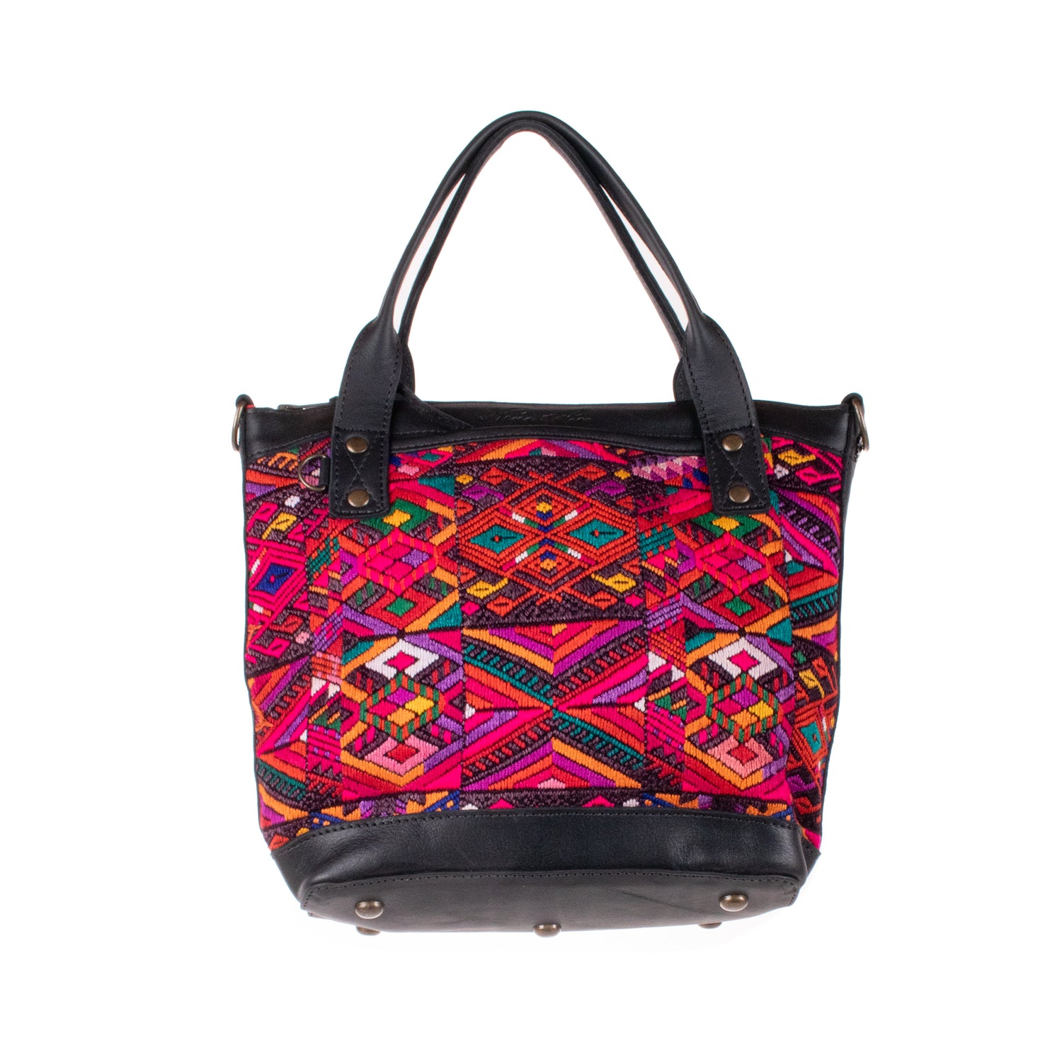 Many unique Maya symbols can be found in our One of a Kind Collection. The fabric we use for this collection is made from upcycled vintage huipiles (traditional attire worn by women in Guatemala) that were handwoven by Artisans up to 10 years ago, and they have lived a full life before being incorporated into your leather bag!