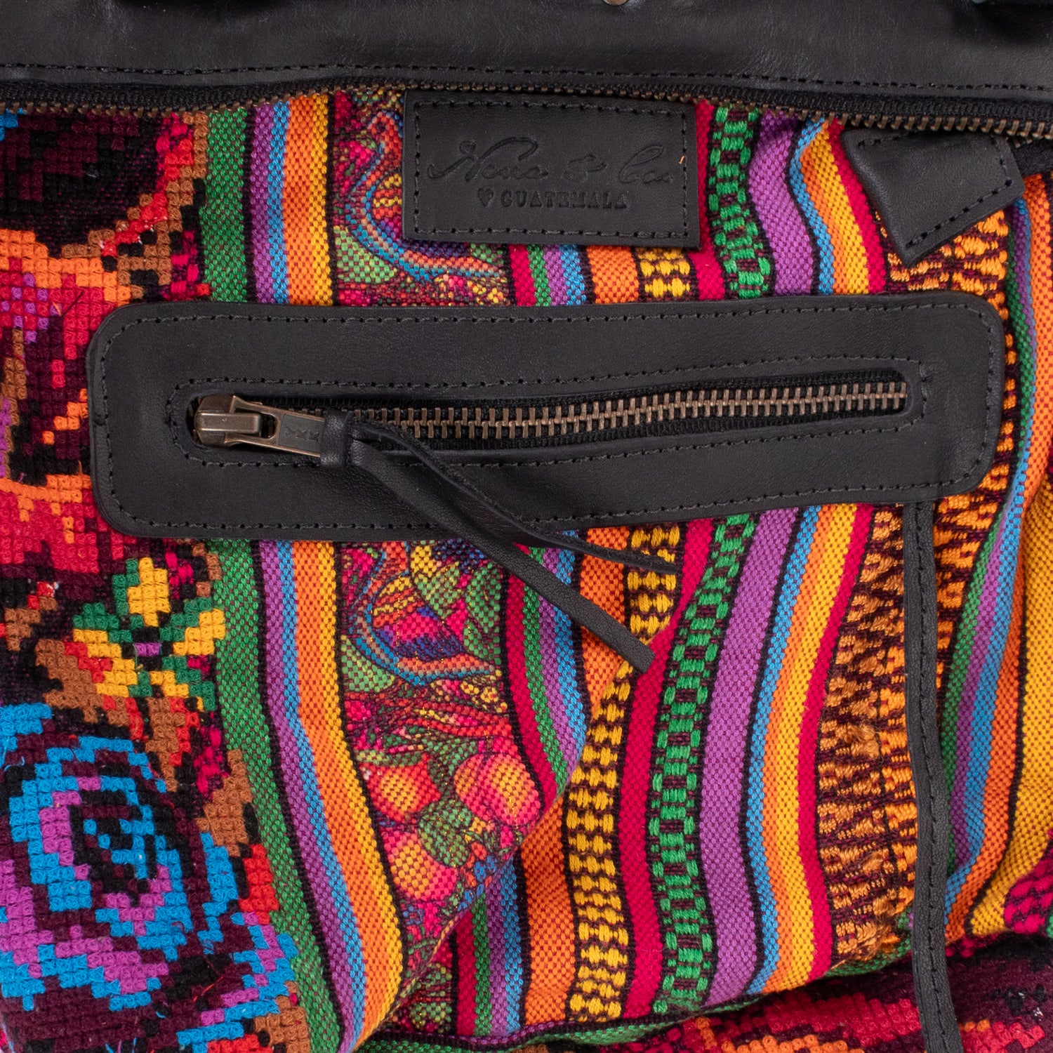 Many unique Maya symbols can be found in our One of a Kind Collection. The fabric we use for this collection is made from upcycled vintage huipiles (traditional attire worn by women in Guatemala) that were handwoven by Artisans up to 10 years ago, and they have lived a full life before being incorporated into your leather bag!