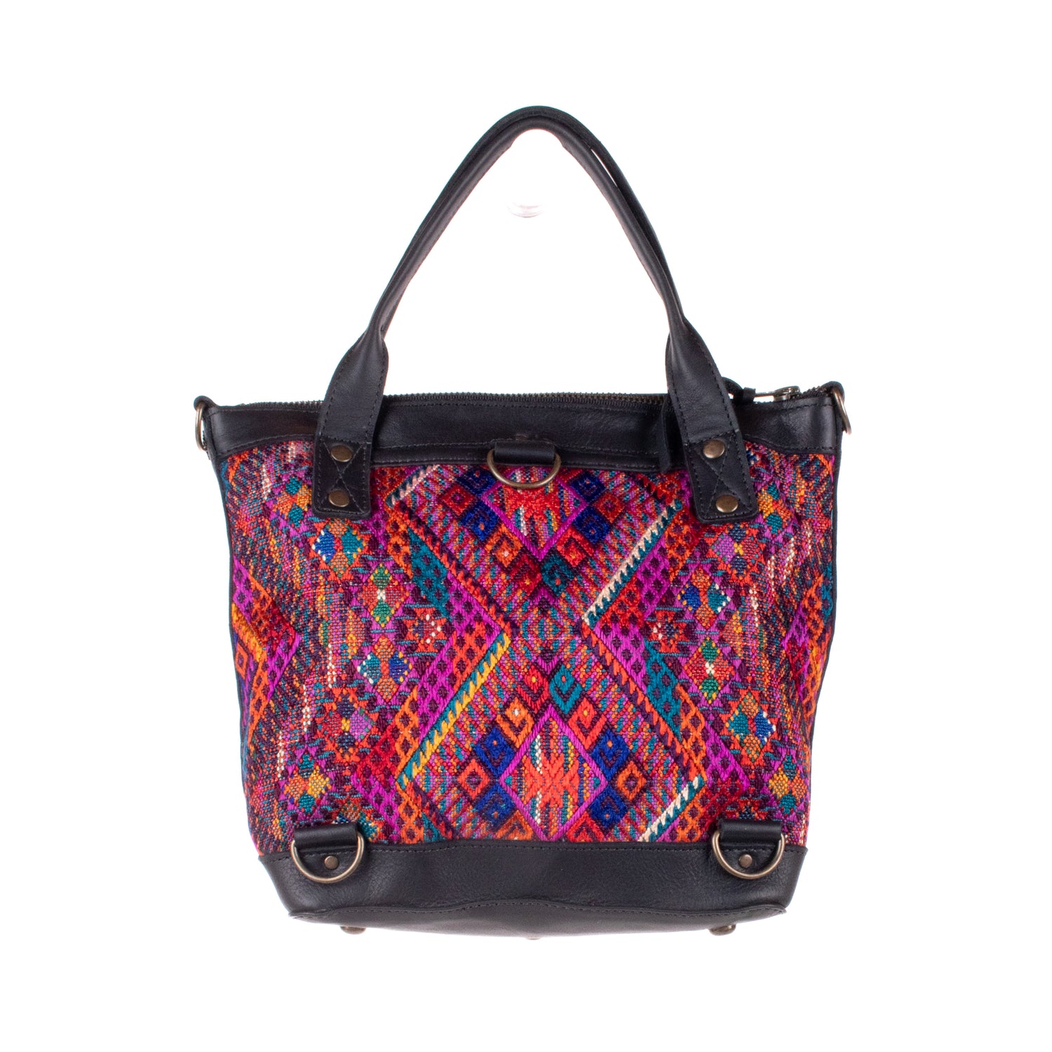 Many unique Maya symbols can be found in our One of a Kind Collection. The fabric we use for this collection is made from upcycled vintage huipiles (traditional attire worn by women in Guatemala) that were handwoven by Artisans up to 10 years ago, and they have lived a full life before being incorporated into your leather bag!