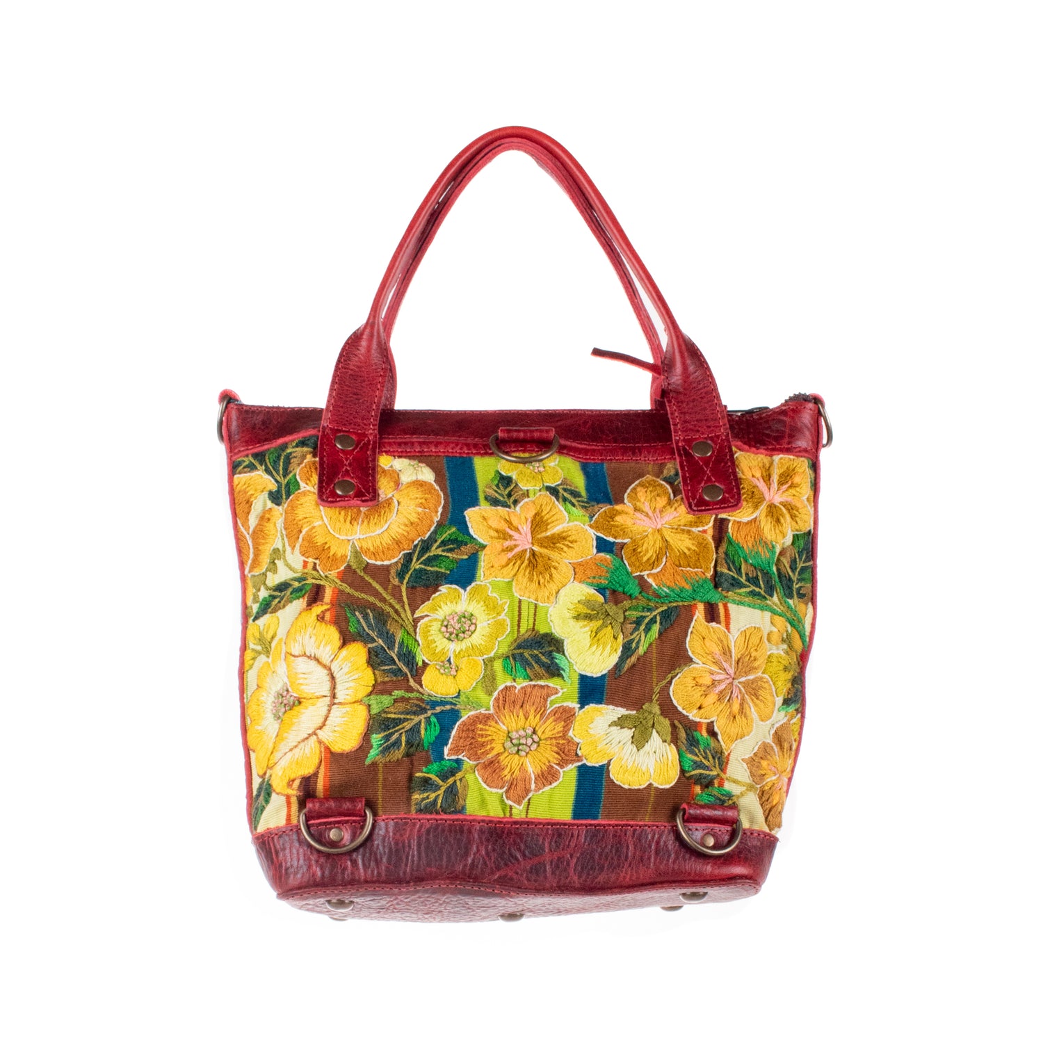 Many unique Maya symbols can be found in our One of a Kind Collection. The fabric we use for this collection is made from upcycled vintage huipiles (traditional attire worn by women in Guatemala) that were handwoven by Artisans up to 10 years ago, and they have lived a full life before being incorporated into your leather bag!