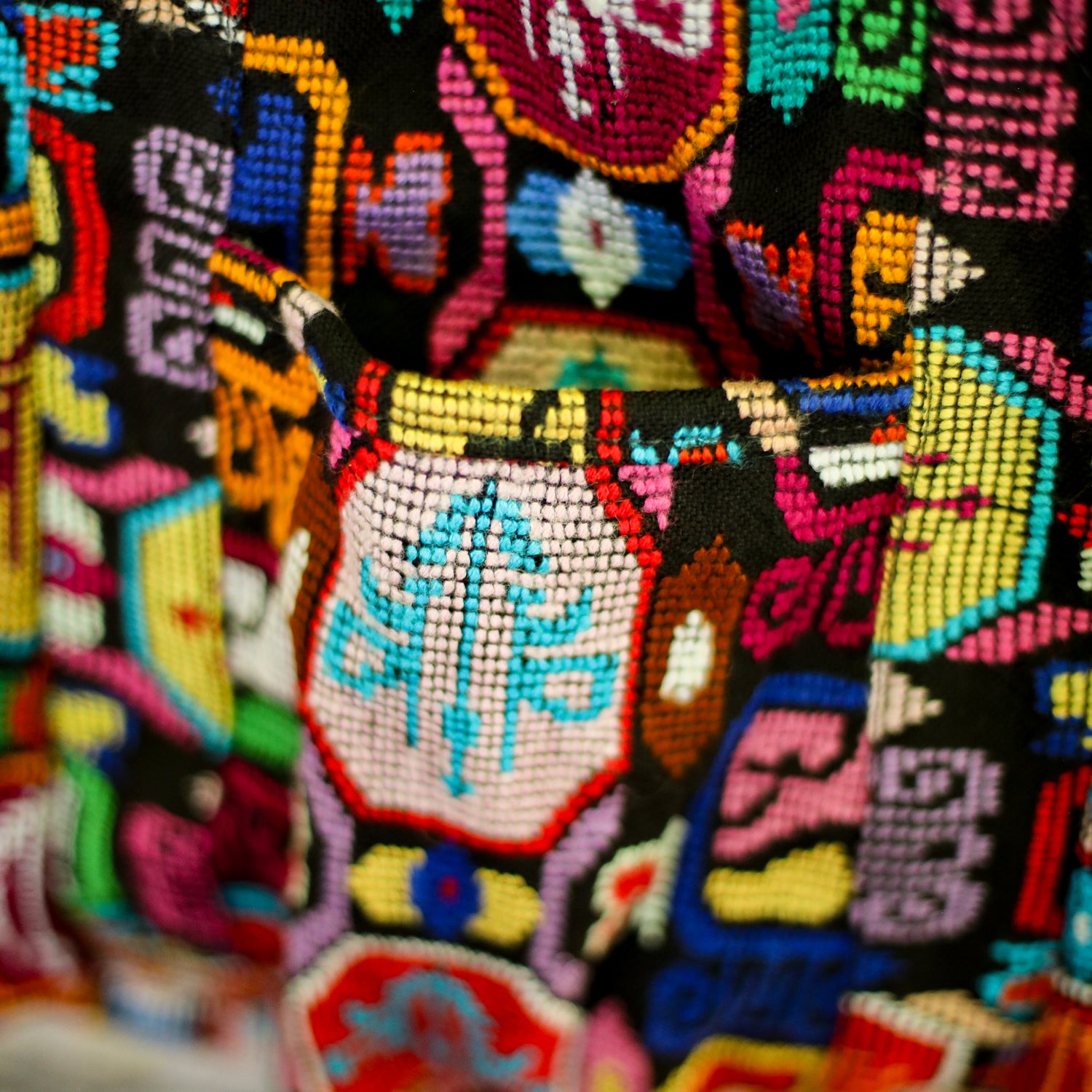 Many unique Maya symbols can be found in our One of a Kind Collection. The fabric we use for this collection is made from upcycled vintage huipiles (traditional attire worn by women in Guatemala) that were handwoven by Artisans up to 10 years ago, and they have lived a full life before being incorporated into your leather bag!