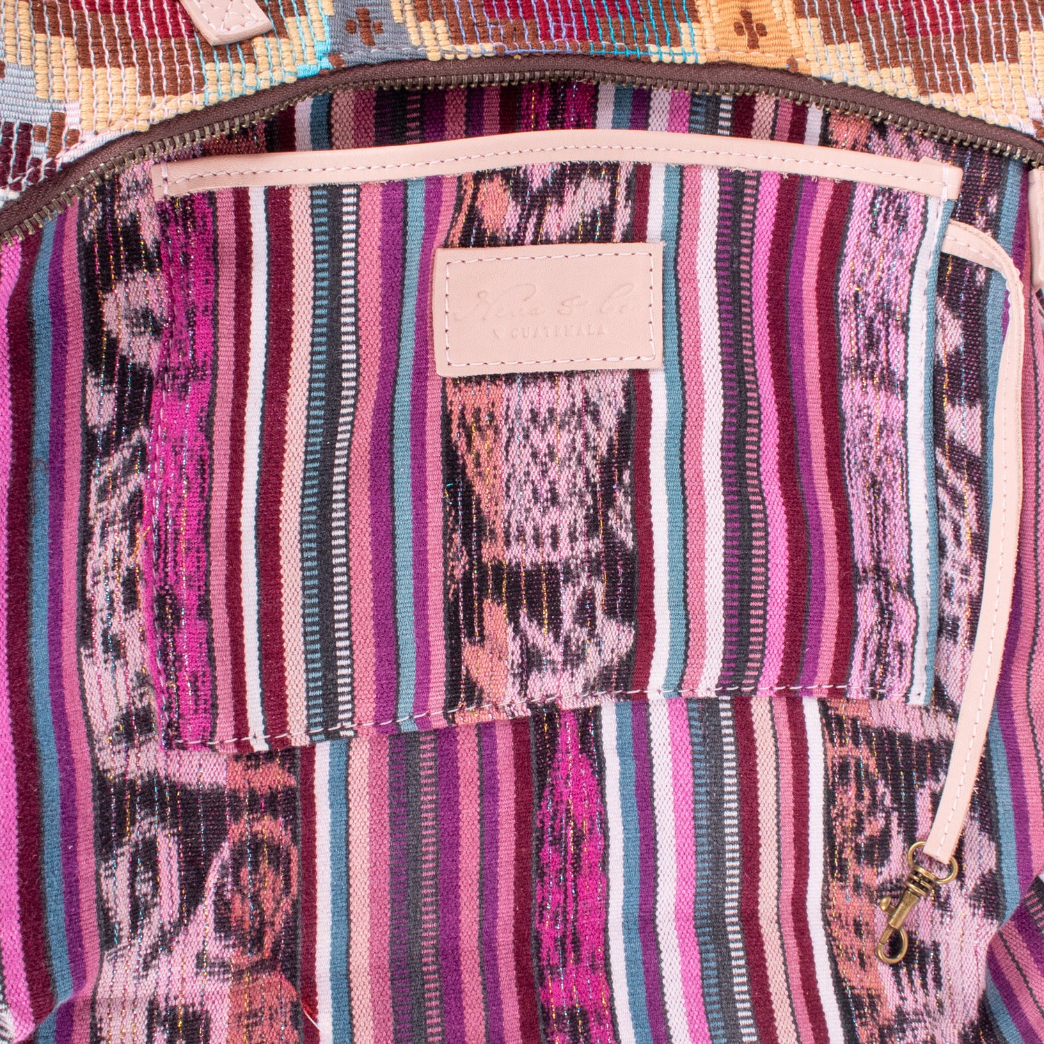 Many unique Maya symbols can be found in our One of a Kind Collection. The fabric we use for this collection is made from upcycled vintage huipiles (traditional attire worn by women in Guatemala) that were handwoven by Artisans up to 10 years ago, and they have lived a full life before being incorporated into your leather bag!