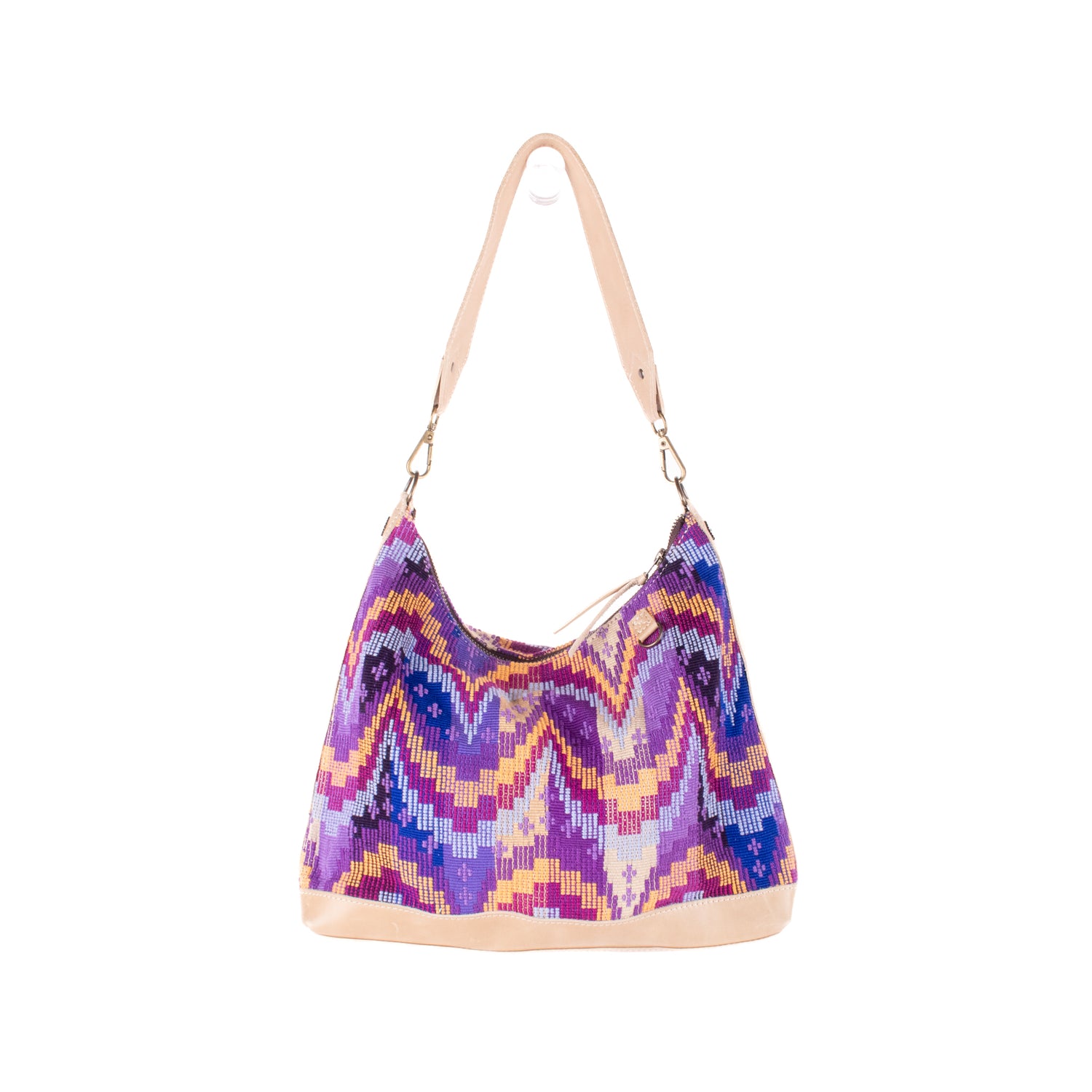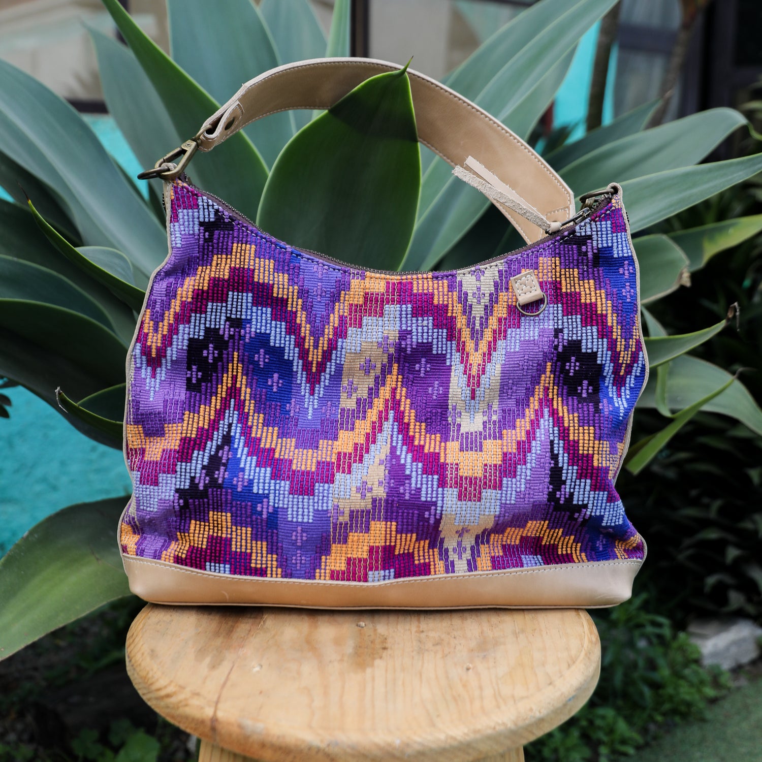 Many unique Maya symbols can be found in our One of a Kind Collection. The fabric we use for this collection is made from upcycled vintage huipiles (traditional attire worn by women in Guatemala) that were handwoven by Artisans up to 10 years ago, and they have lived a full life before being incorporated into your leather bag!