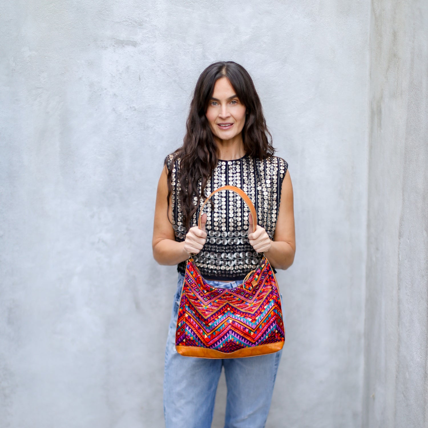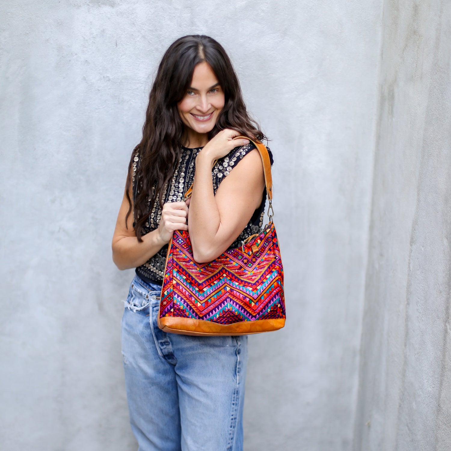 Many unique Maya symbols can be found in our One of a Kind Collection. The fabric we use for this collection is made from upcycled vintage huipiles (traditional attire worn by women in Guatemala) that were handwoven by Artisans up to 10 years ago, and they have lived a full life before being incorporated into your leather bag!