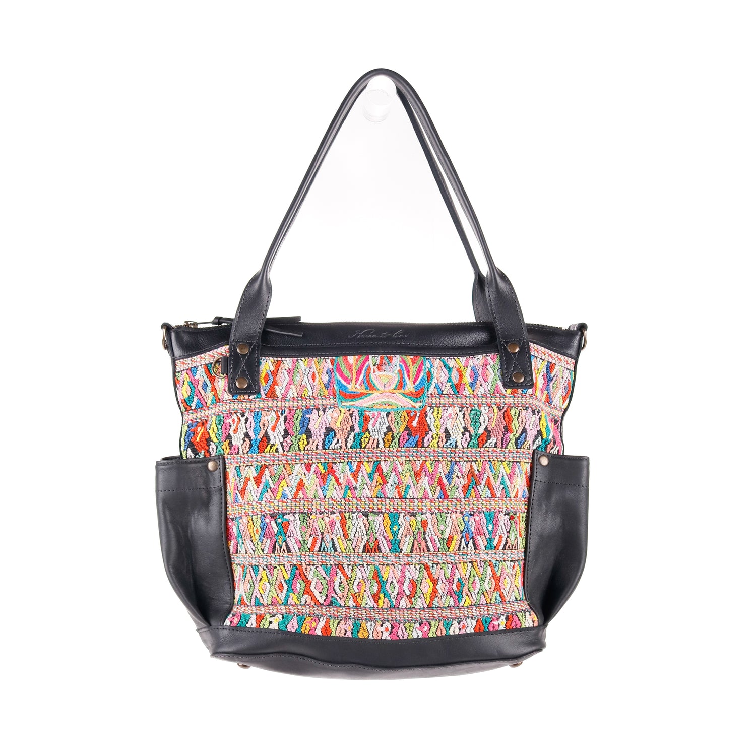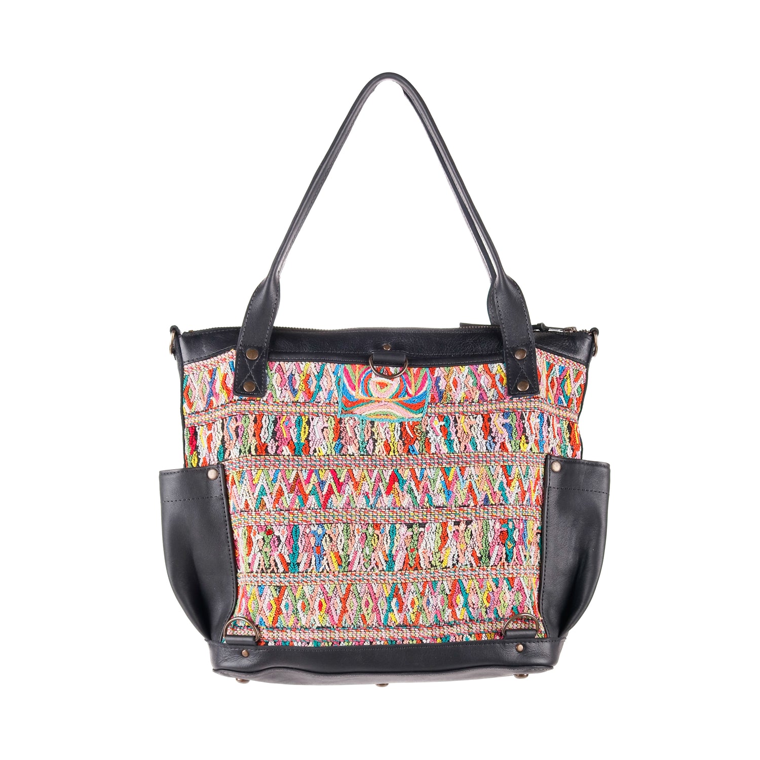 Many unique Maya symbols can be found in our One of a Kind Collection. The fabric we use for this collection is made from upcycled vintage huipiles (traditional attire worn by women in Guatemala) that were handwoven by Artisans up to 10 years ago, and they have lived a full life before being incorporated into your leather bag!