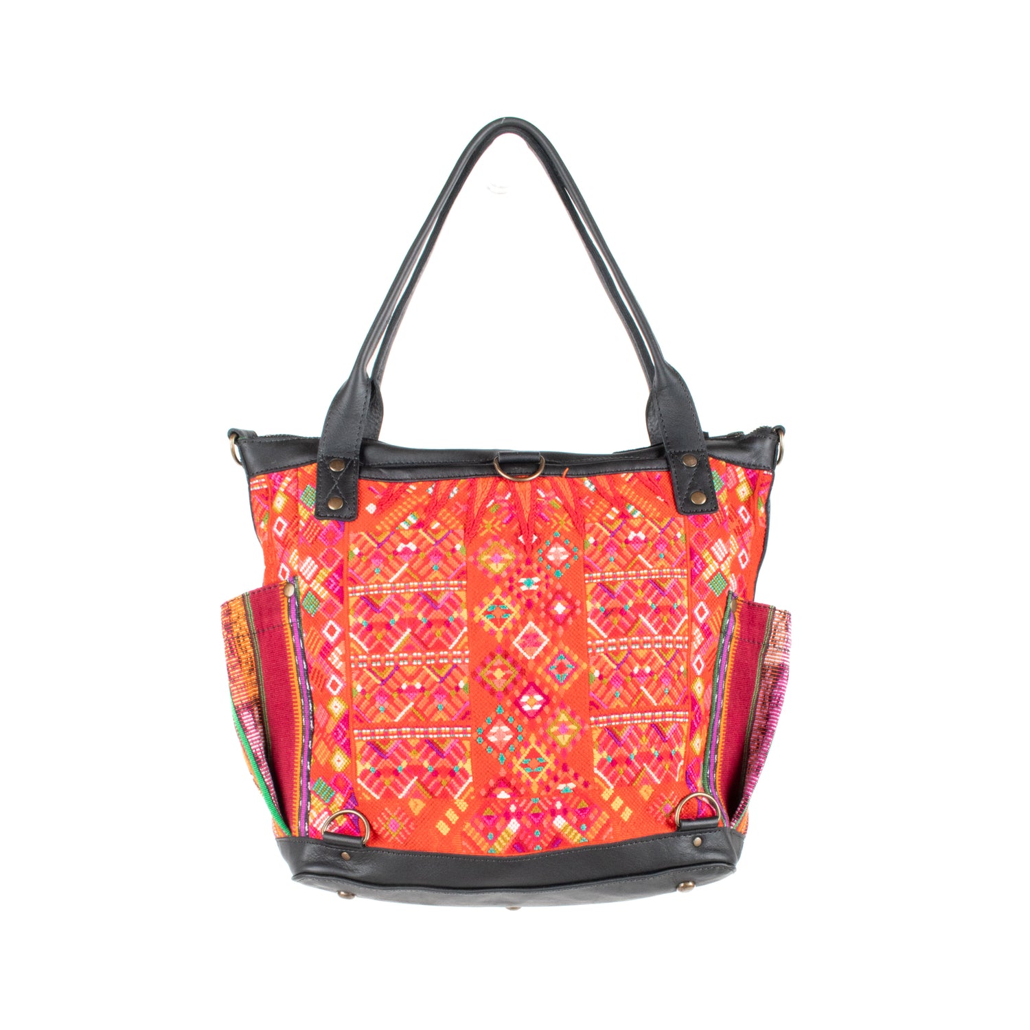 Many unique Maya symbols can be found in our One of a Kind Collection. The fabric we use for this collection is made from upcycled vintage huipiles (traditional attire worn by women in Guatemala) that were handwoven by Artisans up to 10 years ago, and they have lived a full life before being incorporated into your leather bag!