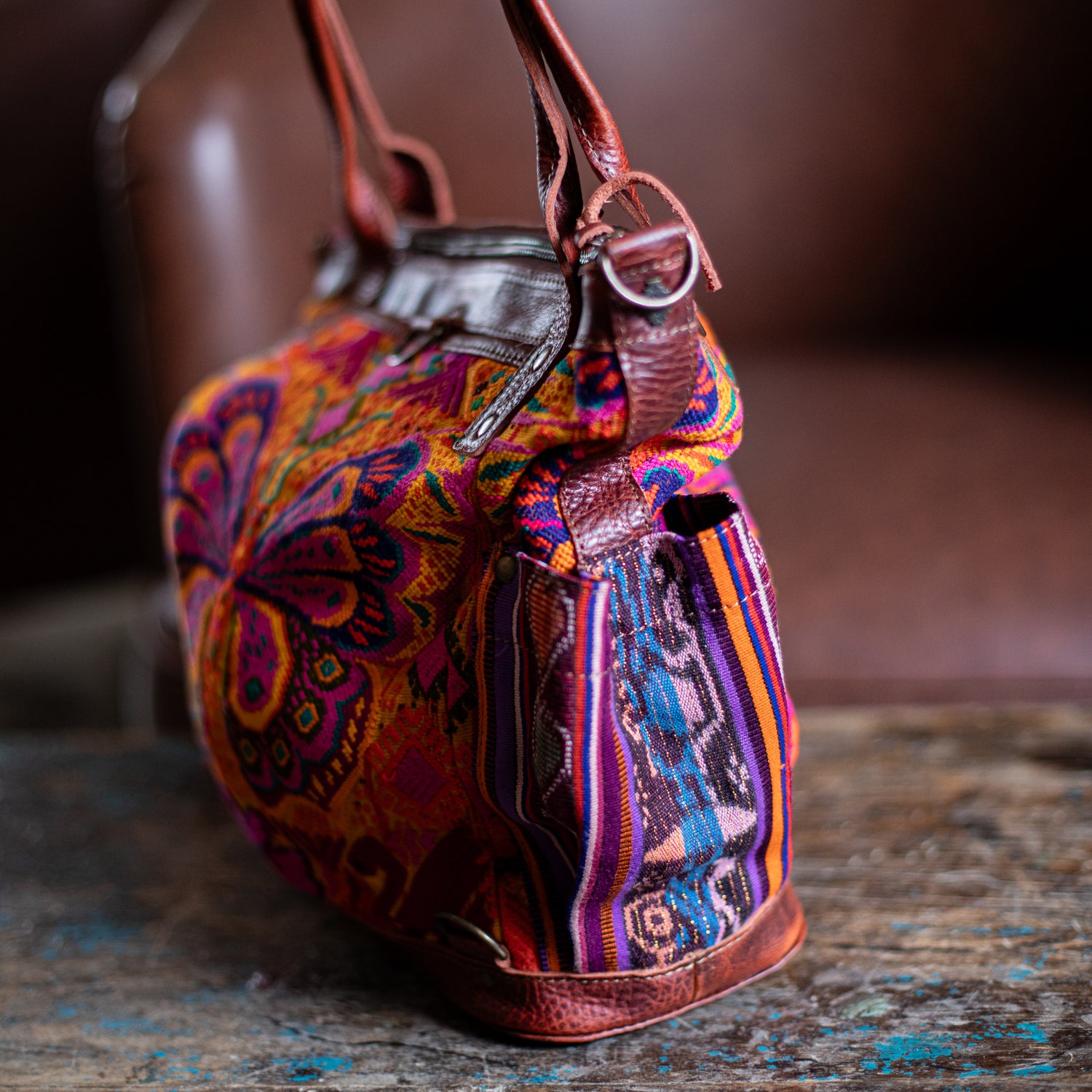 Many unique Maya symbols can be found in our One of a Kind Collection. The fabric we use for this collection is made from upcycled vintage huipiles (traditional attire worn by women in Guatemala) that were handwoven by Artisans up to 10 years ago, and they have lived a full life before being incorporated into your leather bag!