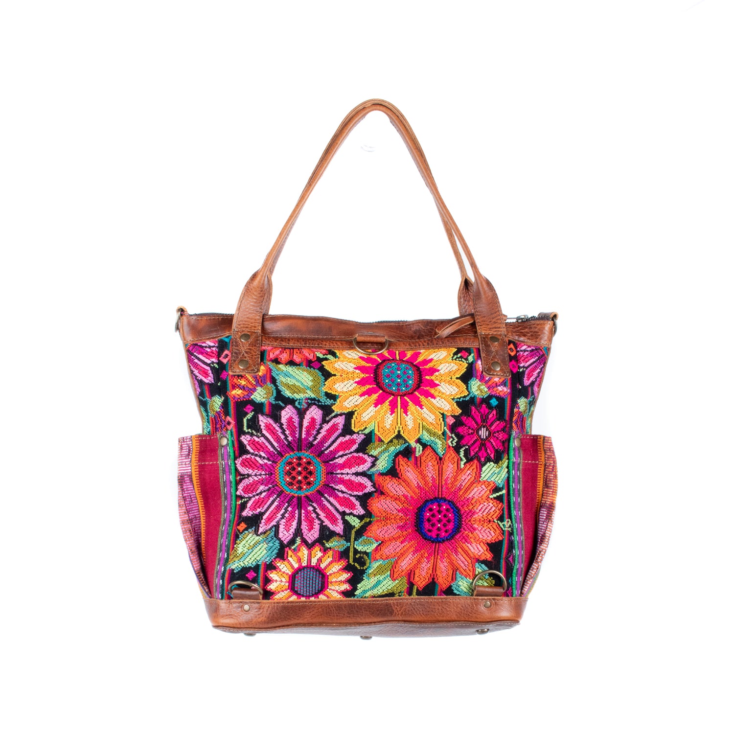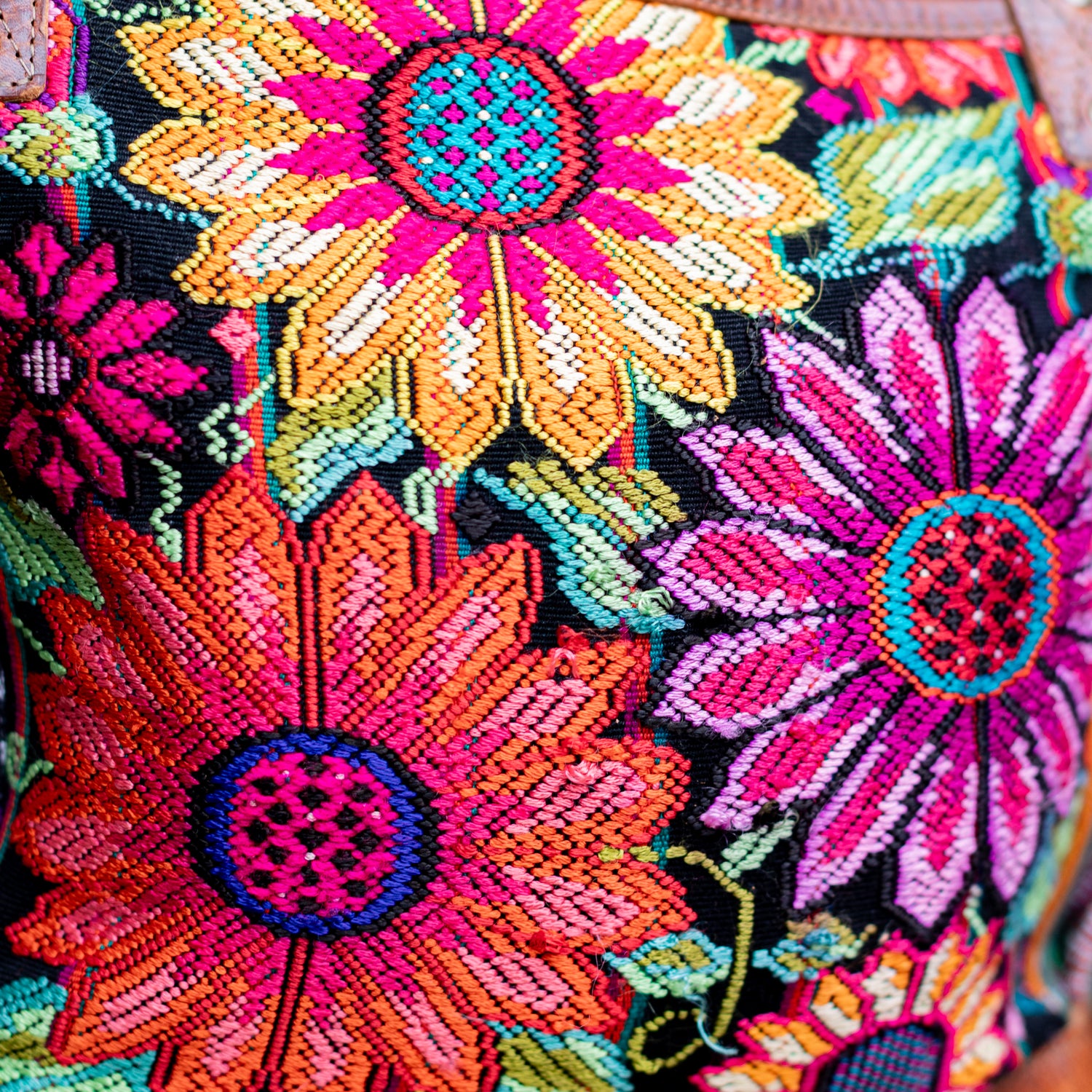 Many unique Maya symbols can be found in our One of a Kind Collection. The fabric we use for this collection is made from upcycled vintage huipiles (traditional attire worn by women in Guatemala) that were handwoven by Artisans up to 10 years ago, and they have lived a full life before being incorporated into your leather bag!