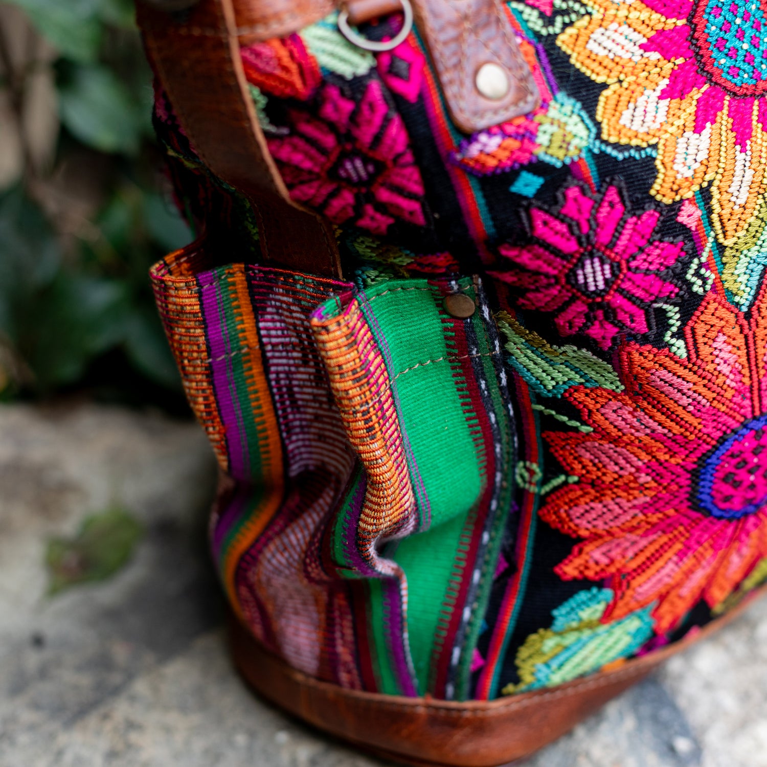We make every effort to provide our customers with the best-handcrafted and high-quality bags. Please note that all our processes to make the bags are done by hand, from curing, cutting, and treating the leather to using up-cycled huipils. Our bags have natural characteristics and qualities that should not be considered as flaws or as damage because they do not interfere with the functionality of the bag. We up-cycle vintage Maya clothing to make beautiful one-of-a-kind products. Many times you will find snags in the pattern. This is normal. Should your patterned huipil snag you can snip the loose threads with scissors. Do not pull them.