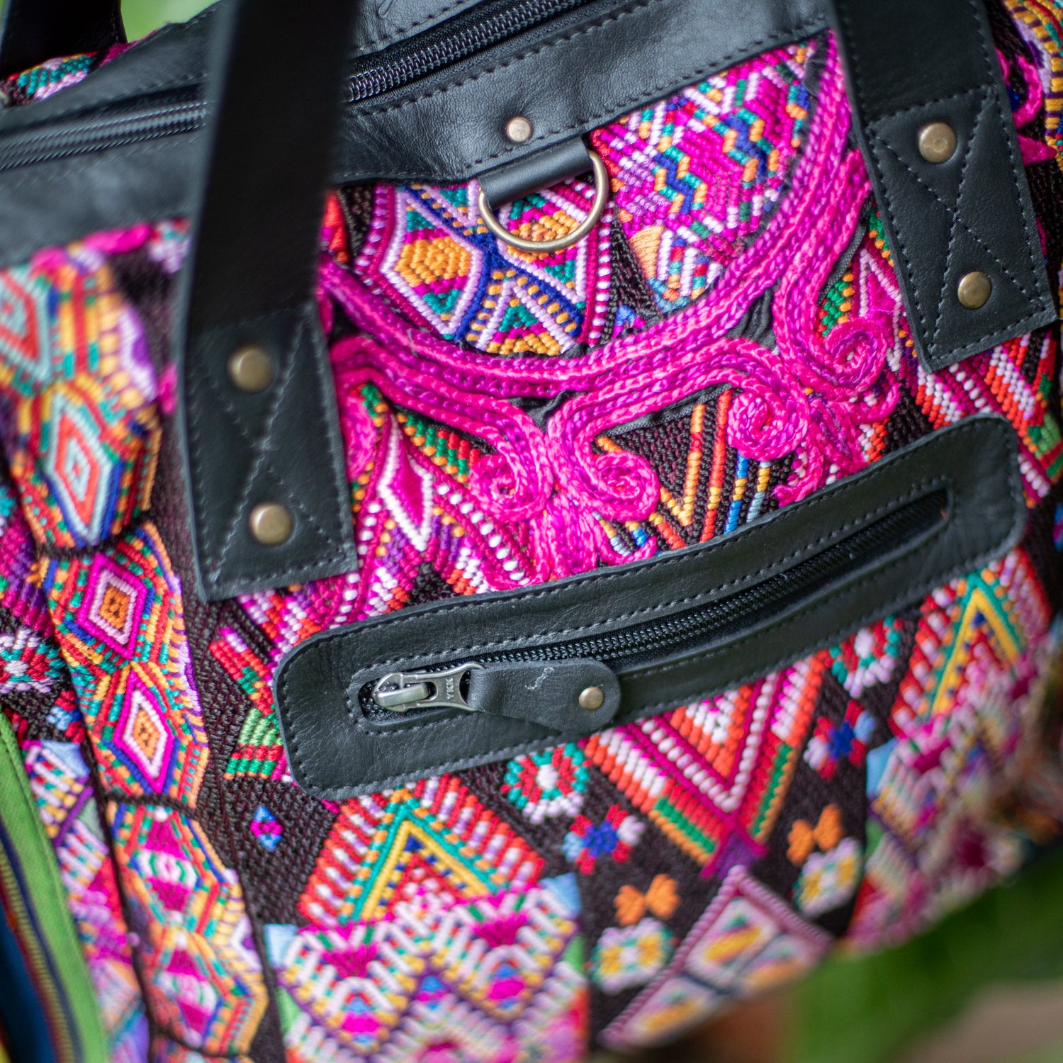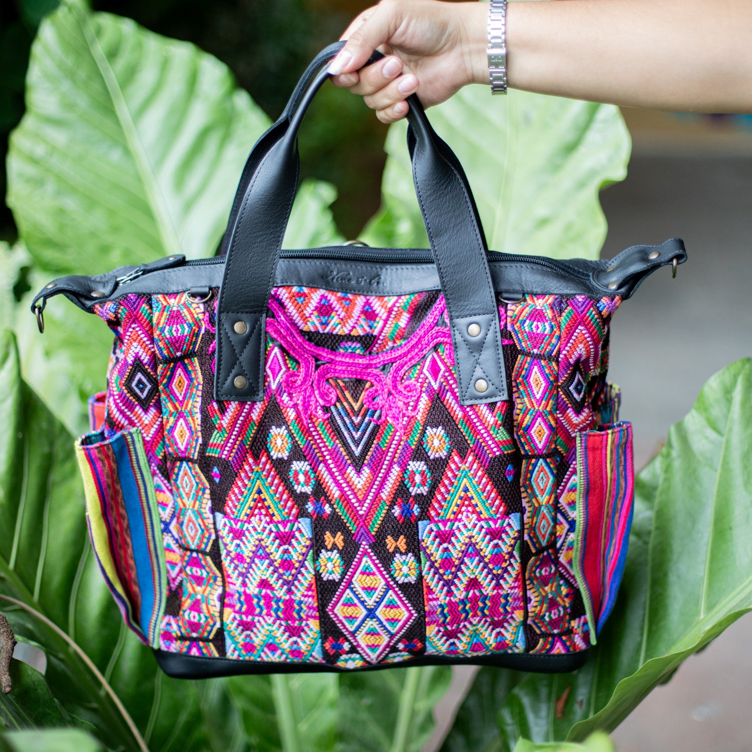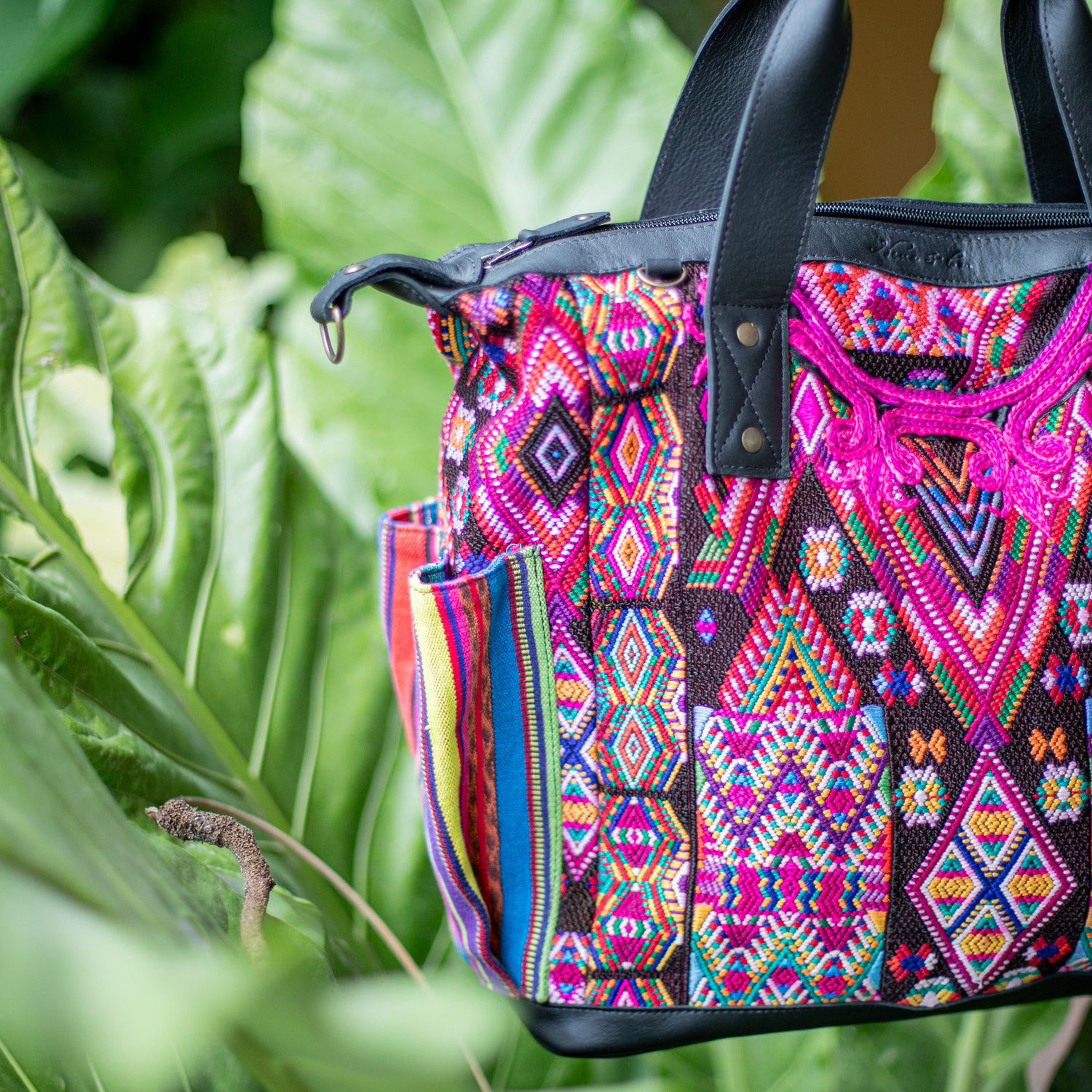 Many unique Maya symbols can be found in our One of a Kind Collection. The fabric we use for this collection is made from upcycled vintage huipiles (traditional attire worn by women in Guatemala) that were handwoven by Artisans up to 10 years ago, and they have lived a full life before being incorporated into your leather bag!