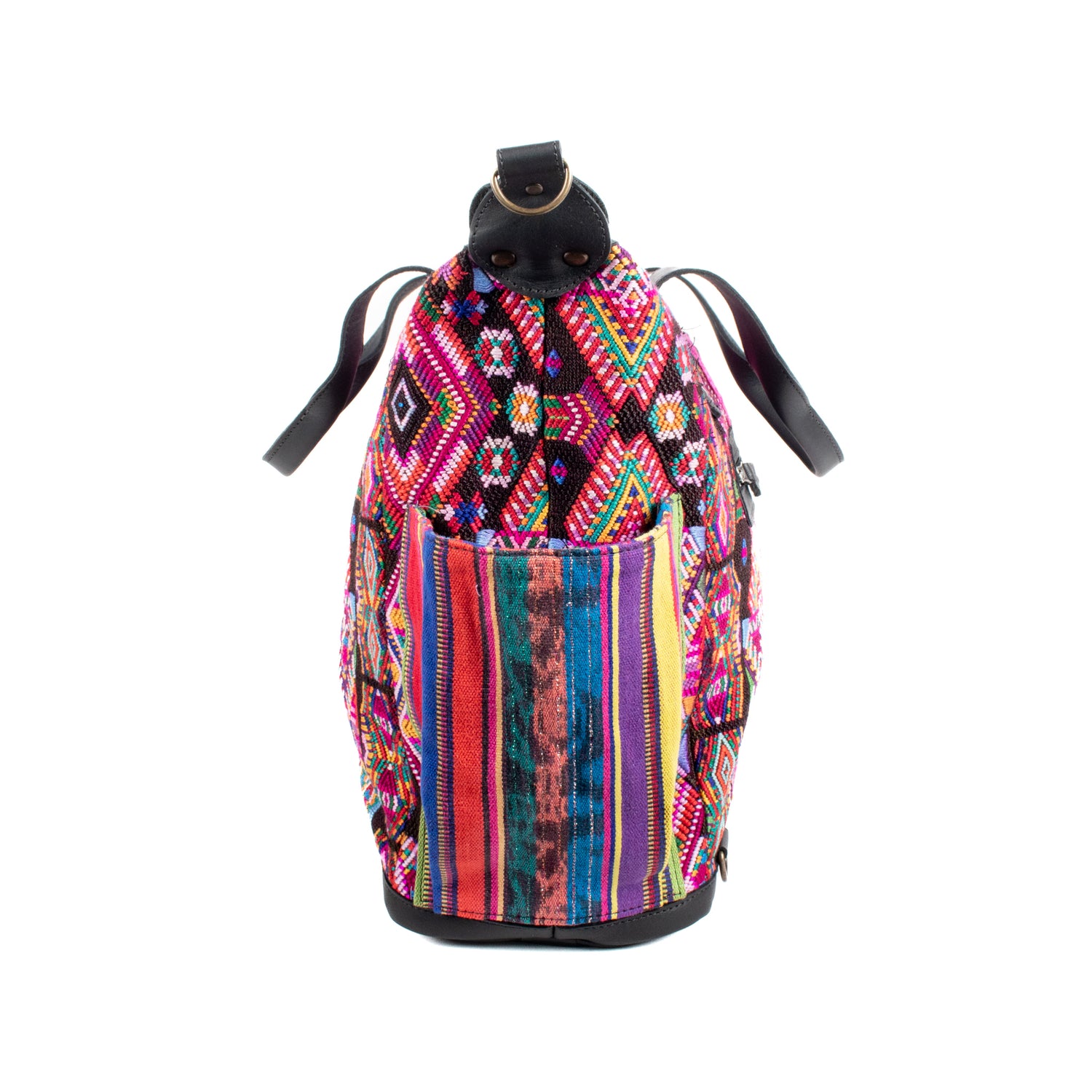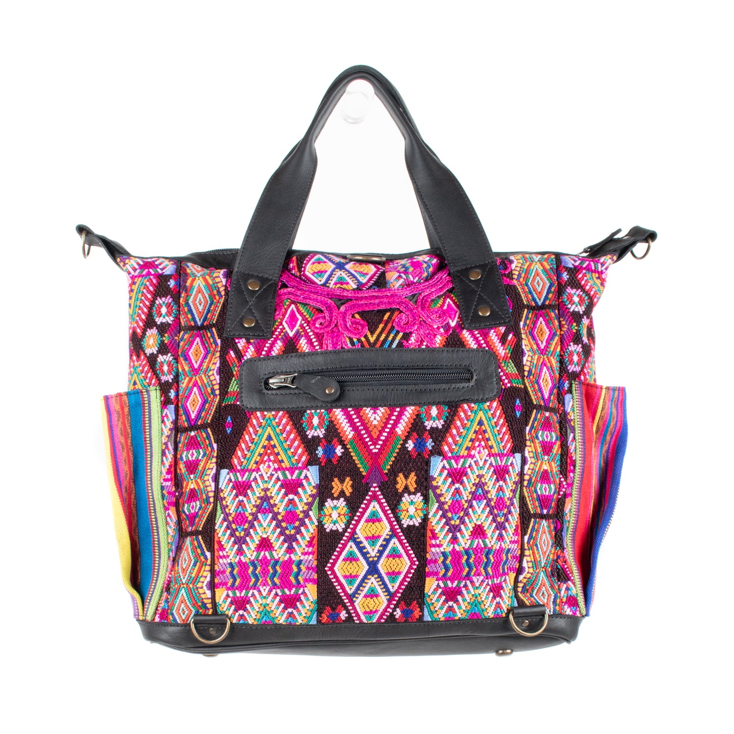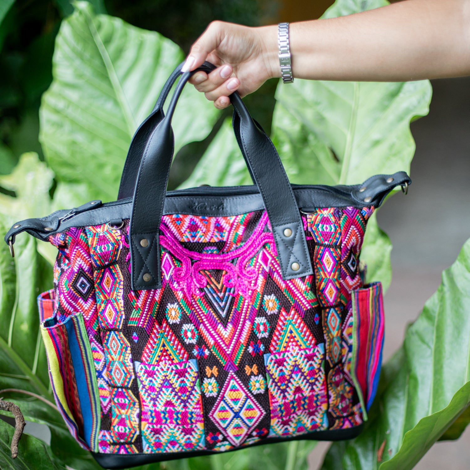 Many unique Maya symbols can be found in our One of a Kind Collection. The fabric we use for this collection is made from upcycled vintage huipiles (traditional attire worn by women in Guatemala) that were handwoven by Artisans up to 10 years ago, and they have lived a full life before being incorporated into your leather bag!
