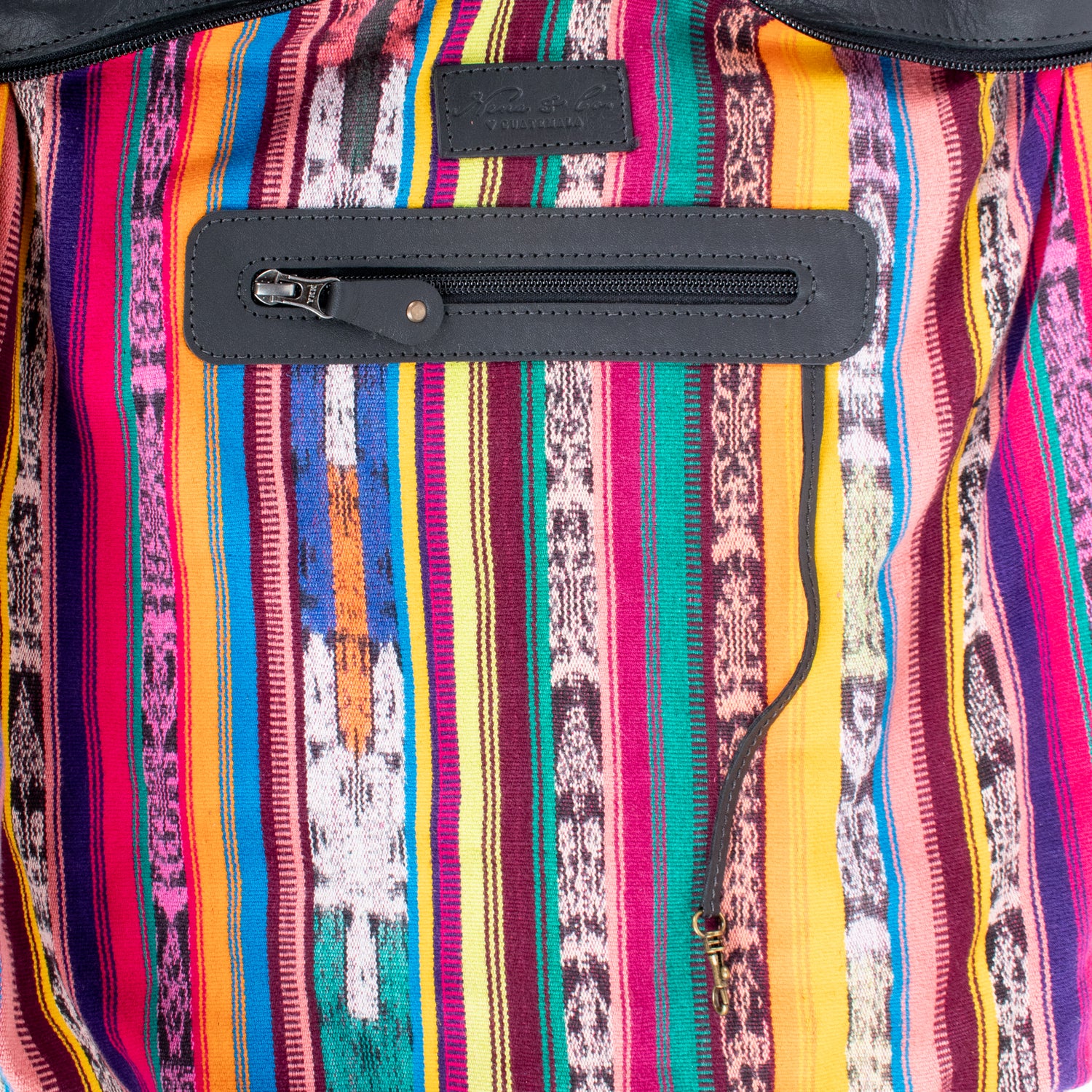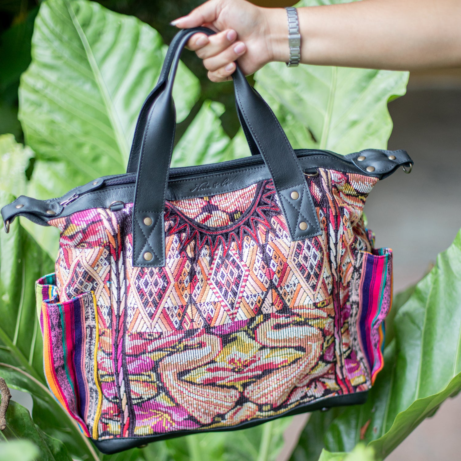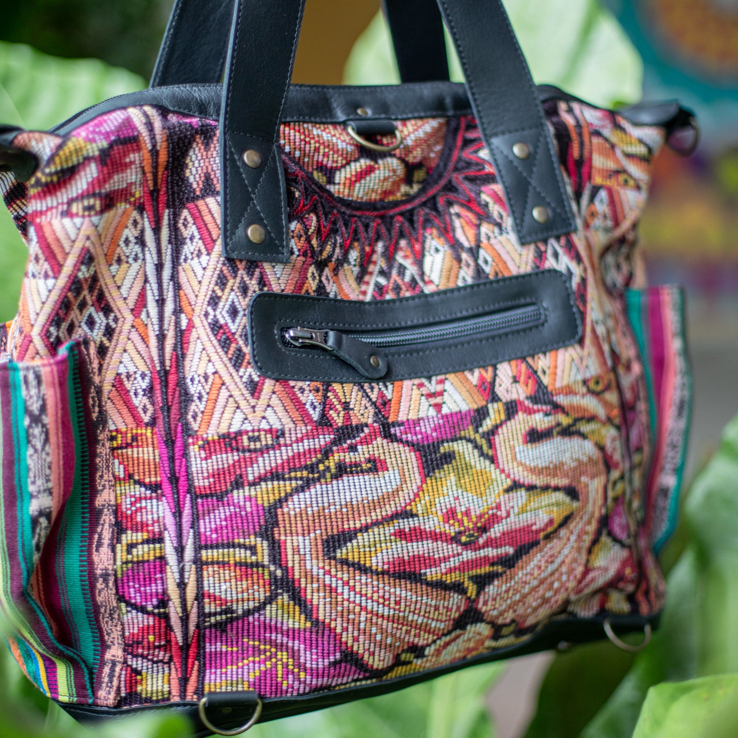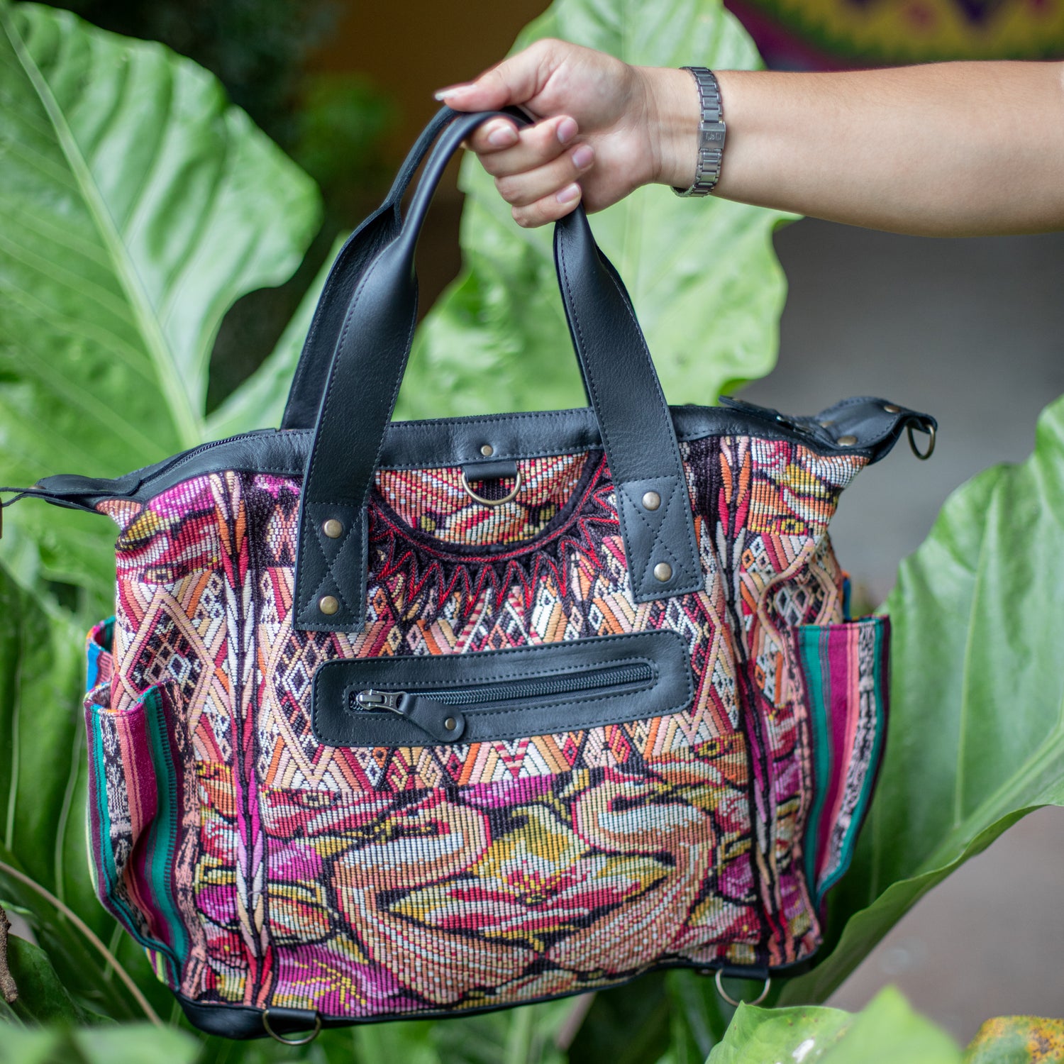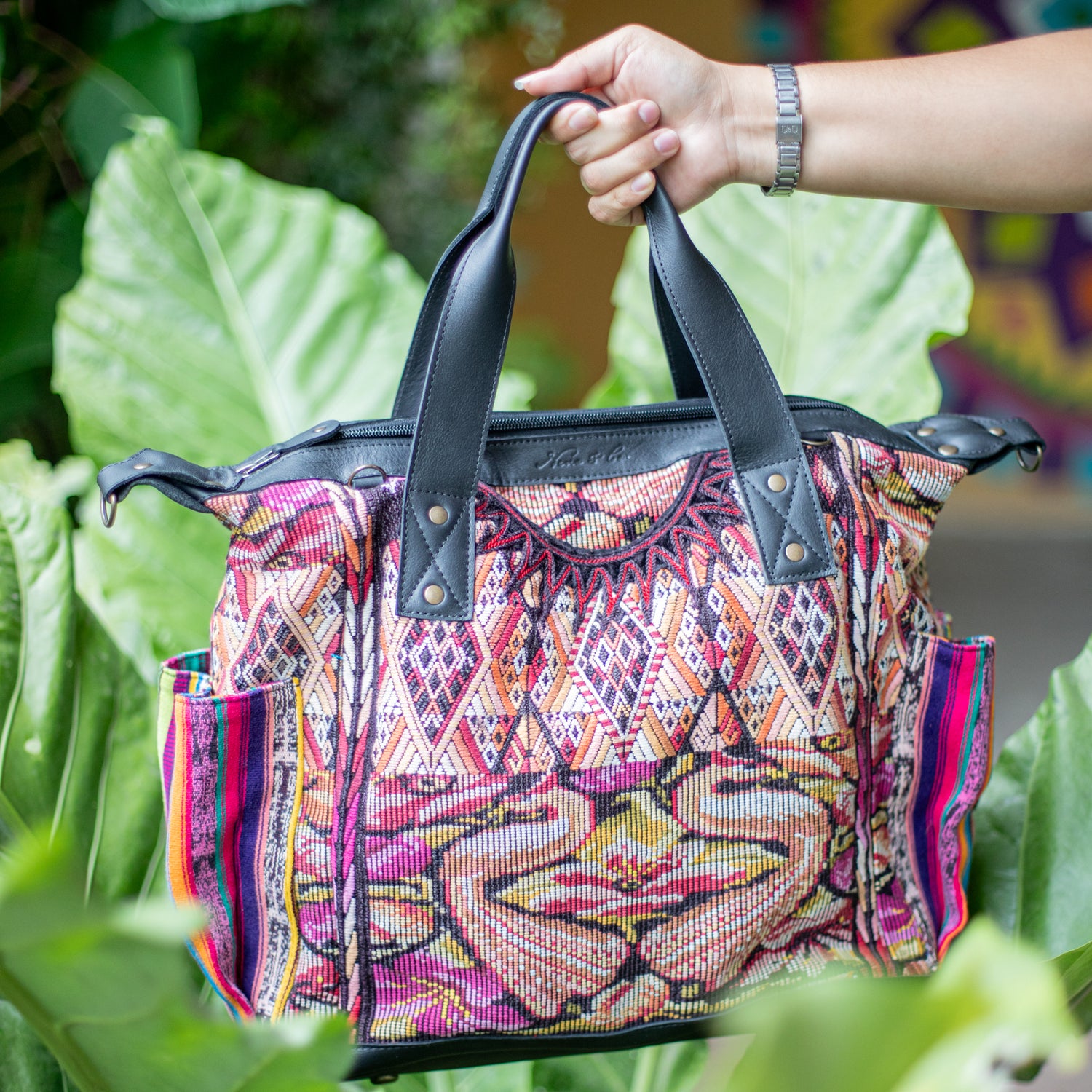 Many unique Maya symbols can be found in our One of a Kind Collection. The fabric we use for this collection is made from upcycled vintage huipiles (traditional attire worn by women in Guatemala) that were handwoven by Artisans up to 10 years ago, and they have lived a full life before being incorporated into your leather bag!