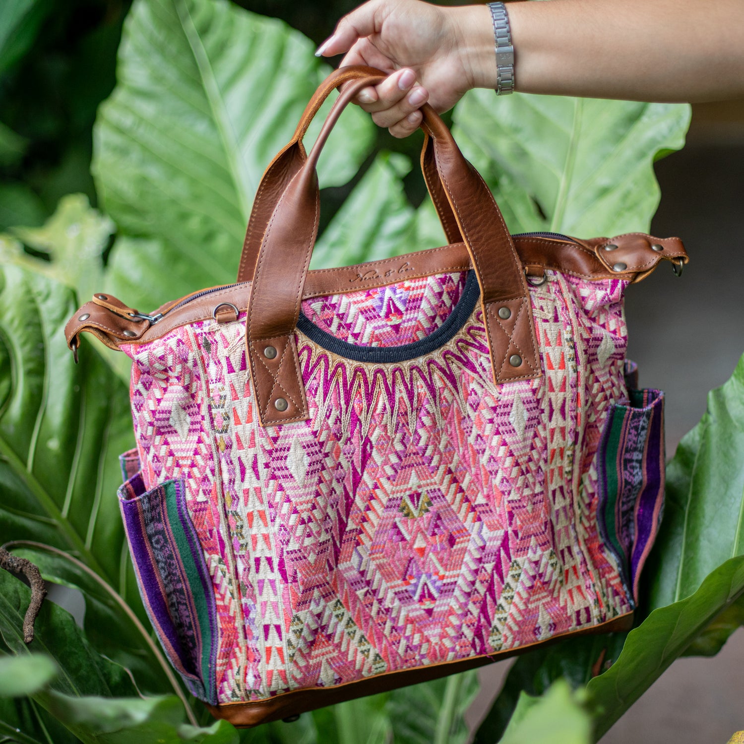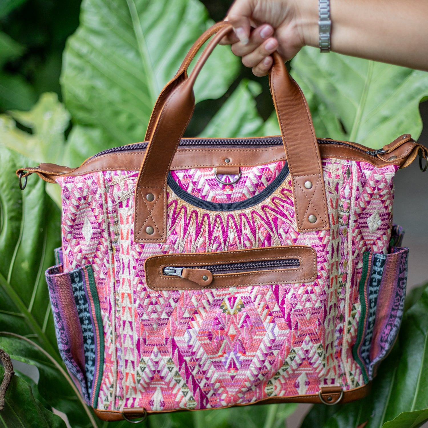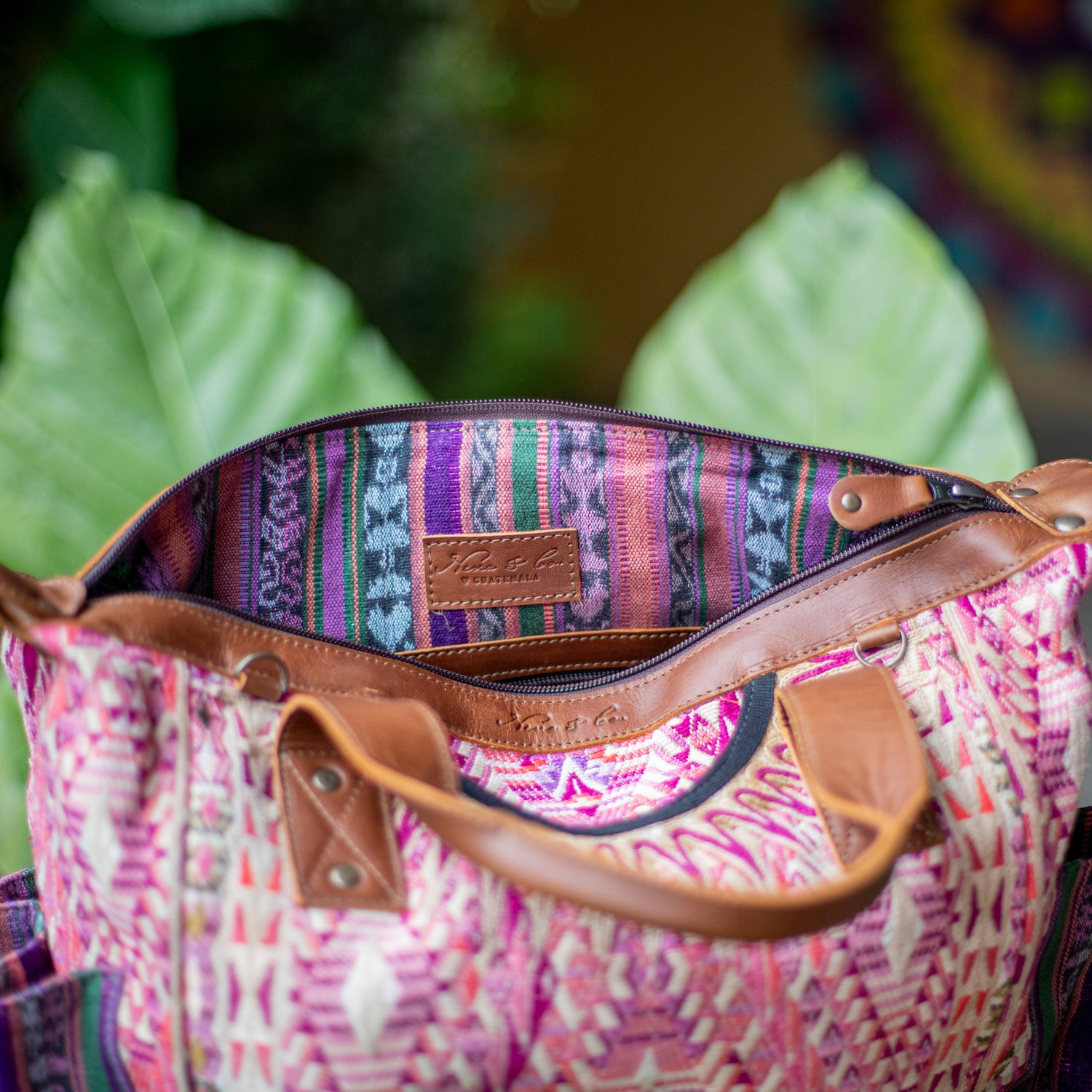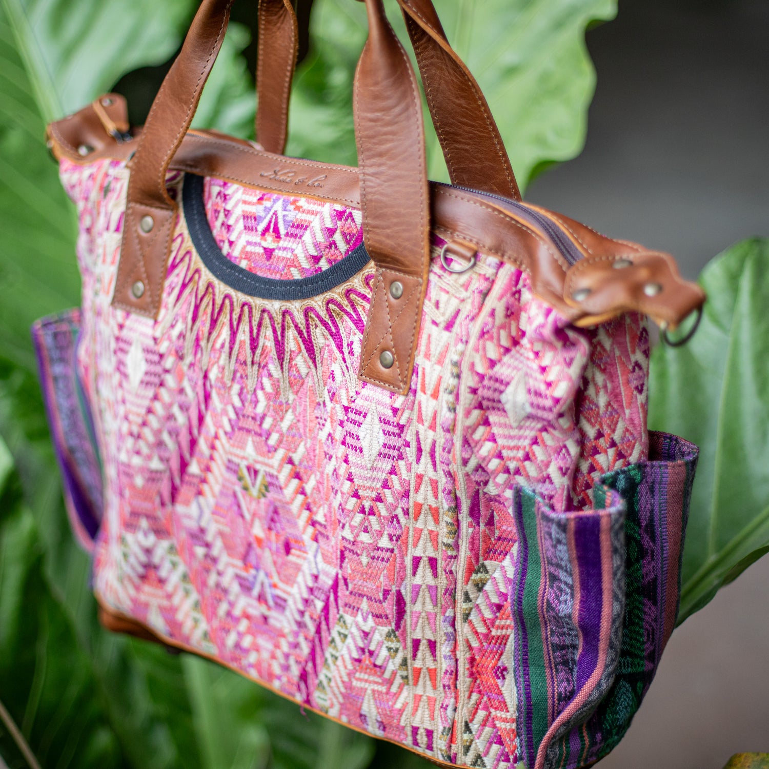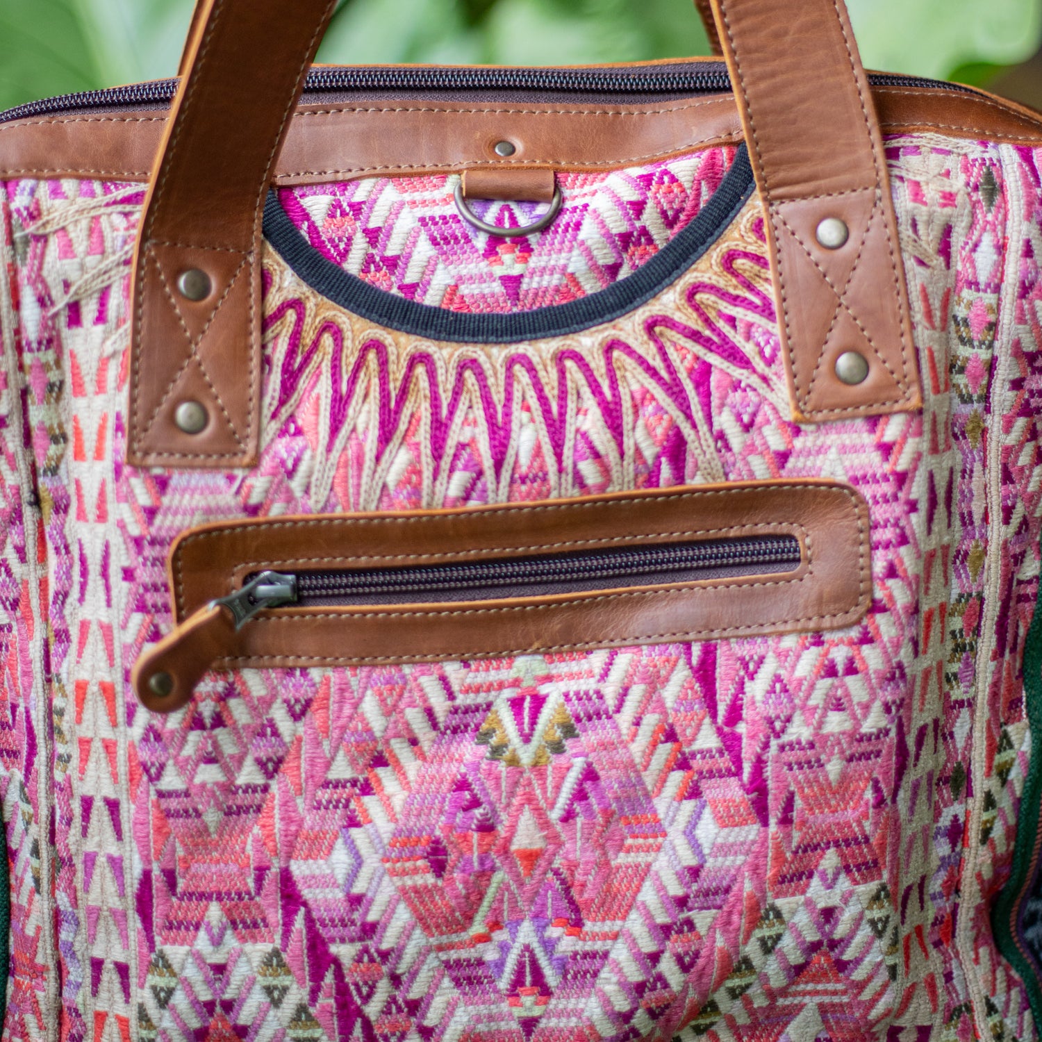 Many unique Maya symbols can be found in our One of a Kind Collection. The fabric we use for this collection is made from upcycled vintage huipiles (traditional attire worn by women in Guatemala) that were handwoven by Artisans up to 10 years ago, and they have lived a full life before being incorporated into your leather bag!