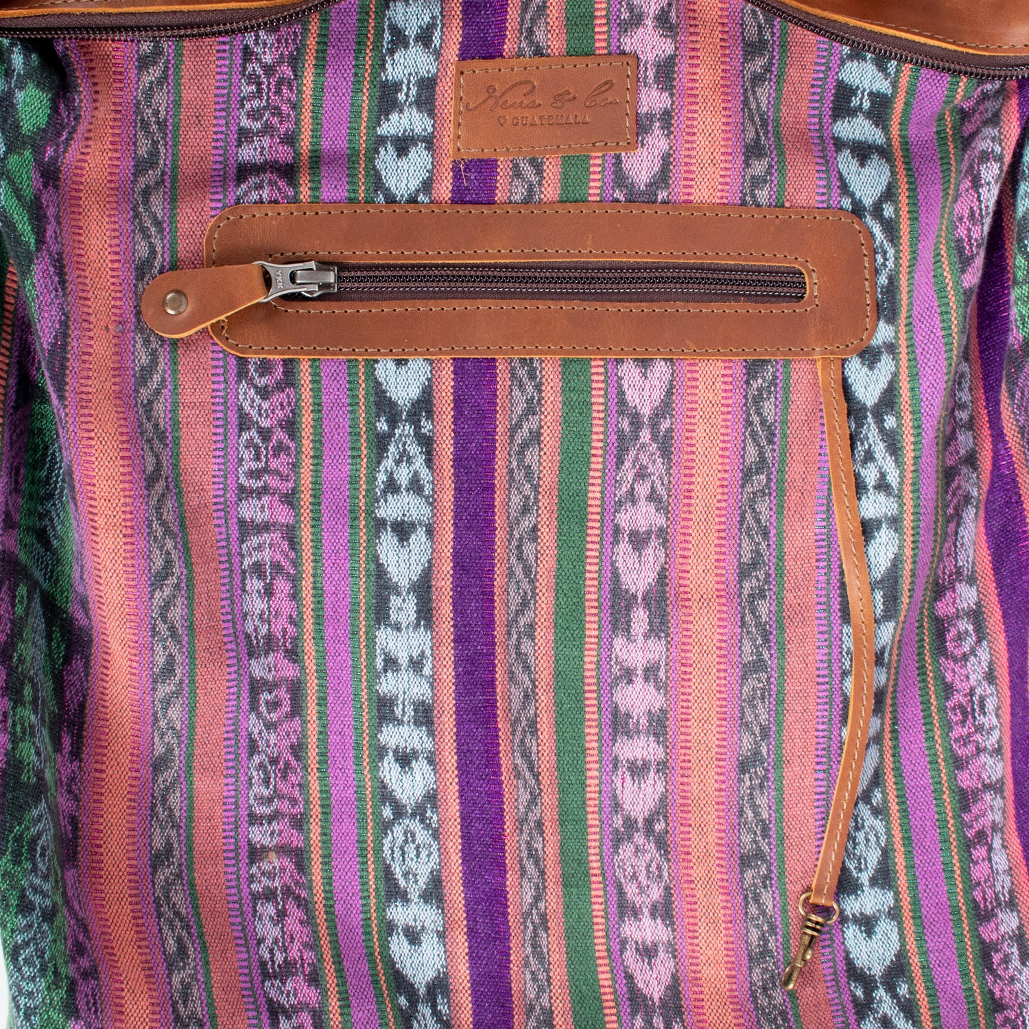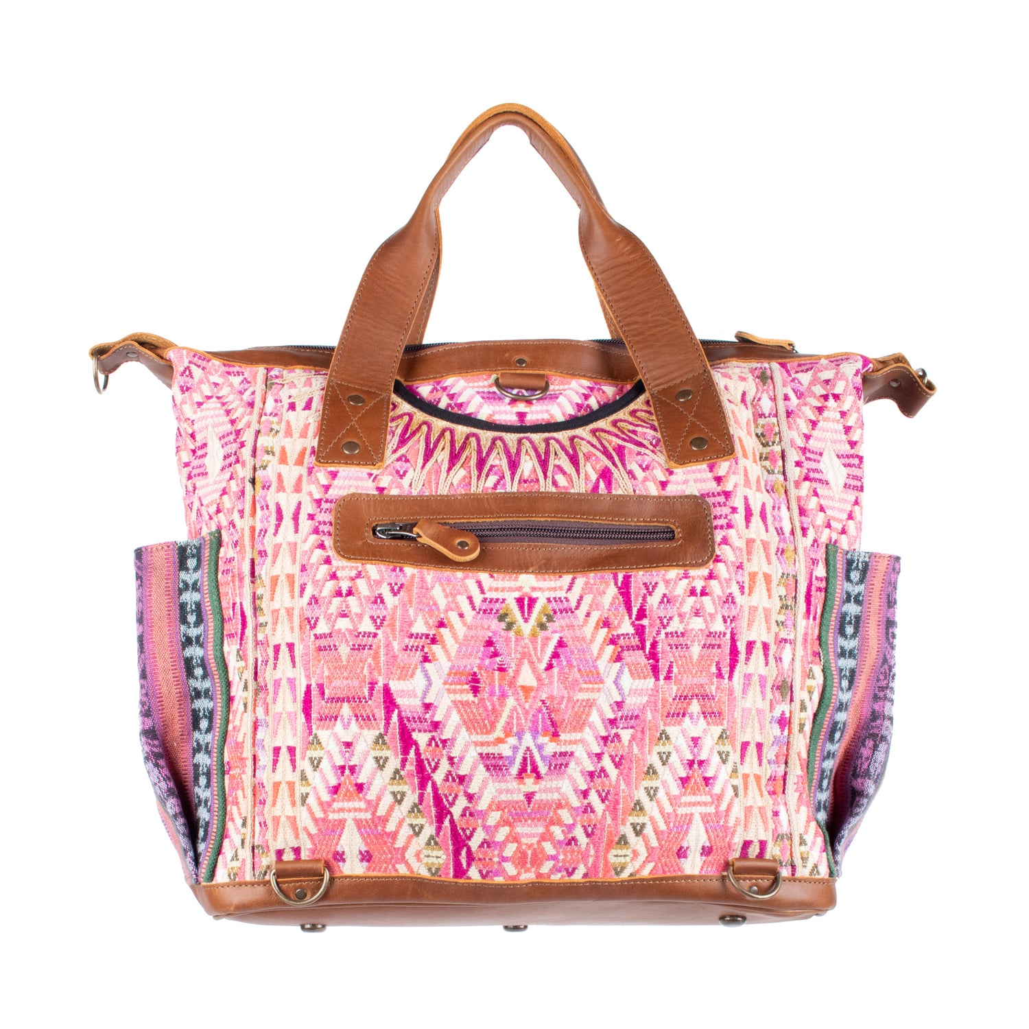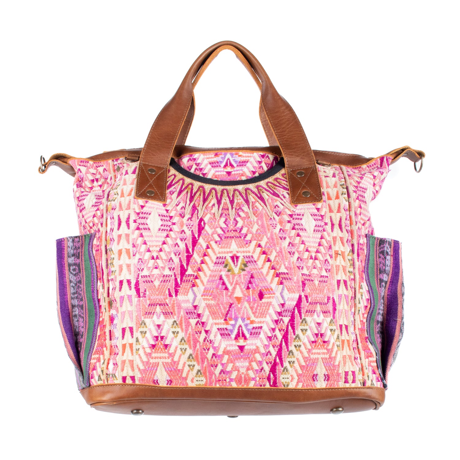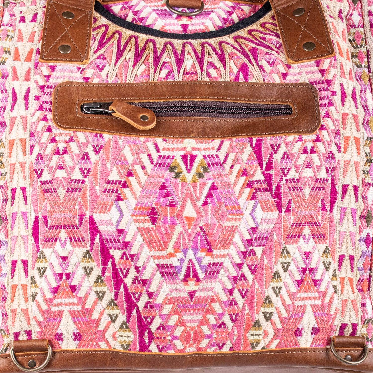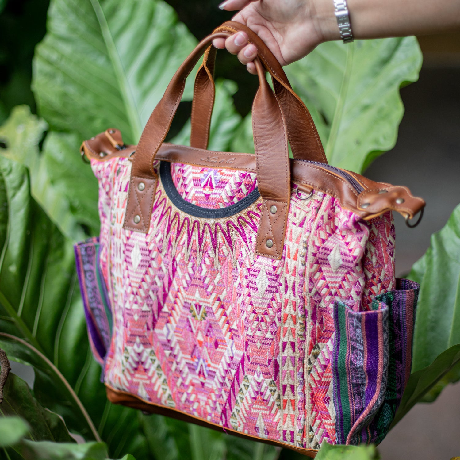Many unique Maya symbols can be found in our One of a Kind Collection. The fabric we use for this collection is made from upcycled vintage huipiles (traditional attire worn by women in Guatemala) that were handwoven by Artisans up to 10 years ago, and they have lived a full life before being incorporated into your leather bag!