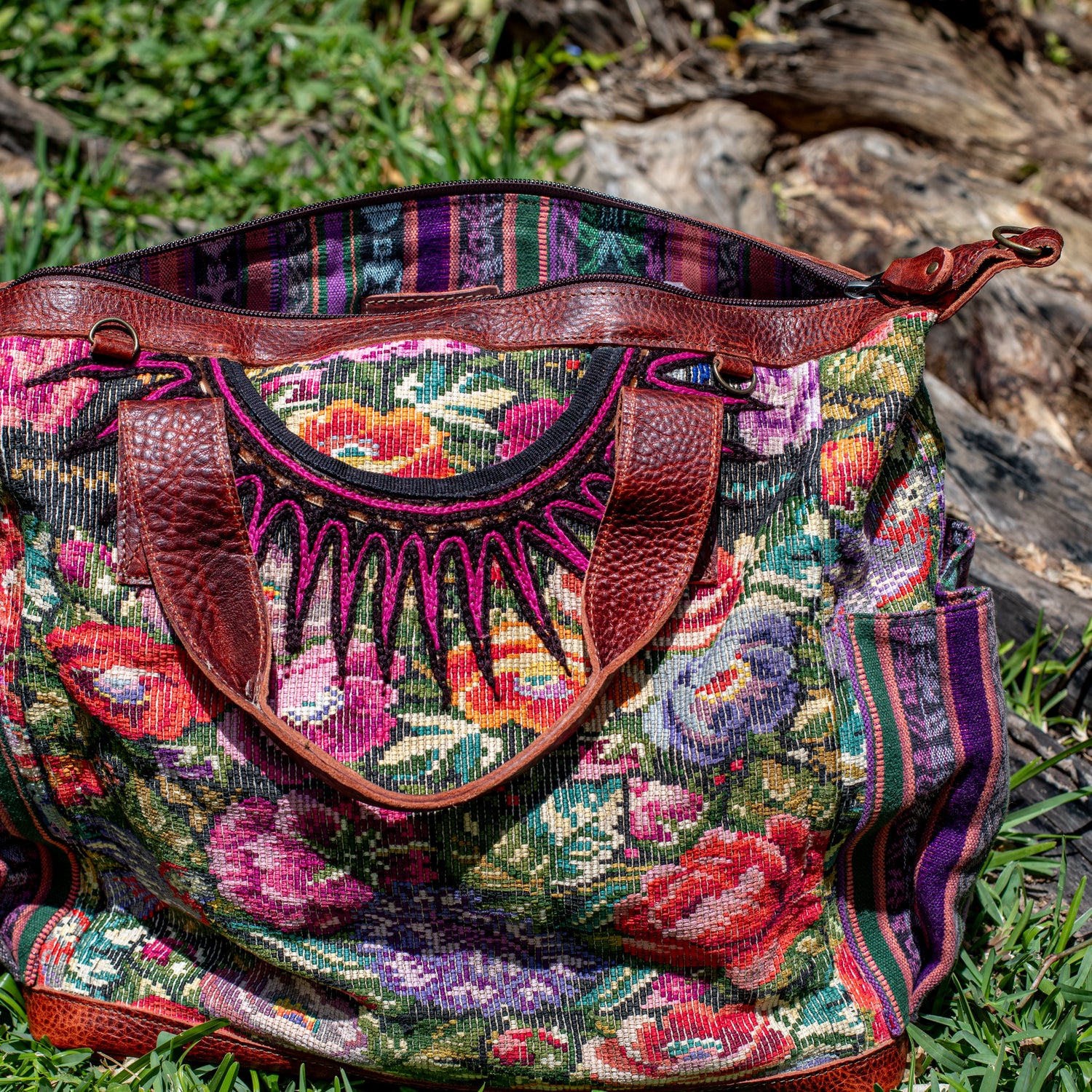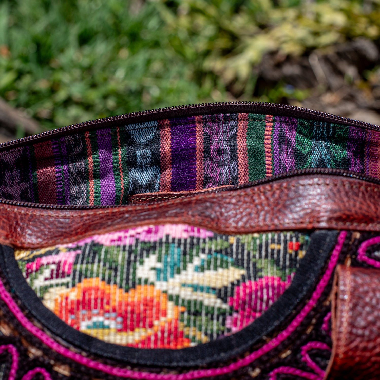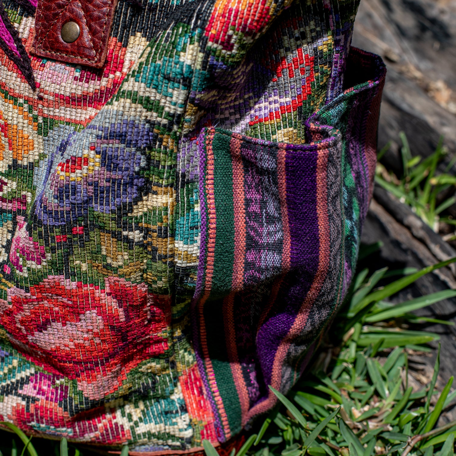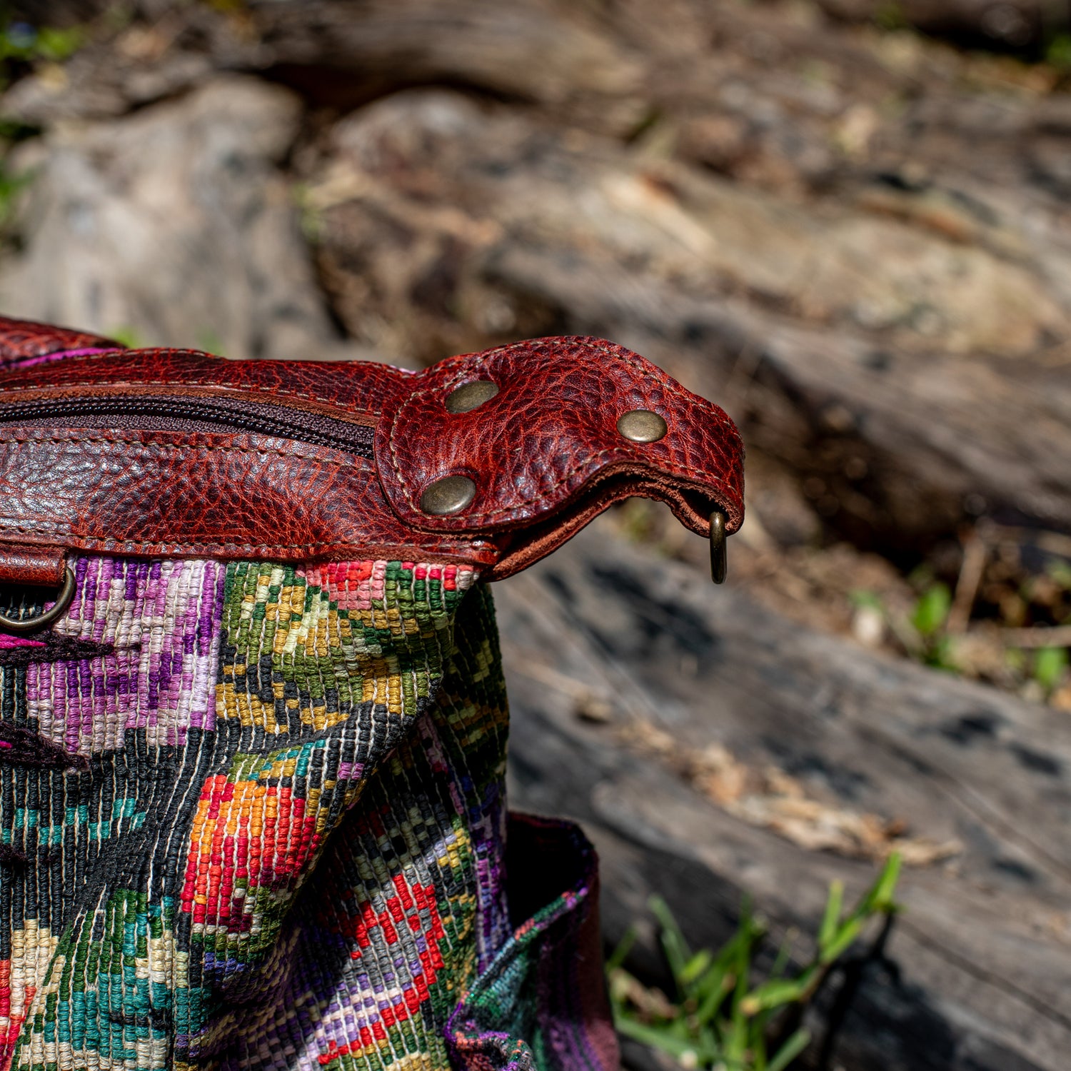 Many unique Maya symbols can be found in our One of a Kind Collection. The fabric we use for this collection is made from upcycled vintage huipiles (traditional attire worn by women in Guatemala) that were handwoven by Artisans up to 10 years ago, and they have lived a full life before being incorporated into your leather bag!