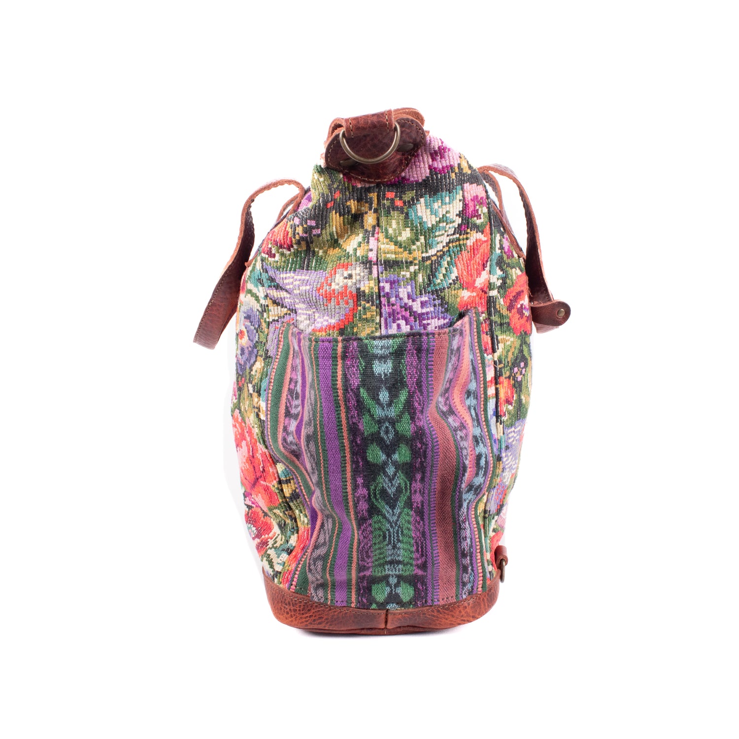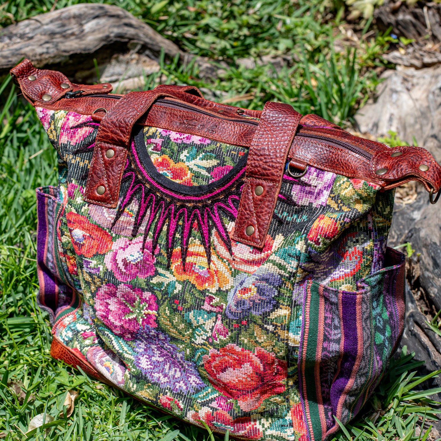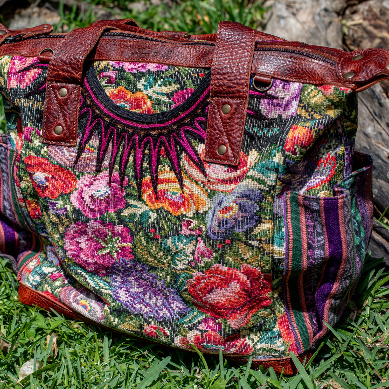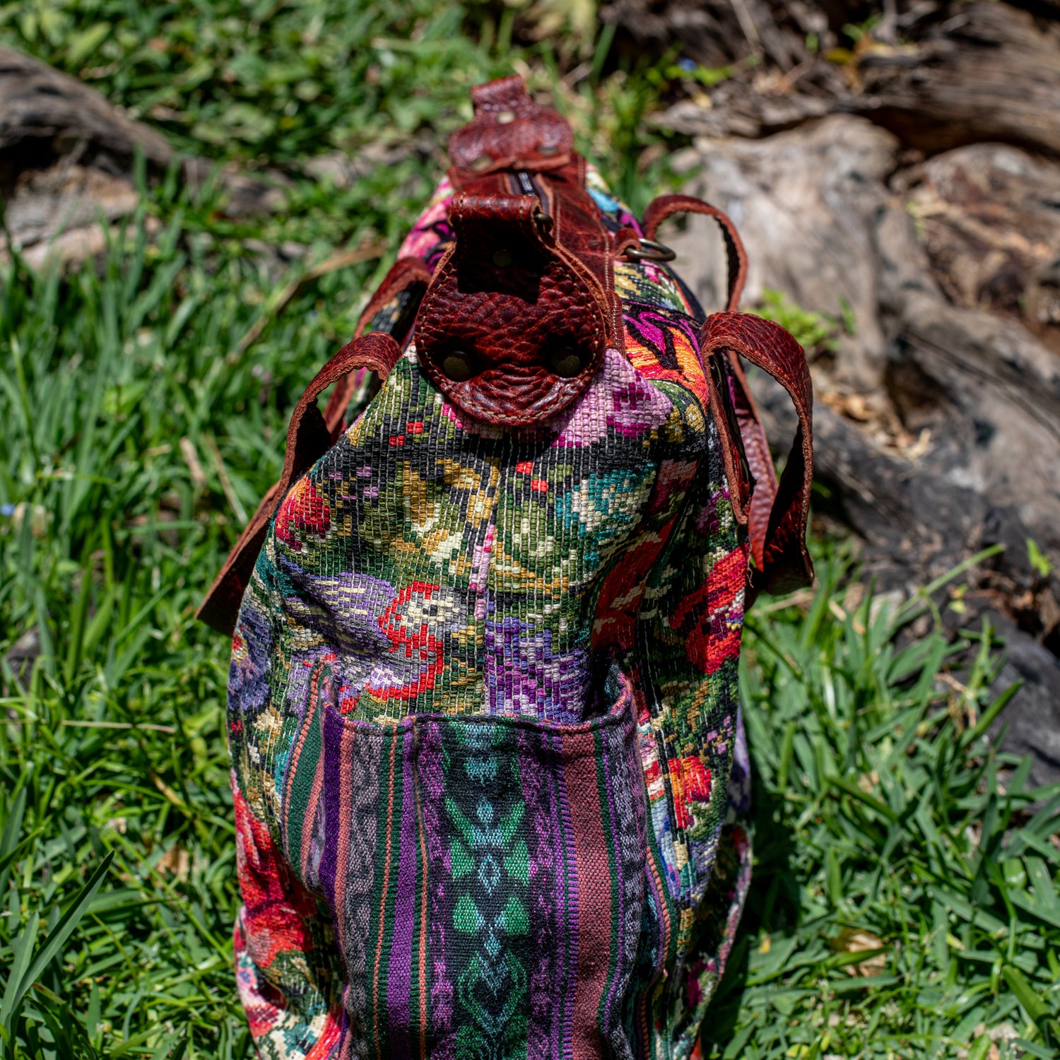 Many unique Maya symbols can be found in our One of a Kind Collection. The fabric we use for this collection is made from upcycled vintage huipiles (traditional attire worn by women in Guatemala) that were handwoven by Artisans up to 10 years ago, and they have lived a full life before being incorporated into your leather bag!