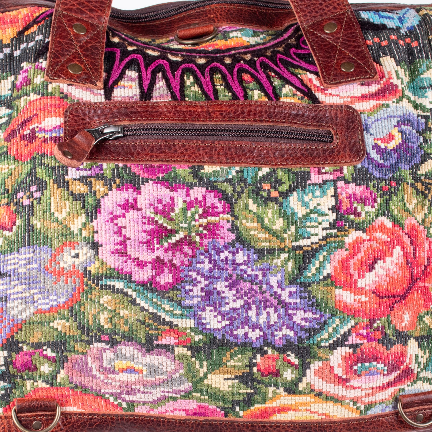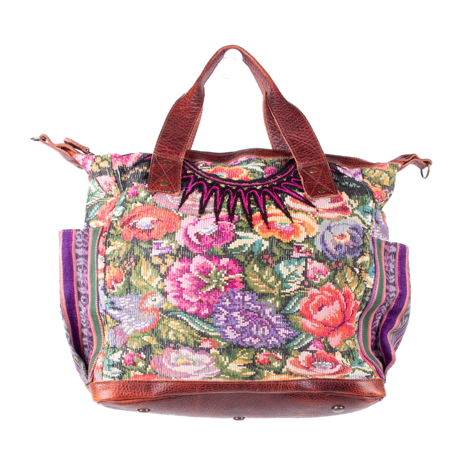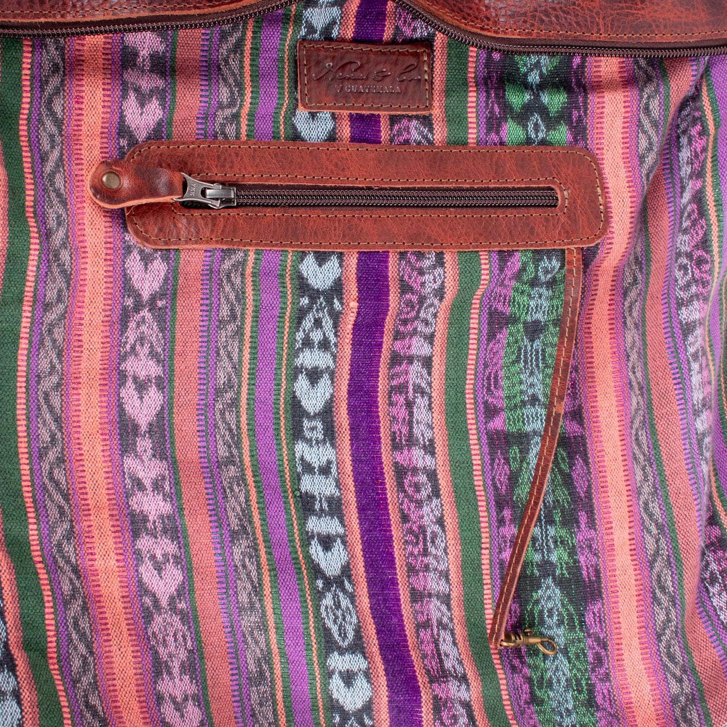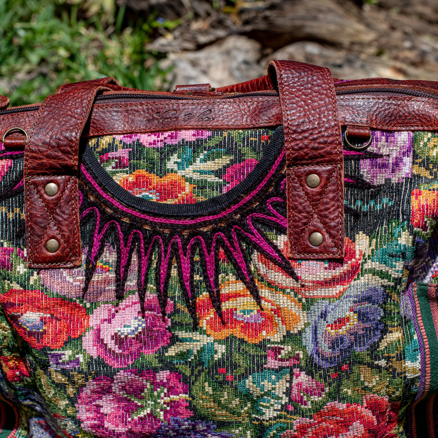 Many unique Maya symbols can be found in our One of a Kind Collection. The fabric we use for this collection is made from upcycled vintage huipiles (traditional attire worn by women in Guatemala) that were handwoven by Artisans up to 10 years ago, and they have lived a full life before being incorporated into your leather bag!