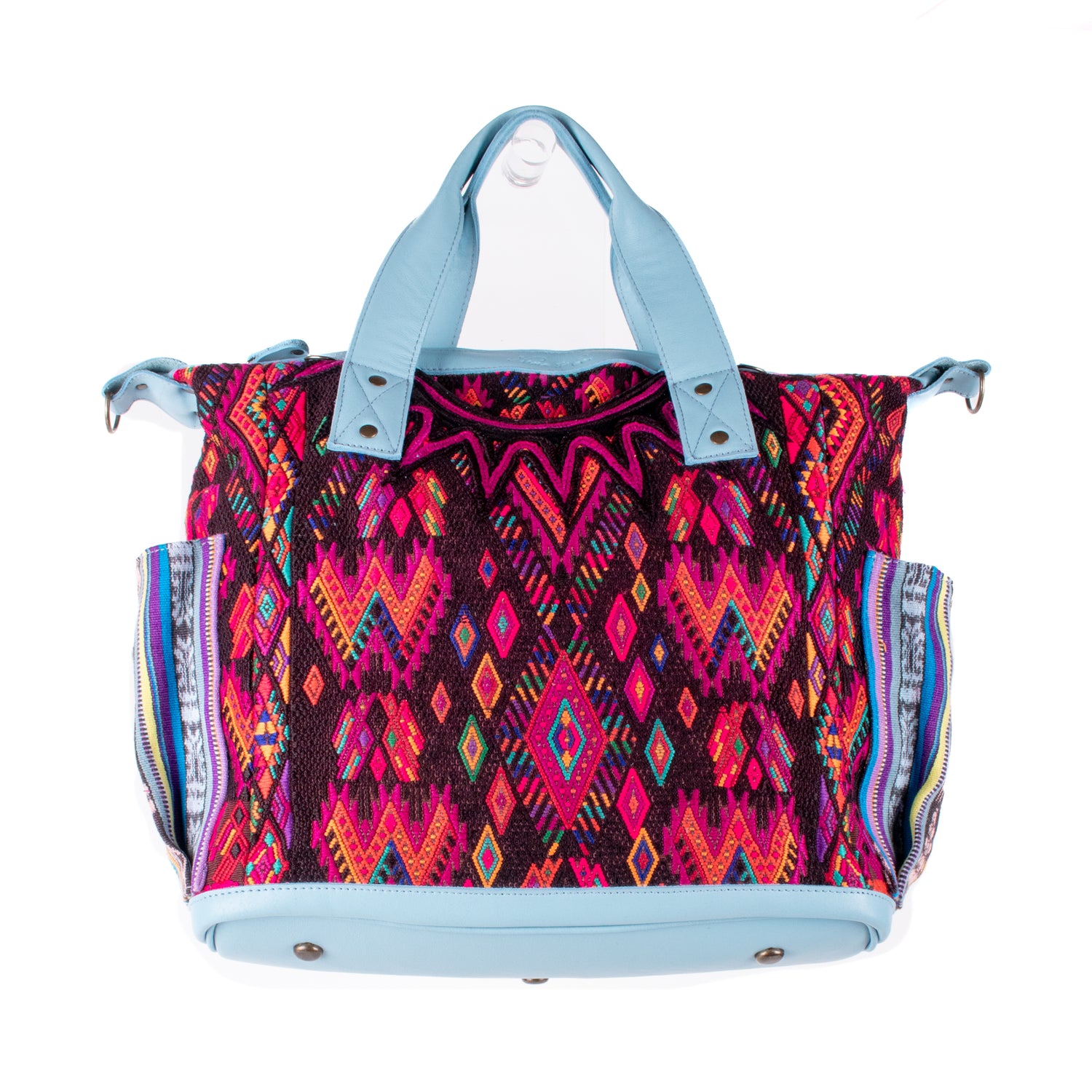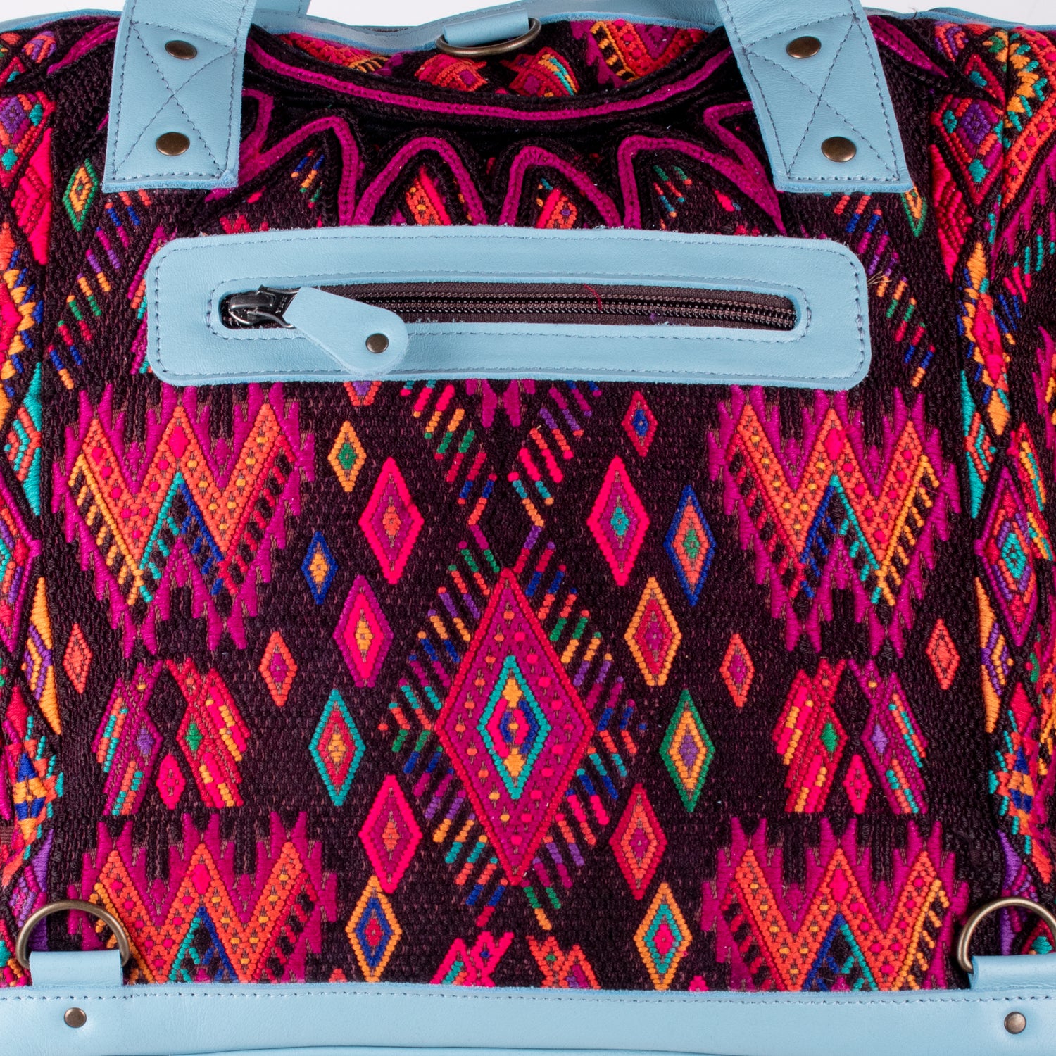 Many unique Maya symbols can be found in our One of a Kind Collection. The fabric we use for this collection is made from upcycled vintage huipiles (traditional attire worn by women in Guatemala) that were handwoven by Artisans up to 10 years ago, and they have lived a full life before being incorporated into your leather bag!