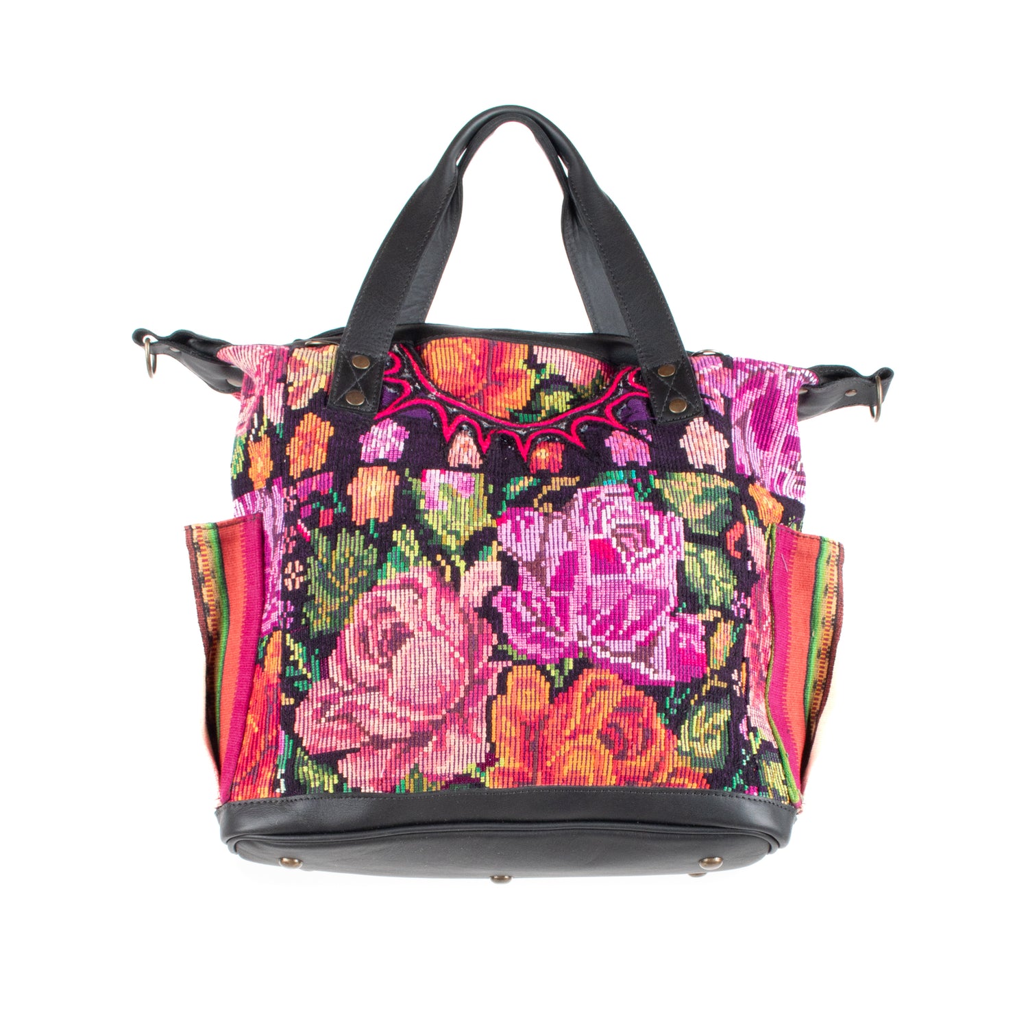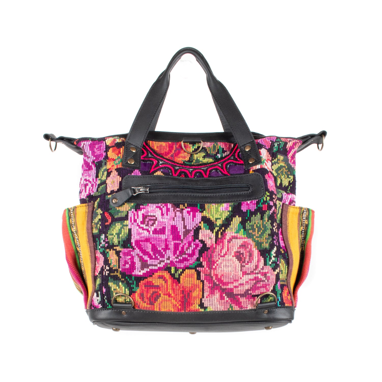 Many unique Maya symbols can be found in our One of a Kind Collection. The fabric we use for this collection is made from upcycled vintage huipiles (traditional attire worn by women in Guatemala) that were handwoven by Artisans up to 10 years ago, and they have lived a full life before being incorporated into your leather bag!