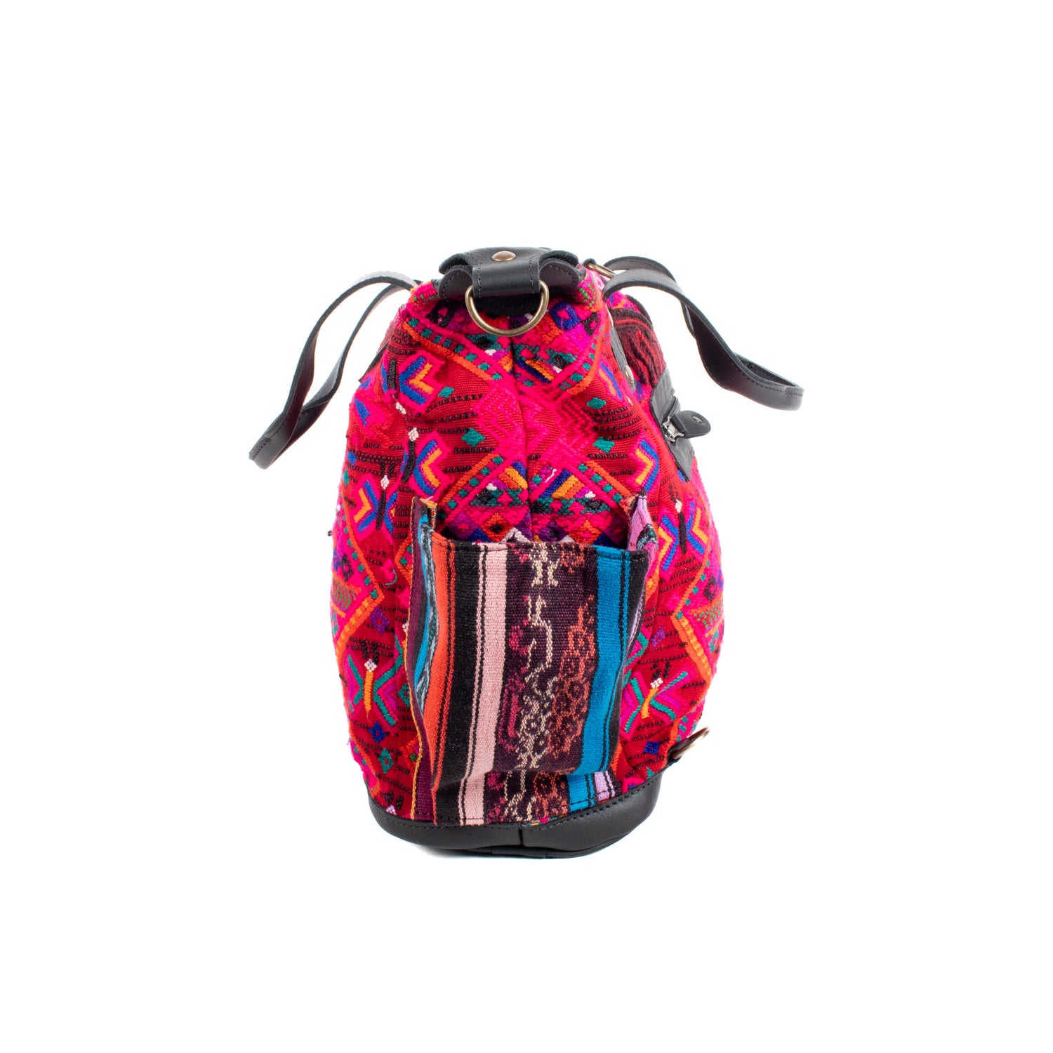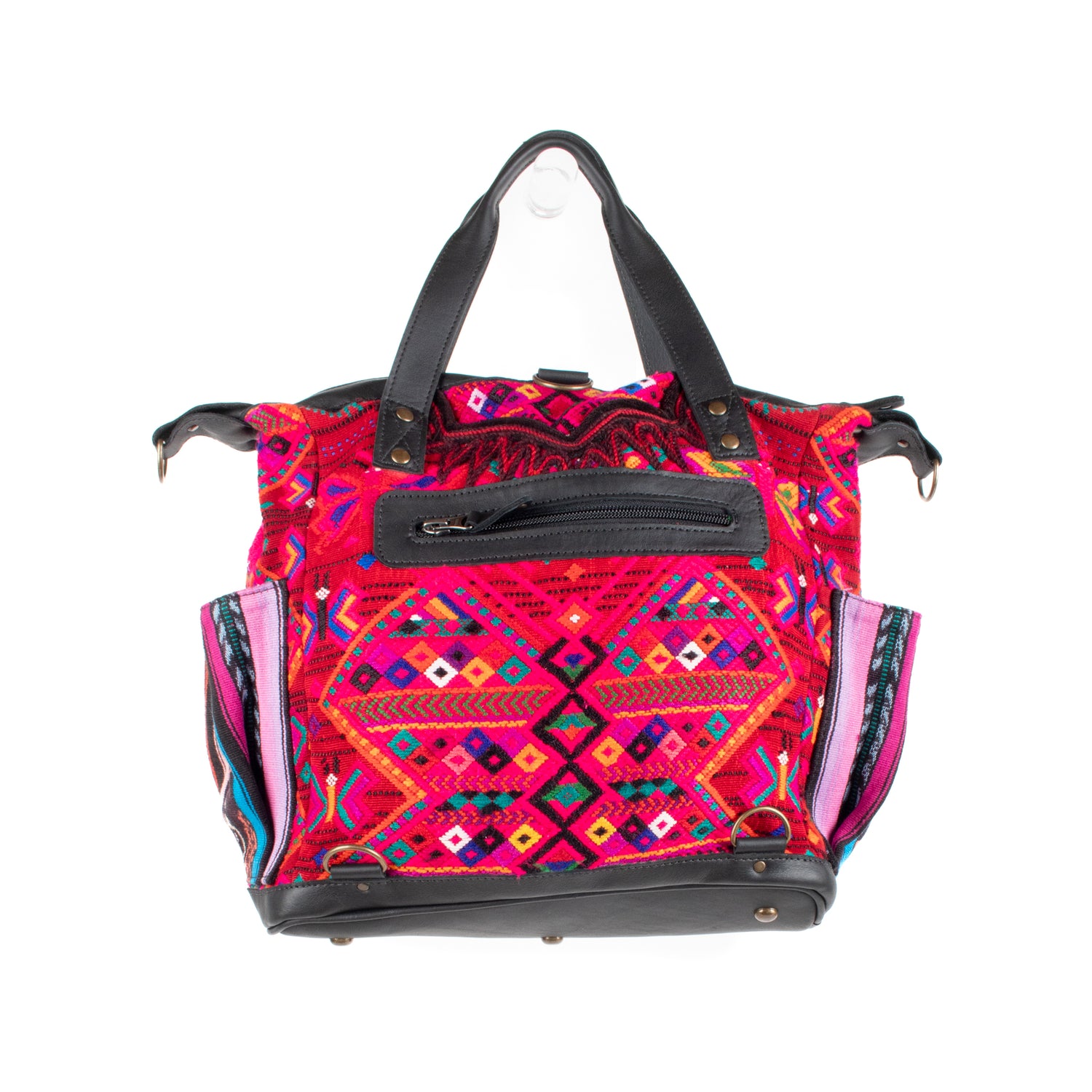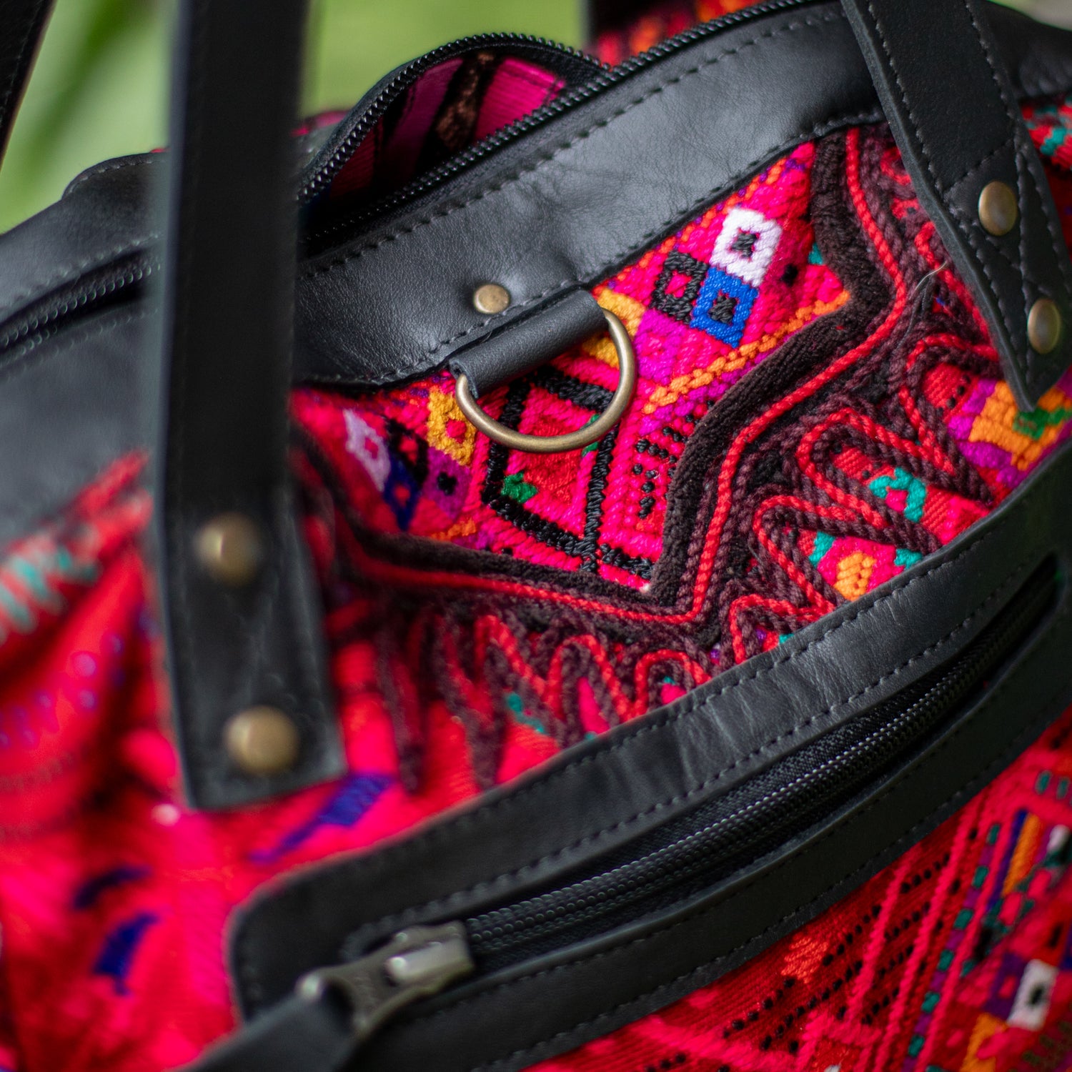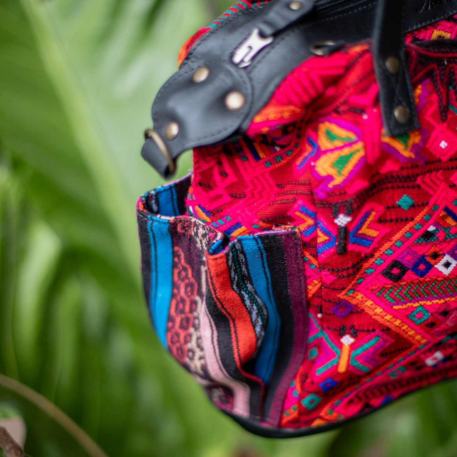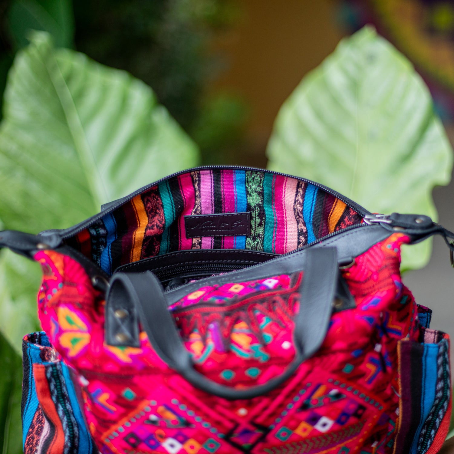 Many unique Maya symbols can be found in our One of a Kind Collection. The fabric we use for this collection is made from upcycled vintage huipiles (traditional attire worn by women in Guatemala) that were handwoven by Artisans up to 10 years ago, and they have lived a full life before being incorporated into your leather bag!