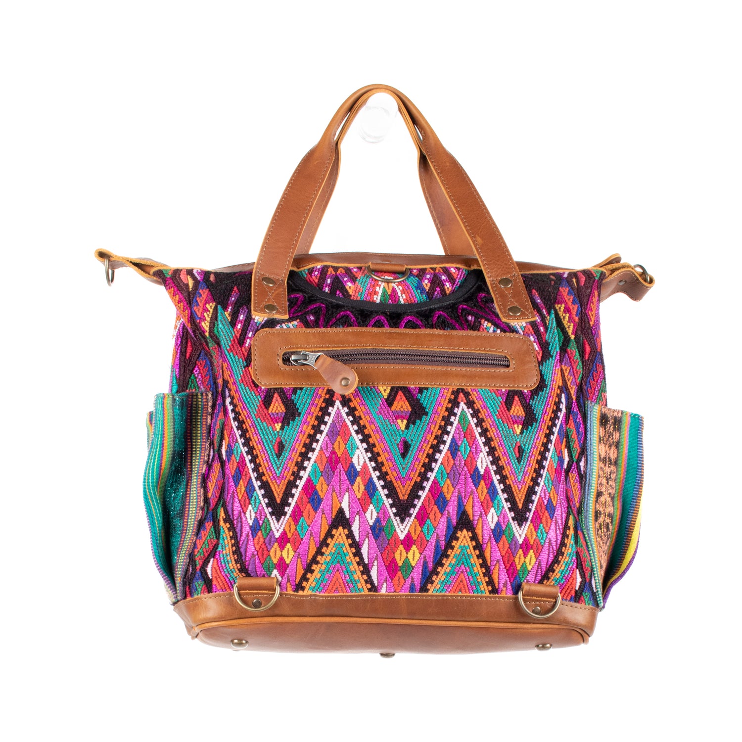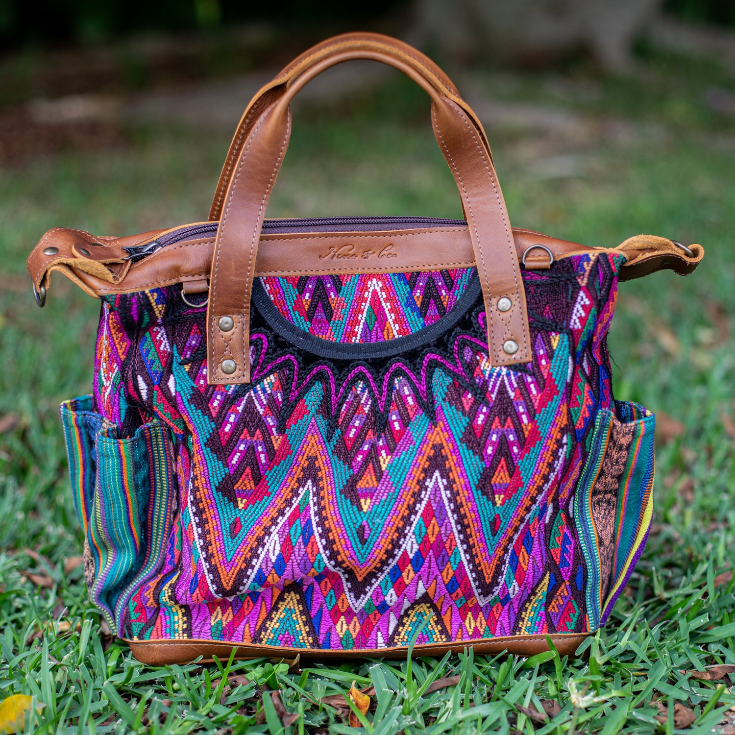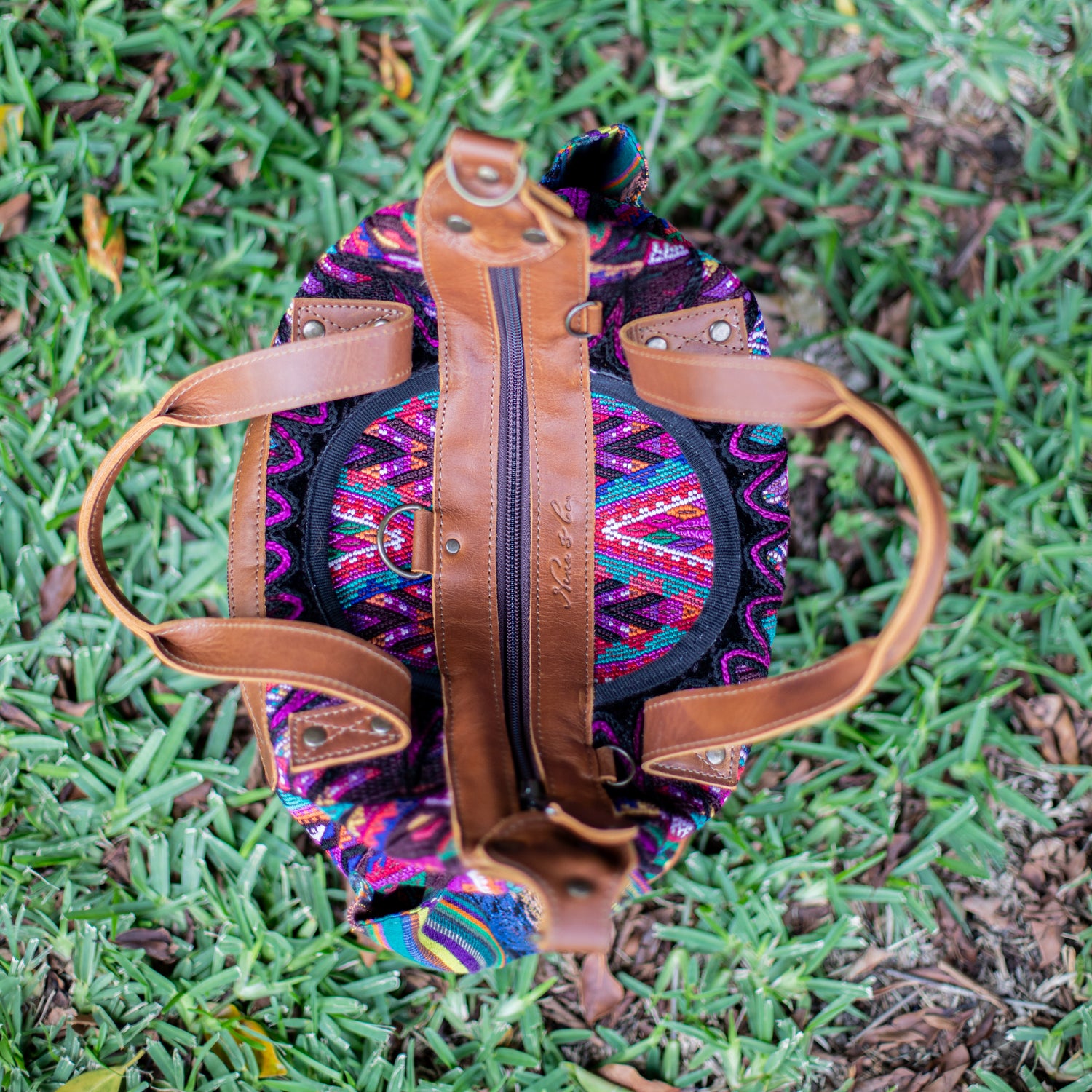Many unique Maya symbols can be found in our One of a Kind Collection. The fabric we use for this collection is made from upcycled vintage huipiles (traditional attire worn by women in Guatemala) that were handwoven by Artisans up to 10 years ago, and they have lived a full life before being incorporated into your leather bag!