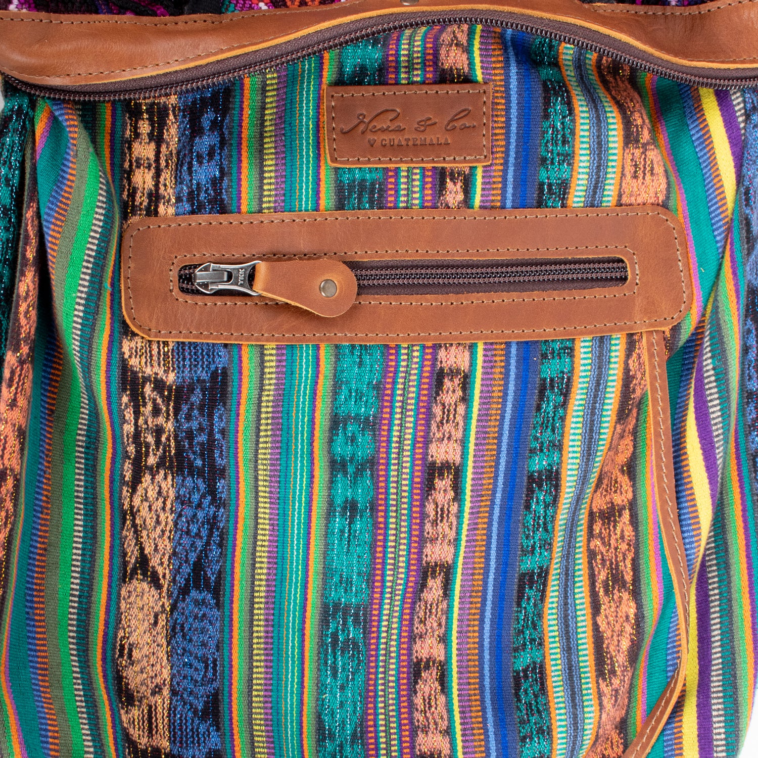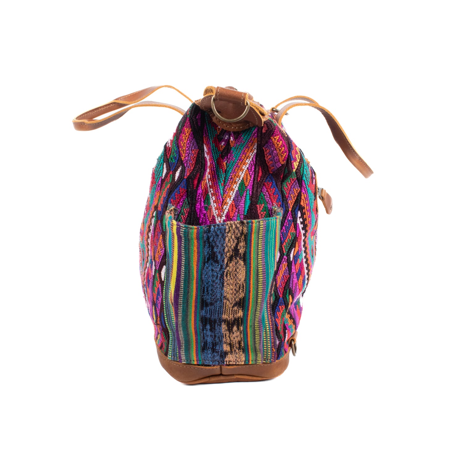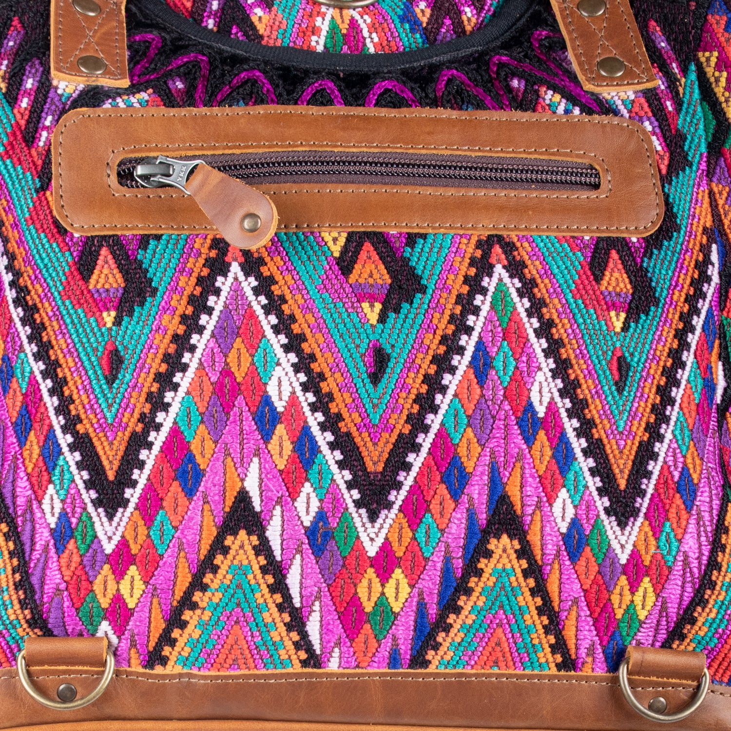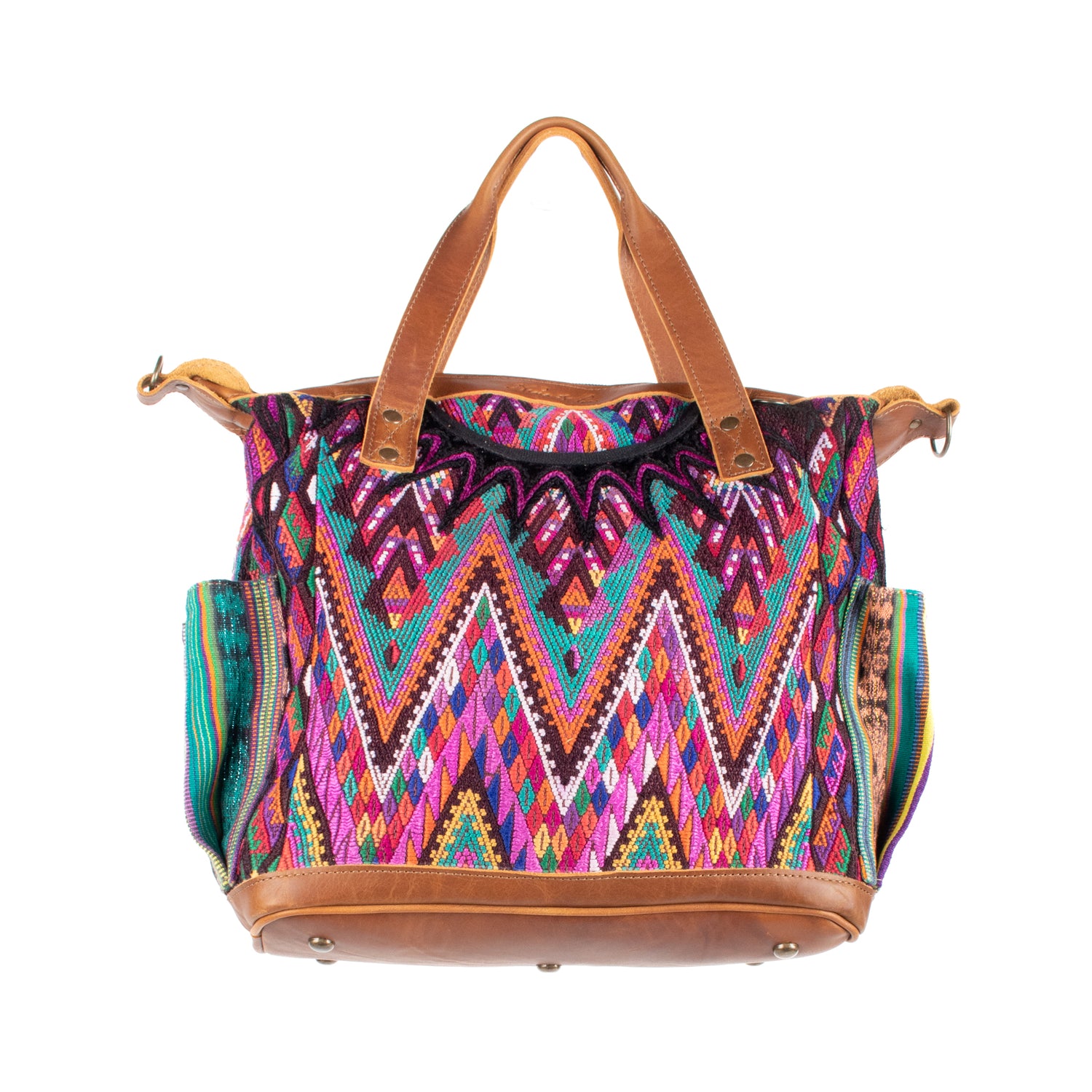 Many unique Maya symbols can be found in our One of a Kind Collection. The fabric we use for this collection is made from upcycled vintage huipiles (traditional attire worn by women in Guatemala) that were handwoven by Artisans up to 10 years ago, and they have lived a full life before being incorporated into your leather bag!