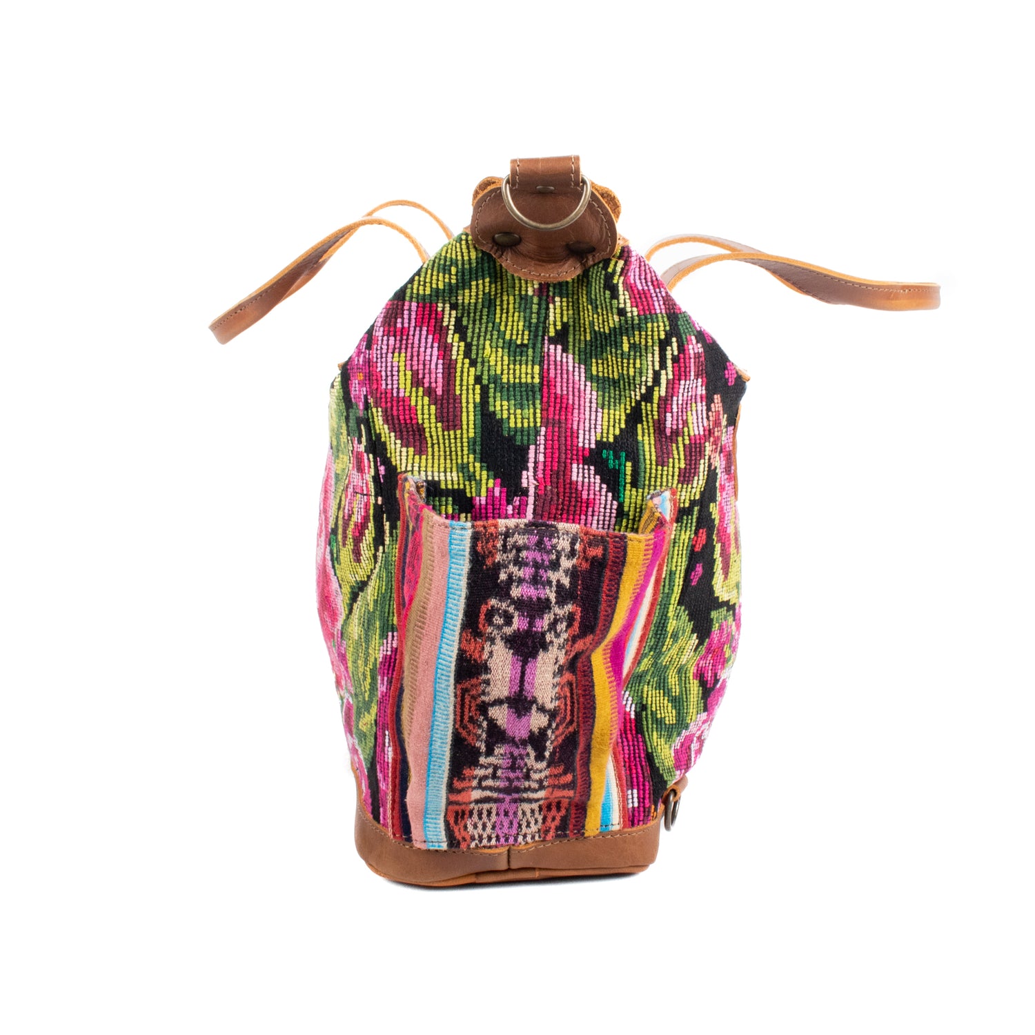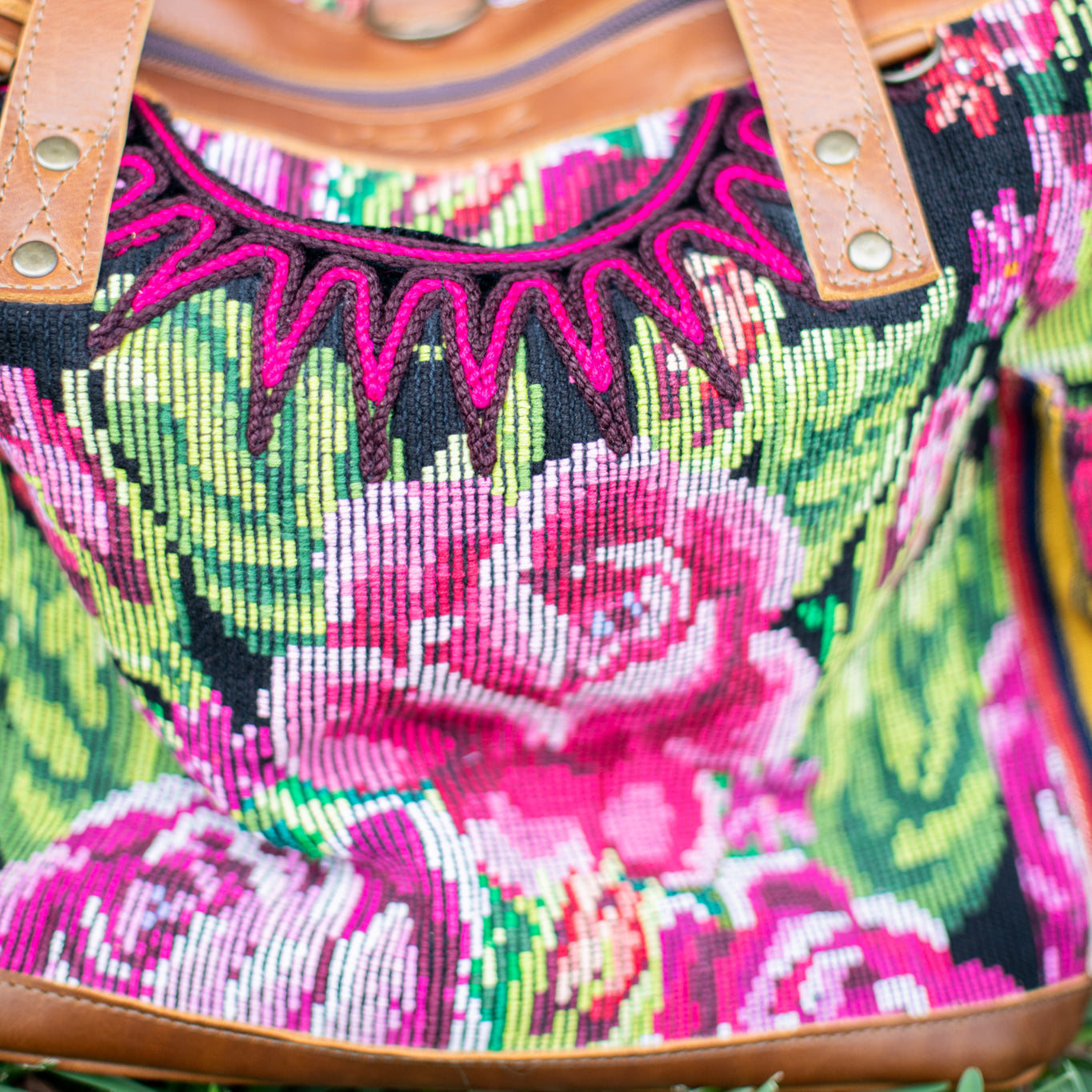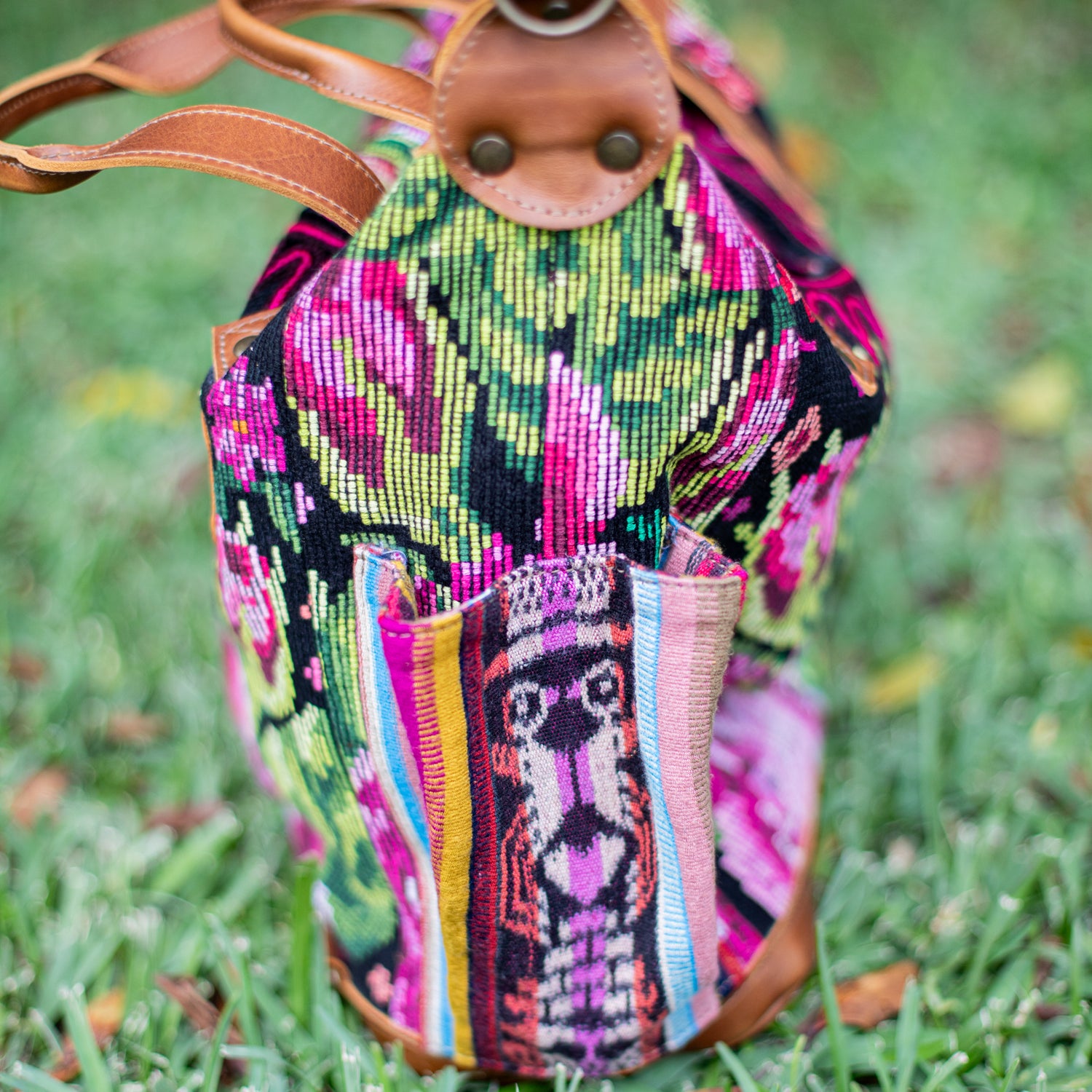 Many unique Maya symbols can be found in our One of a Kind Collection. The fabric we use for this collection is made from upcycled vintage huipiles (traditional attire worn by women in Guatemala) that were handwoven by Artisans up to 10 years ago, and they have lived a full life before being incorporated into your leather bag!