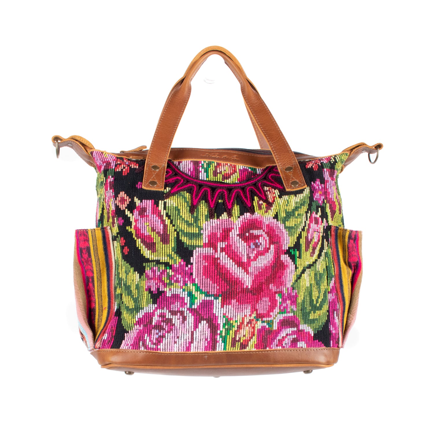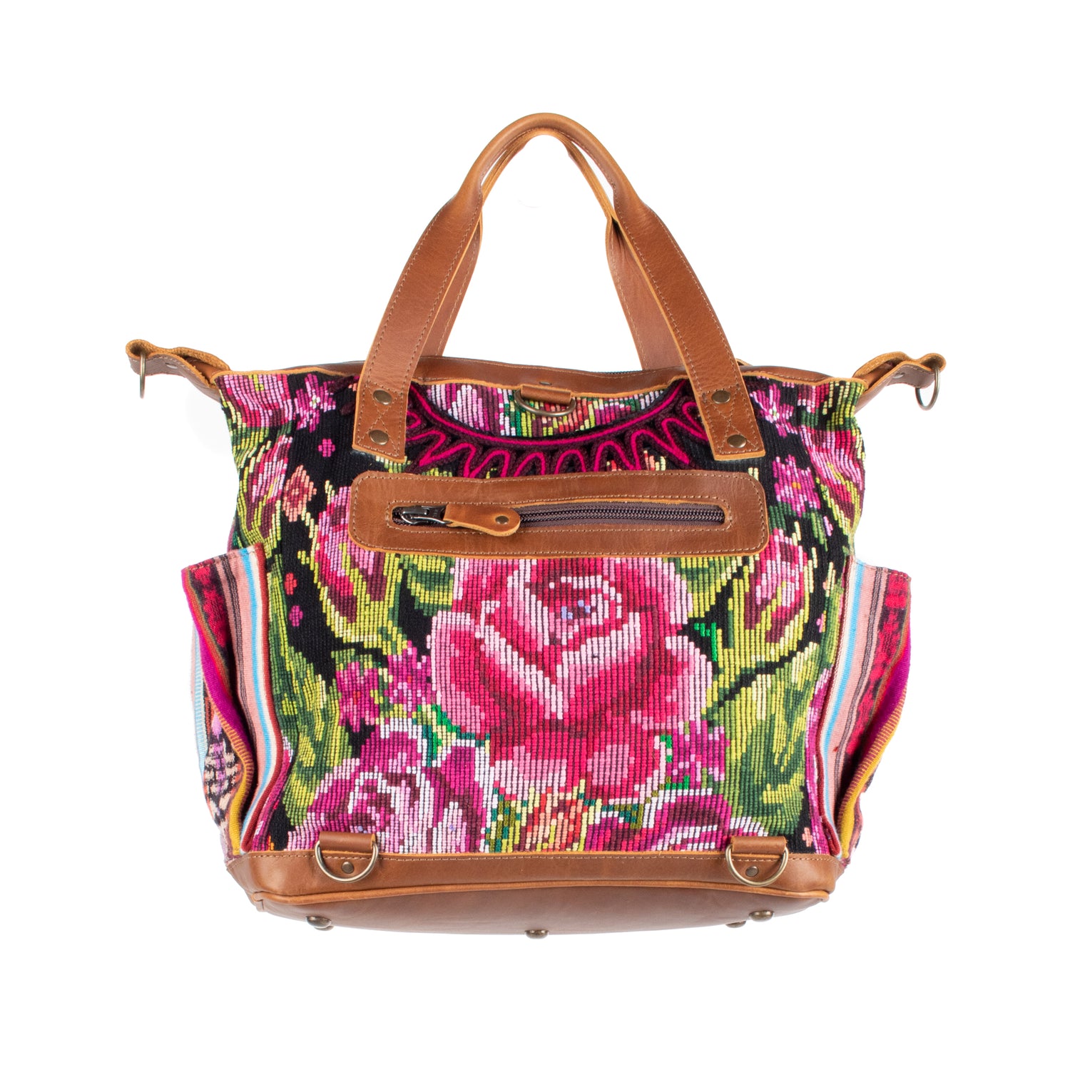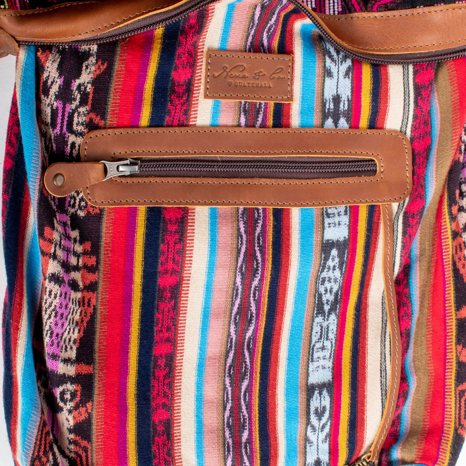 Many unique Maya symbols can be found in our One of a Kind Collection. The fabric we use for this collection is made from upcycled vintage huipiles (traditional attire worn by women in Guatemala) that were handwoven by Artisans up to 10 years ago, and they have lived a full life before being incorporated into your leather bag!