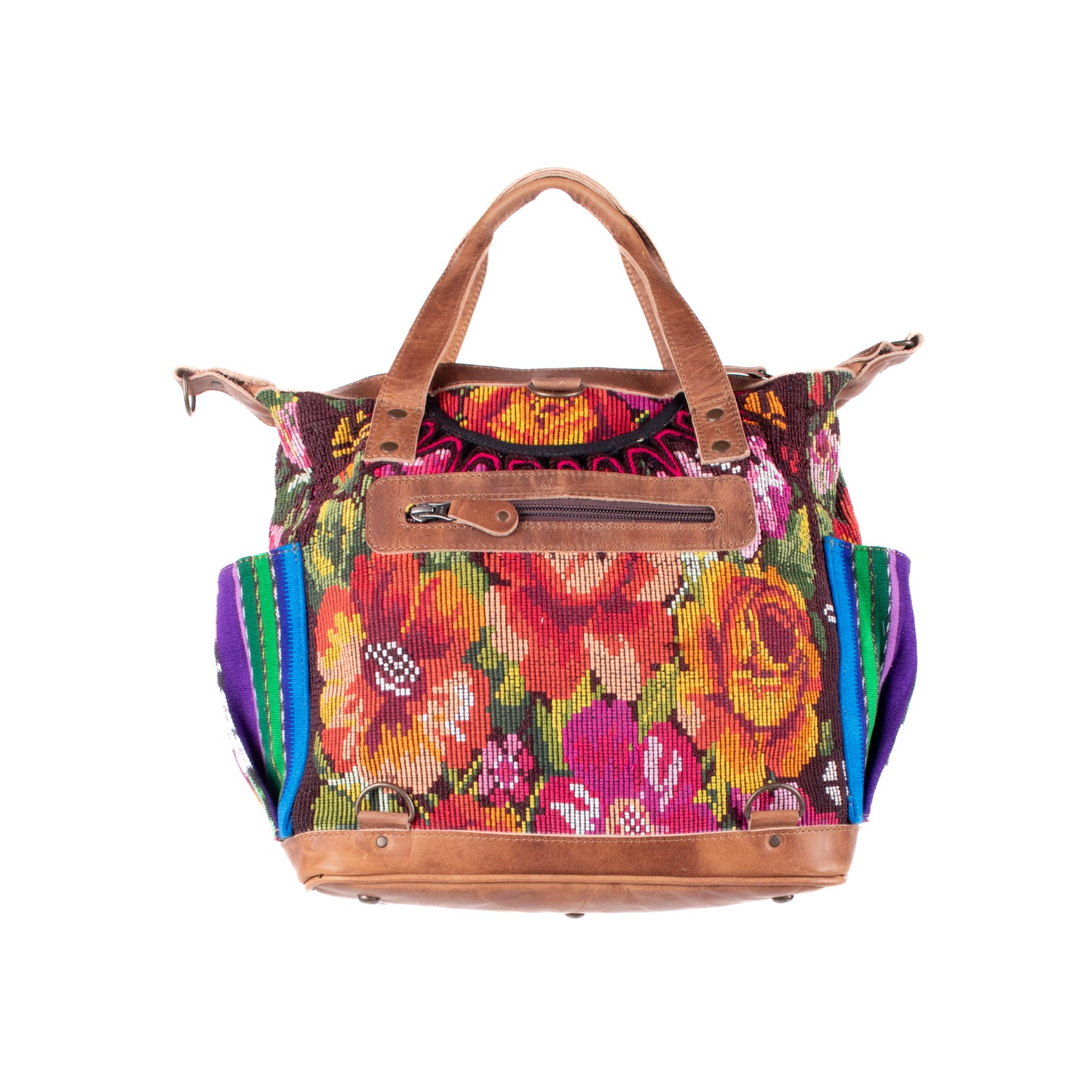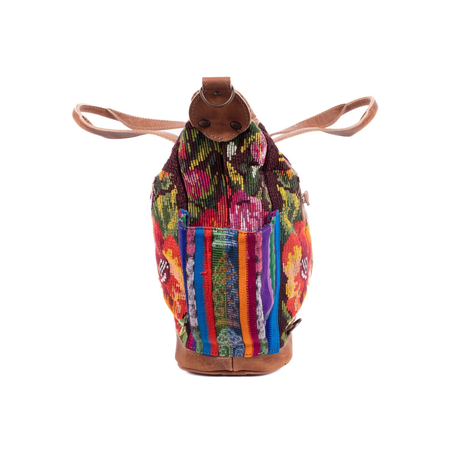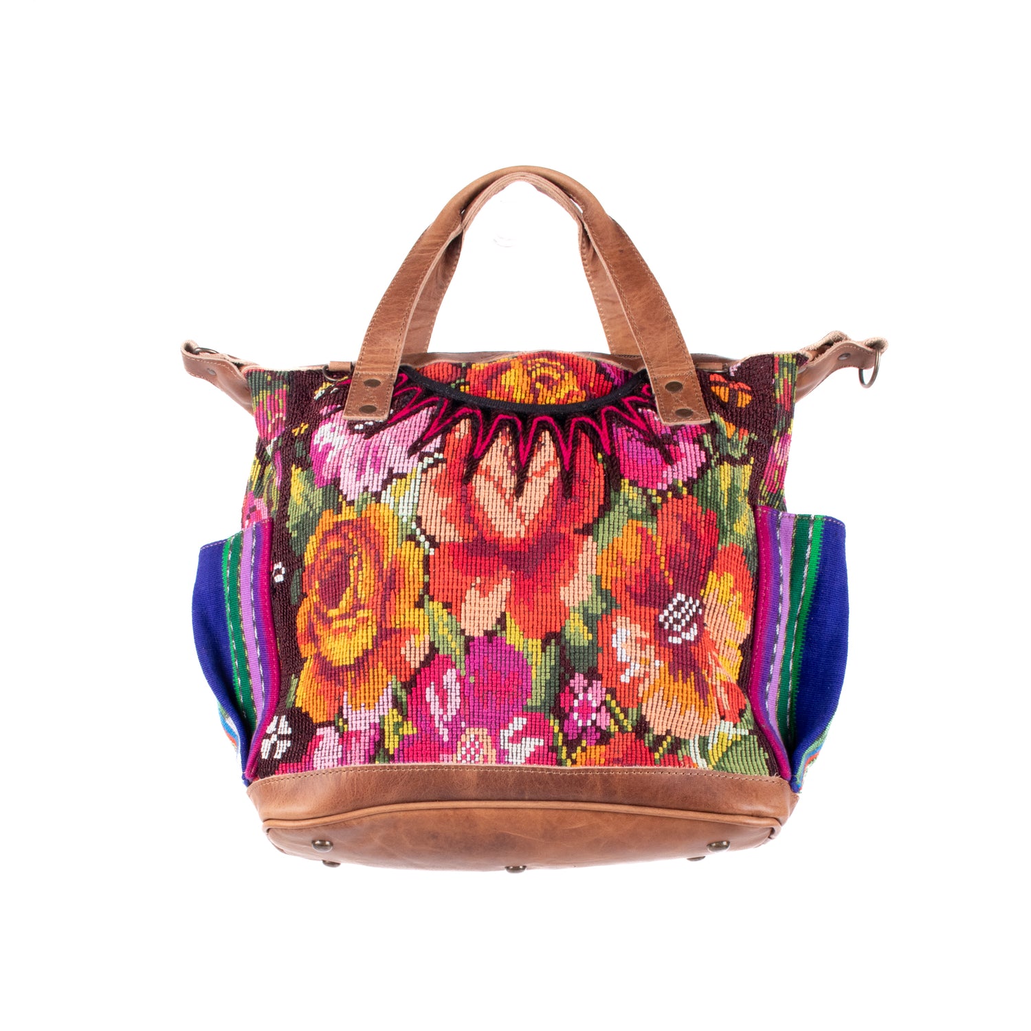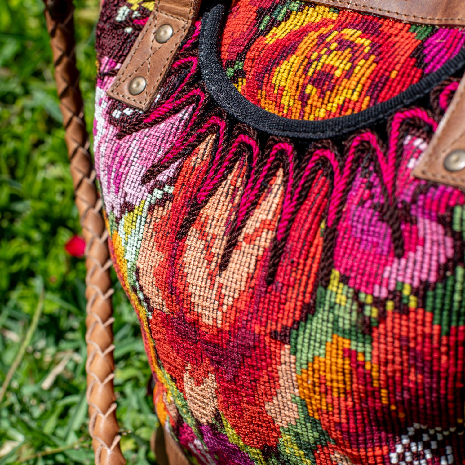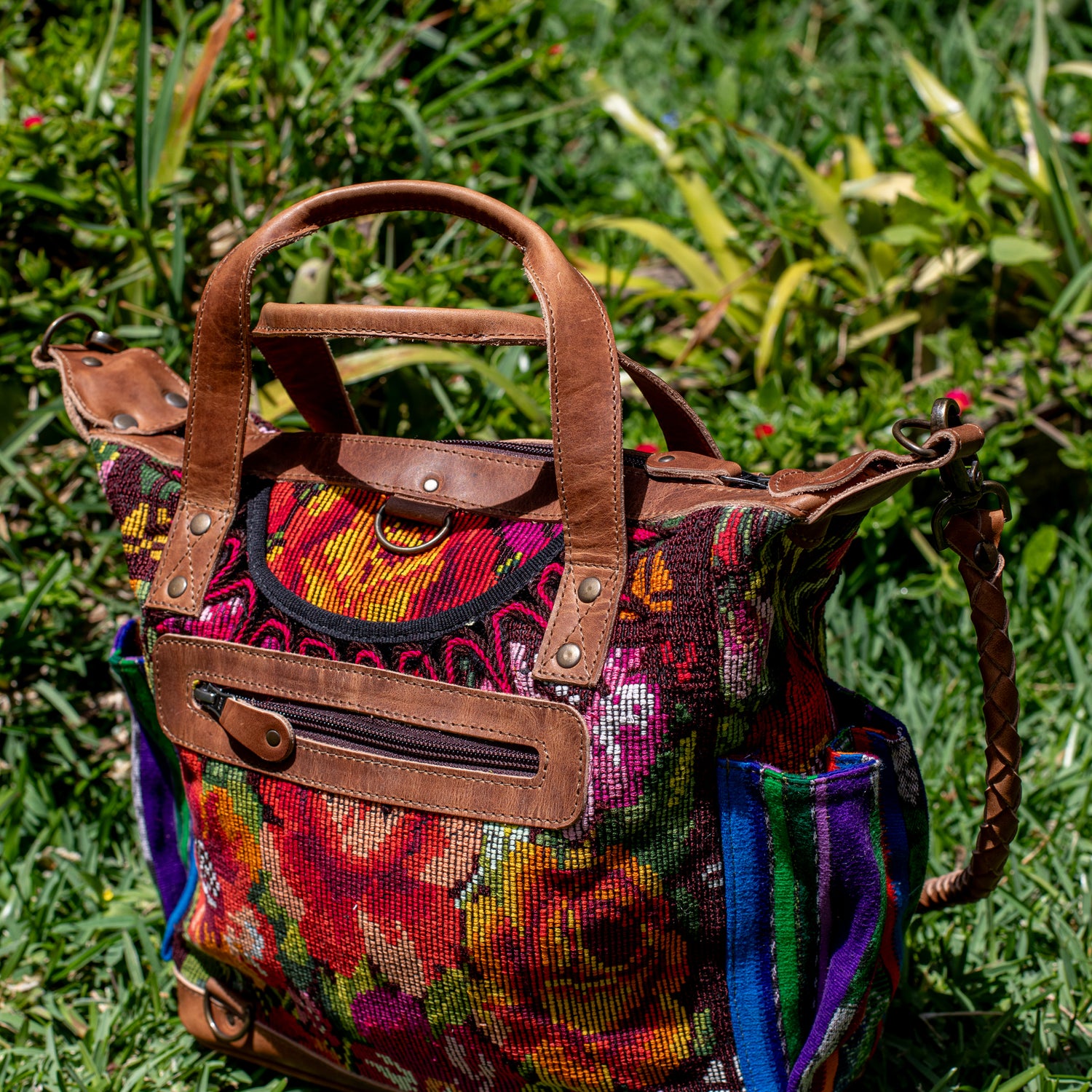 Many unique Maya symbols can be found in our One of a Kind Collection. The fabric we use for this collection is made from upcycled vintage huipiles (traditional attire worn by women in Guatemala) that were handwoven by Artisans up to 10 years ago, and they have lived a full life before being incorporated into your leather bag!