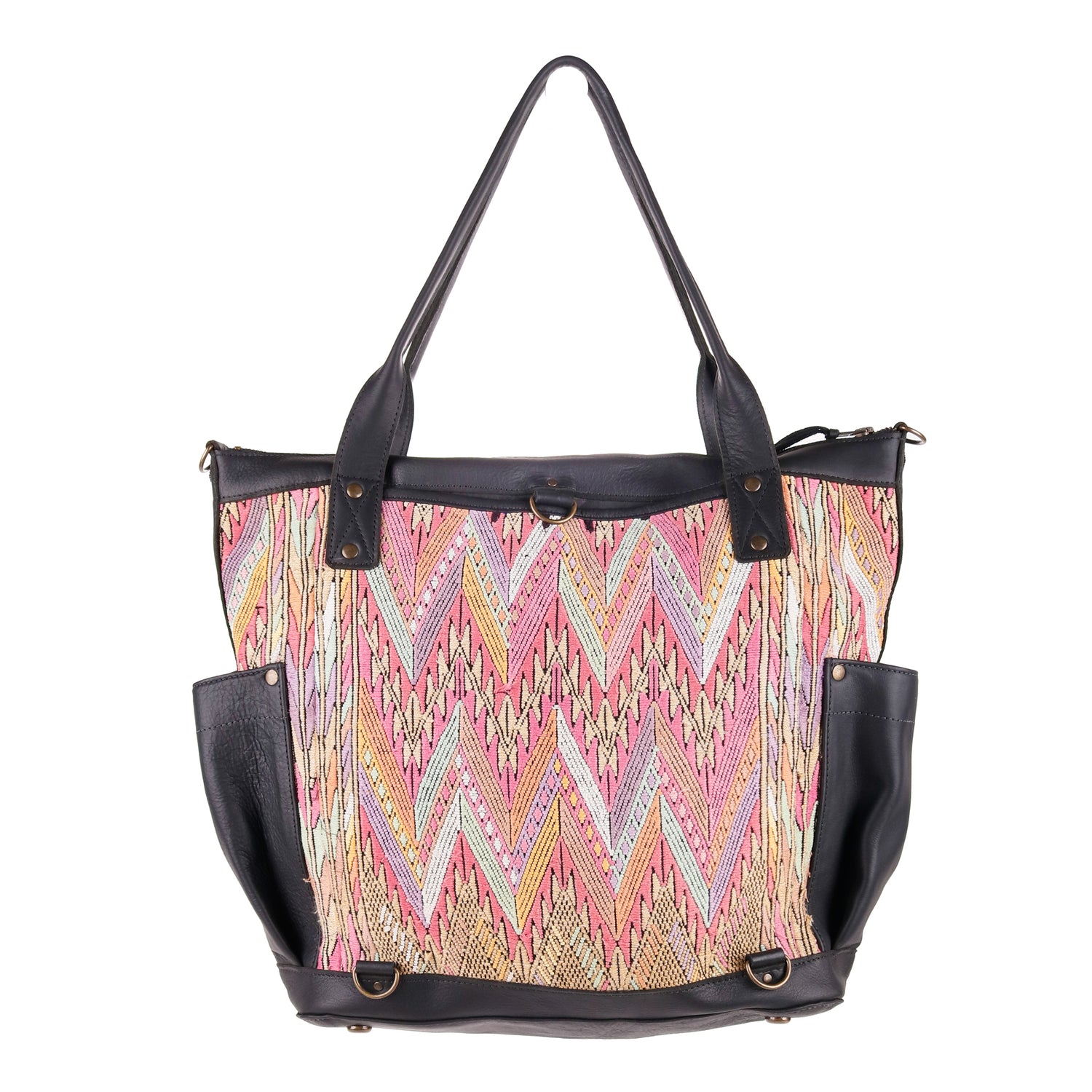 Many unique Maya symbols can be found in our One of a Kind Collection. The fabric we use for this collection is made from upcycled vintage huipiles (traditional attire worn by women in Guatemala) that were handwoven by Artisans up to 10 years ago, and they have lived a full life before being incorporated into your leather bag!