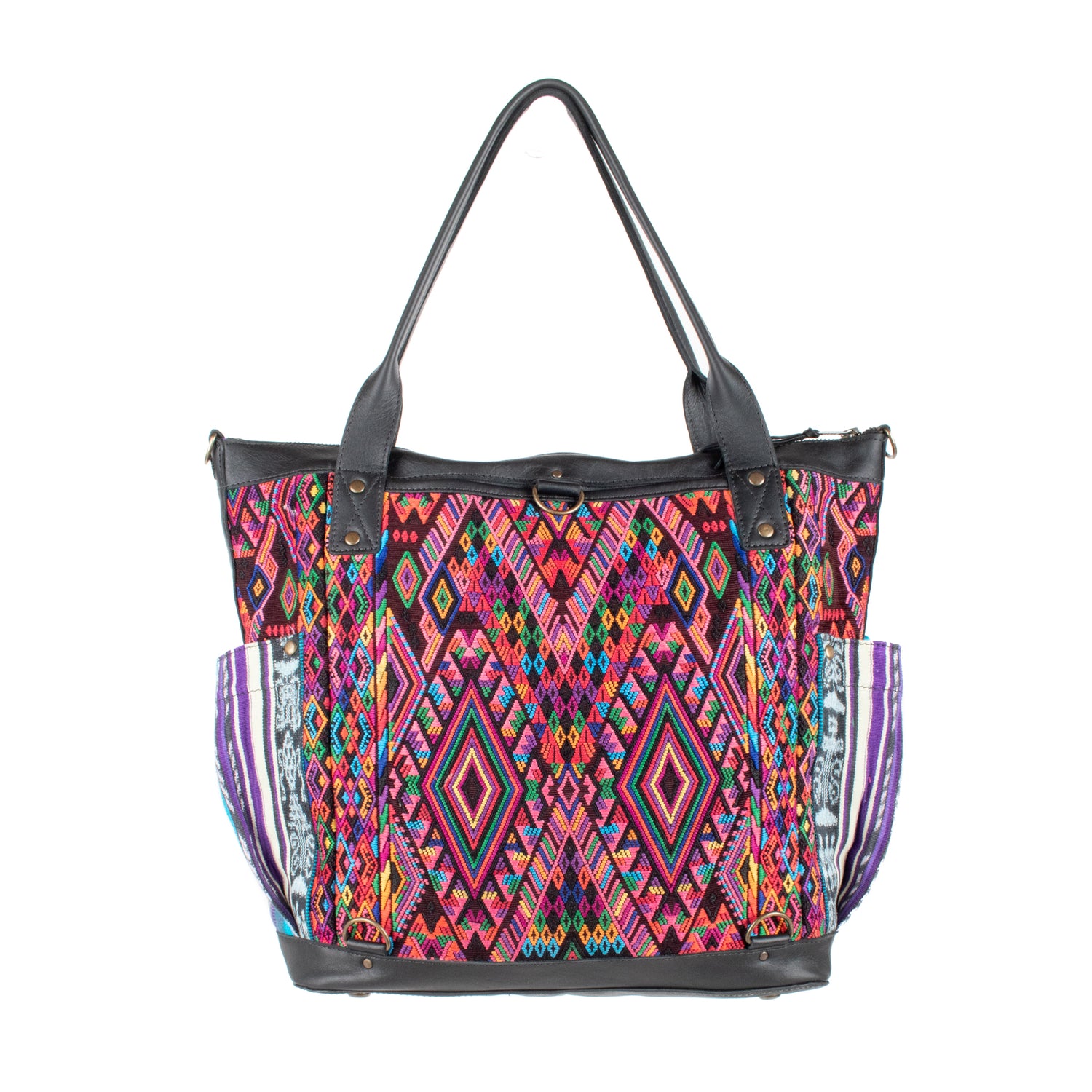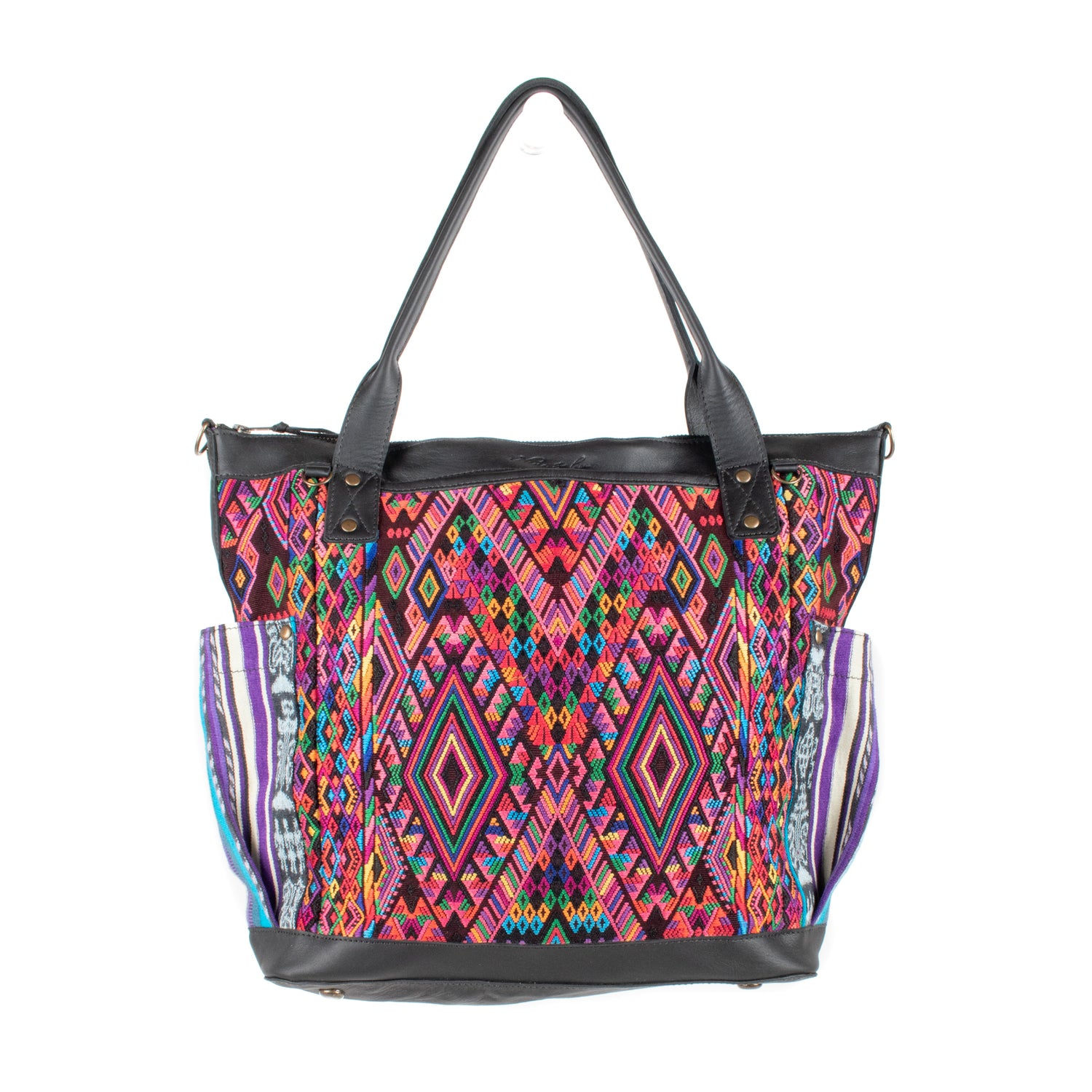 Many unique Maya symbols can be found in our One of a Kind Collection. The fabric we use for this collection is made from upcycled vintage huipiles (traditional attire worn by women in Guatemala) that were handwoven by Artisans up to 10 years ago, and they have lived a full life before being incorporated into your leather bag!
