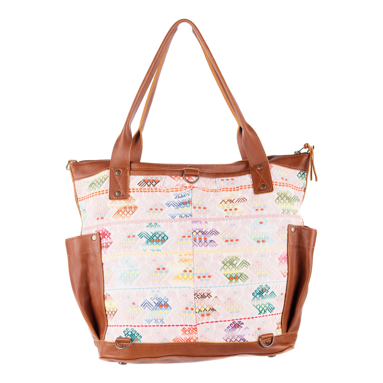 Many unique Maya symbols can be found in our One of a Kind Collection. The fabric we use for this collection is made from upcycled vintage huipiles (traditional attire worn by women in Guatemala) that were handwoven by Artisans up to 10 years ago, and they have lived a full life before being incorporated into your leather bag!