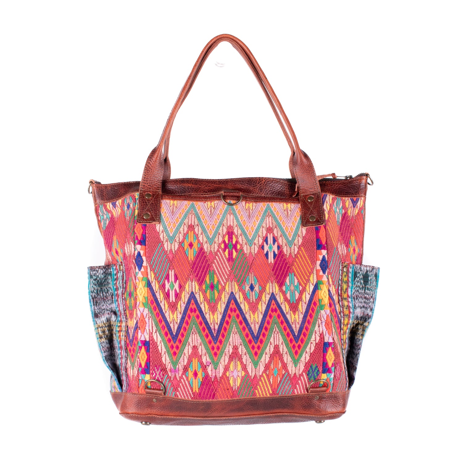 Many unique Maya symbols can be found in our One of a Kind Collection. The fabric we use for this collection is made from upcycled vintage huipiles (traditional attire worn by women in Guatemala) that were handwoven by Artisans up to 10 years ago, and they have lived a full life before being incorporated into your leather bag!