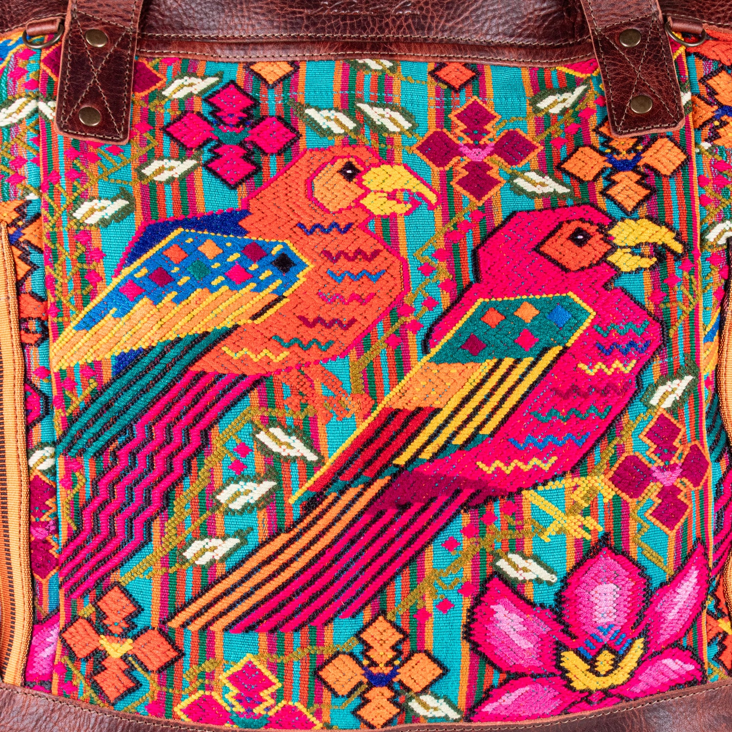 Many unique Maya symbols can be found in our One of a Kind Collection. The fabric we use for this collection is made from upcycled vintage huipiles (traditional attire worn by women in Guatemala) that were handwoven by Artisans up to 10 years ago, and they have lived a full life before being incorporated into your leather bag!