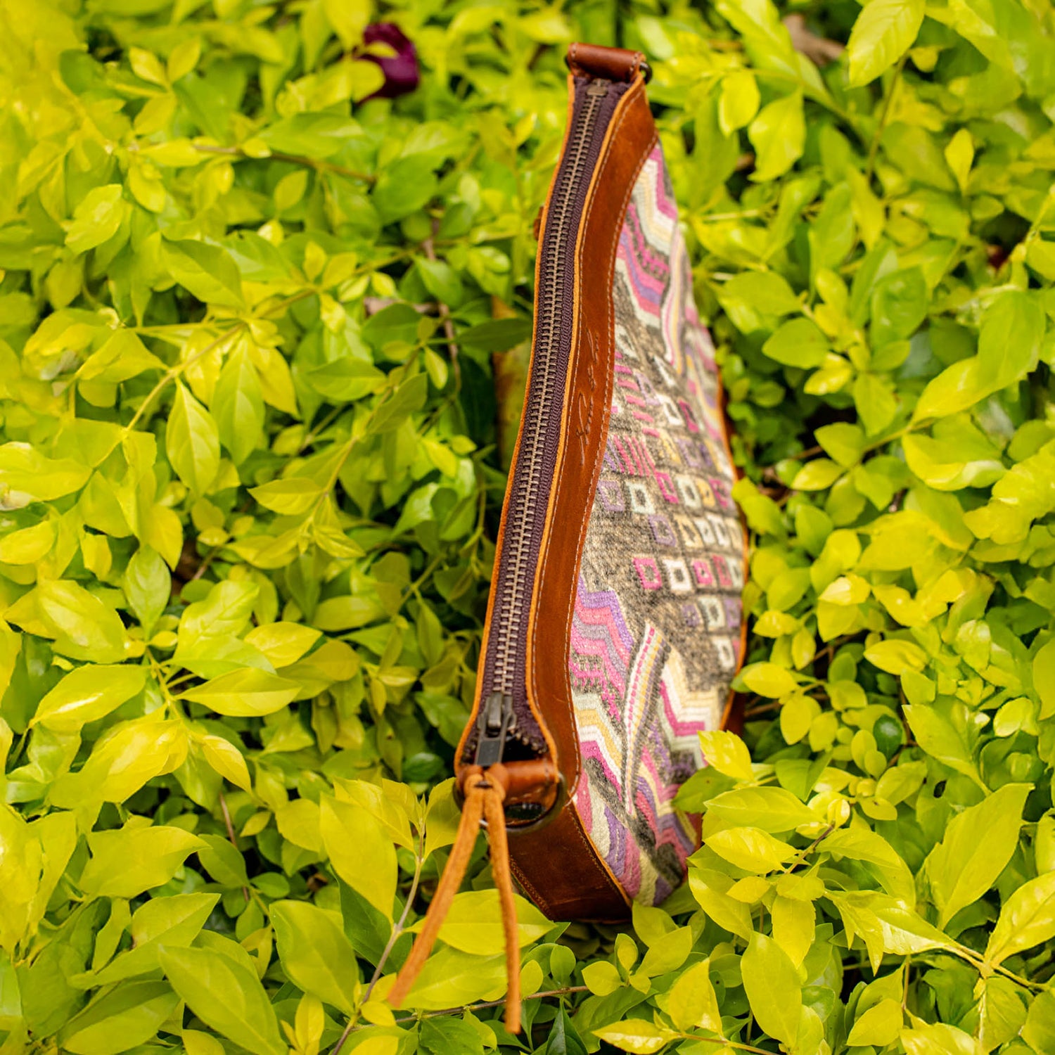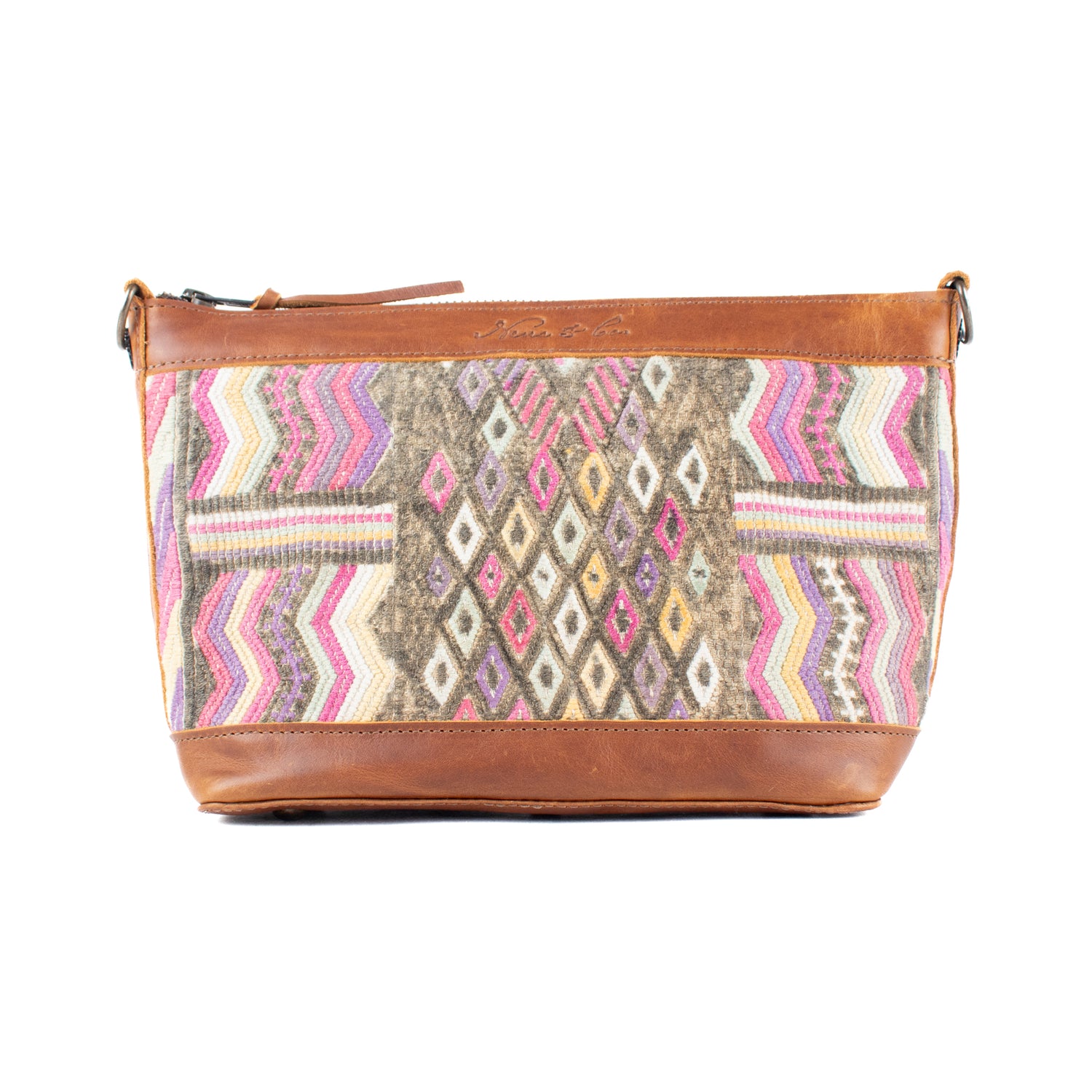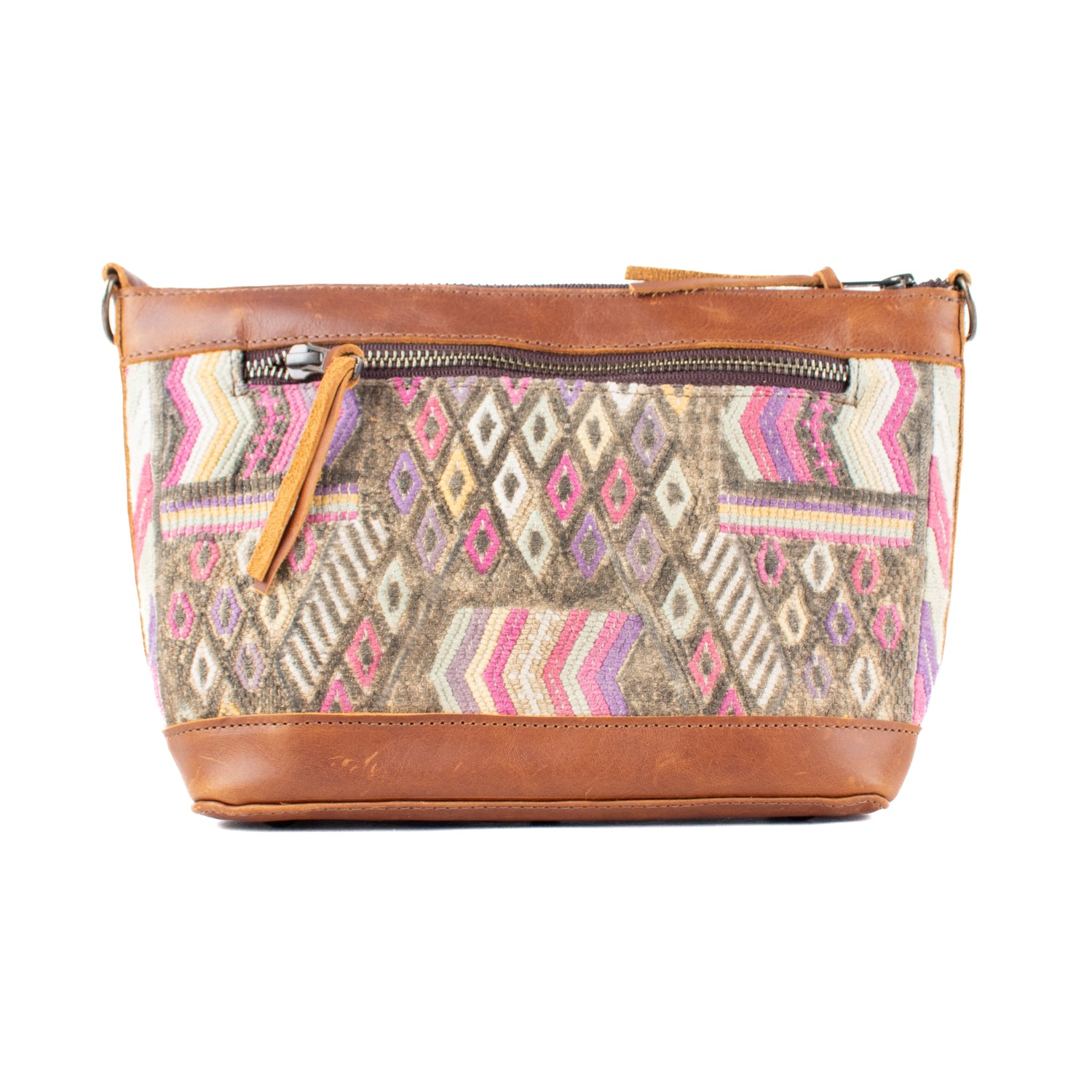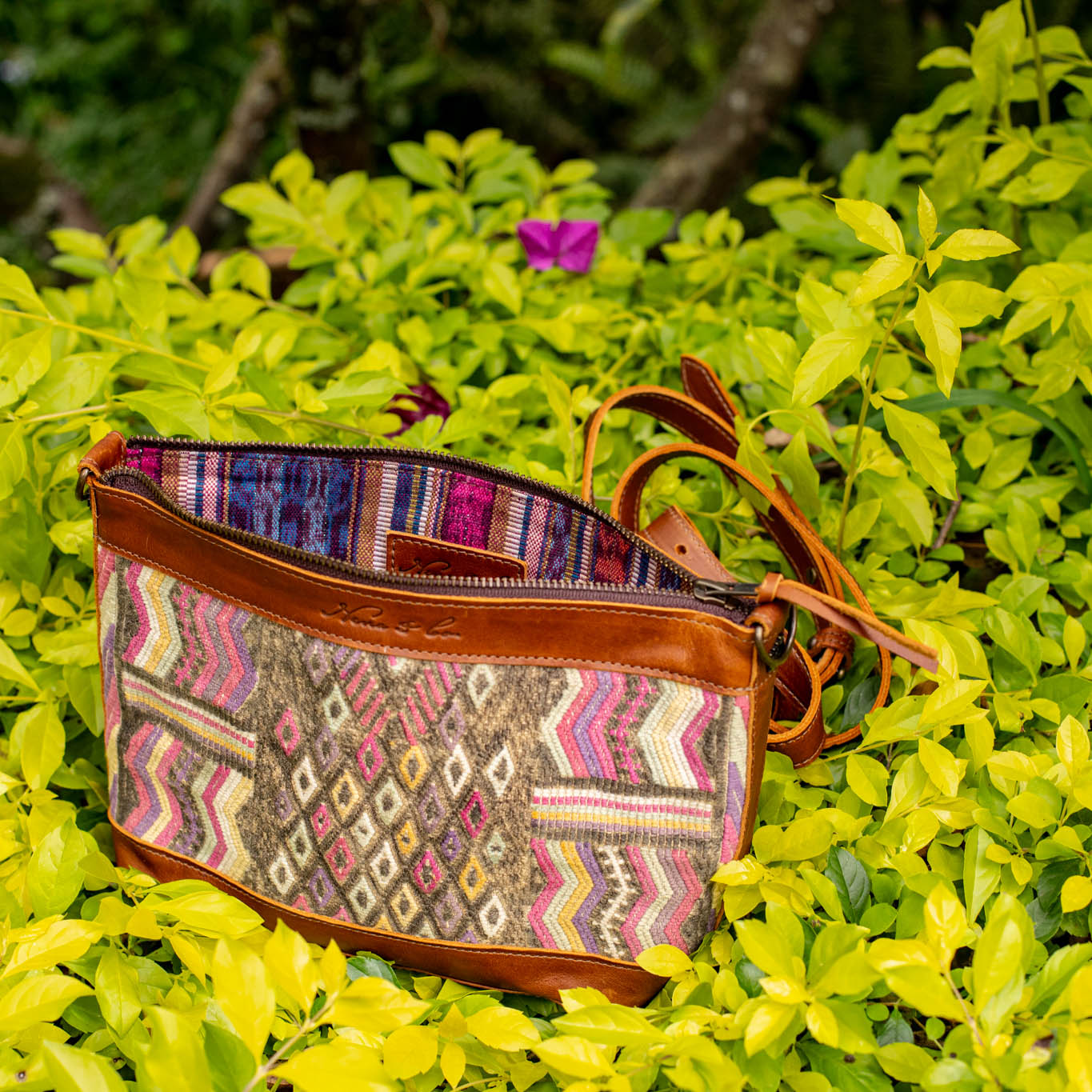 Many unique Maya symbols can be found in our One of a Kind Collection. The fabric we use for this collection is made from upcycled vintage huipiles (traditional attire worn by women in Guatemala) that were handwoven by Artisans up to 10 years ago, and they have lived a full life before being incorporated into your leather bag!