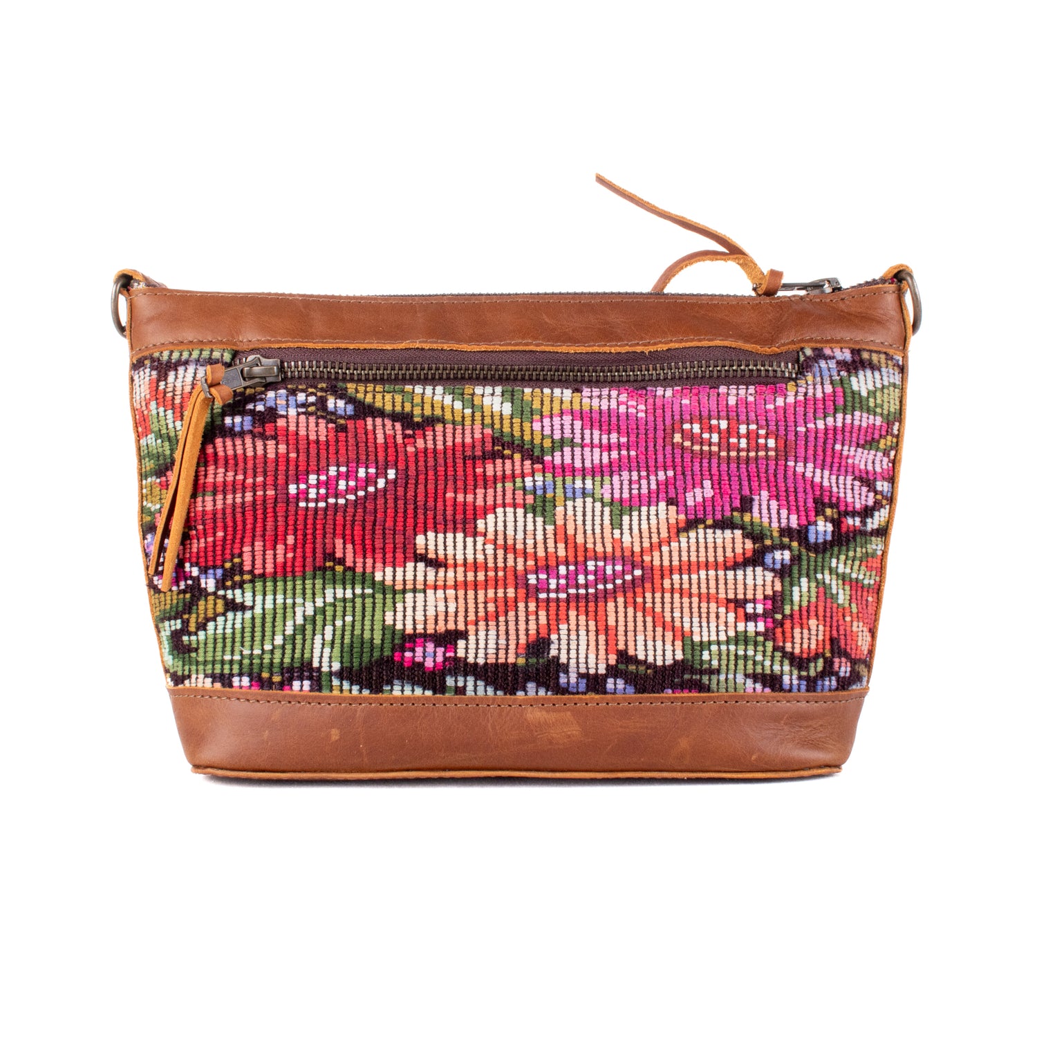 Many unique Maya symbols can be found in our One of a Kind Collection. The fabric we use for this collection is made from upcycled vintage huipiles (traditional attire worn by women in Guatemala) that were handwoven by Artisans up to 10 years ago, and they have lived a full life before being incorporated into your leather bag!