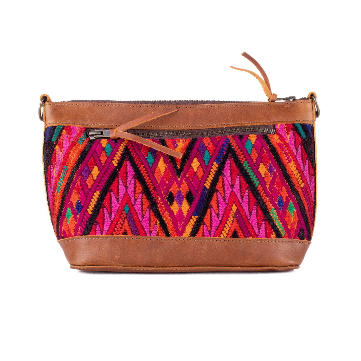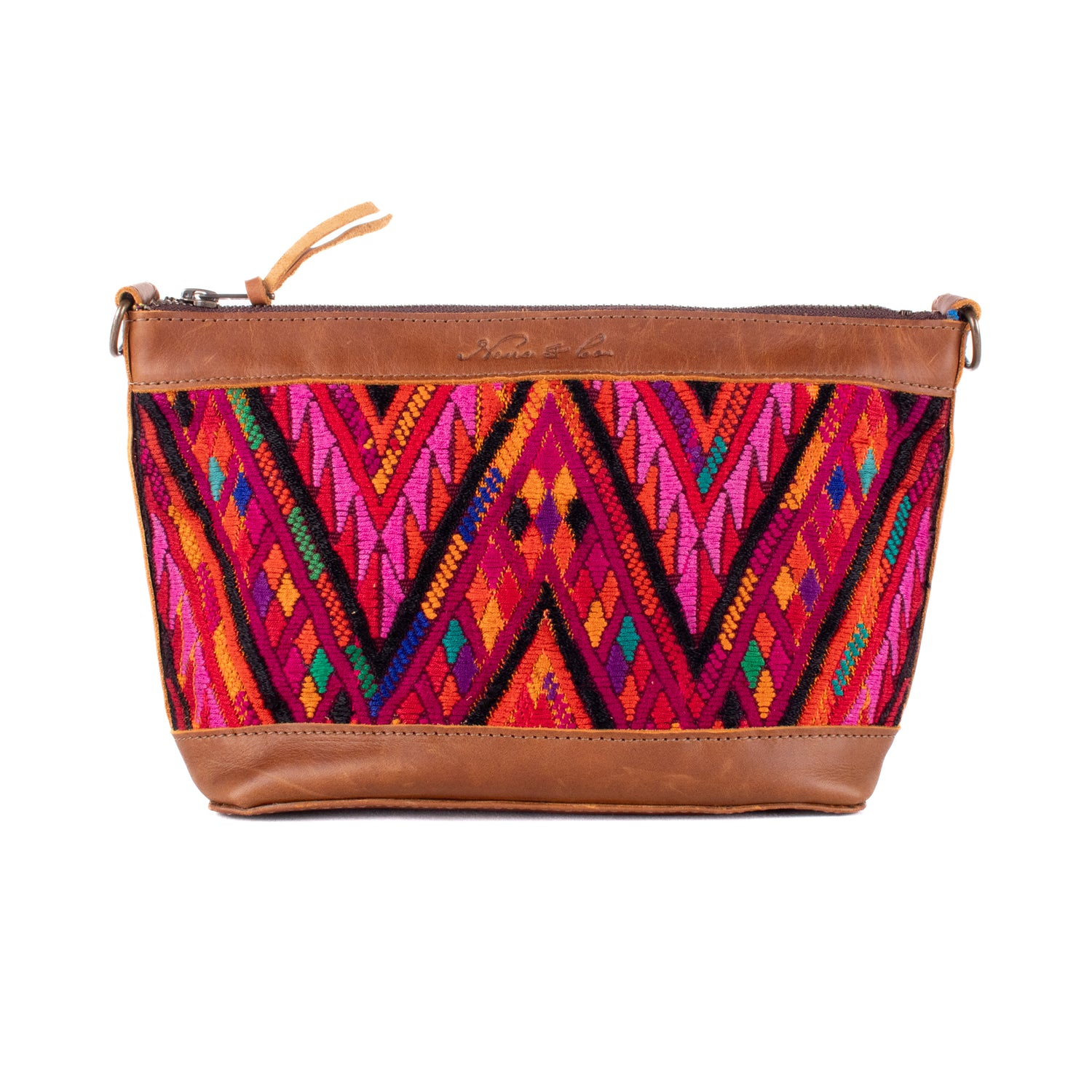 Many unique Maya symbols can be found in our One of a Kind Collection. The fabric we use for this collection is made from upcycled vintage huipiles (traditional attire worn by women in Guatemala) that were handwoven by Artisans up to 10 years ago, and they have lived a full life before being incorporated into your leather bag!