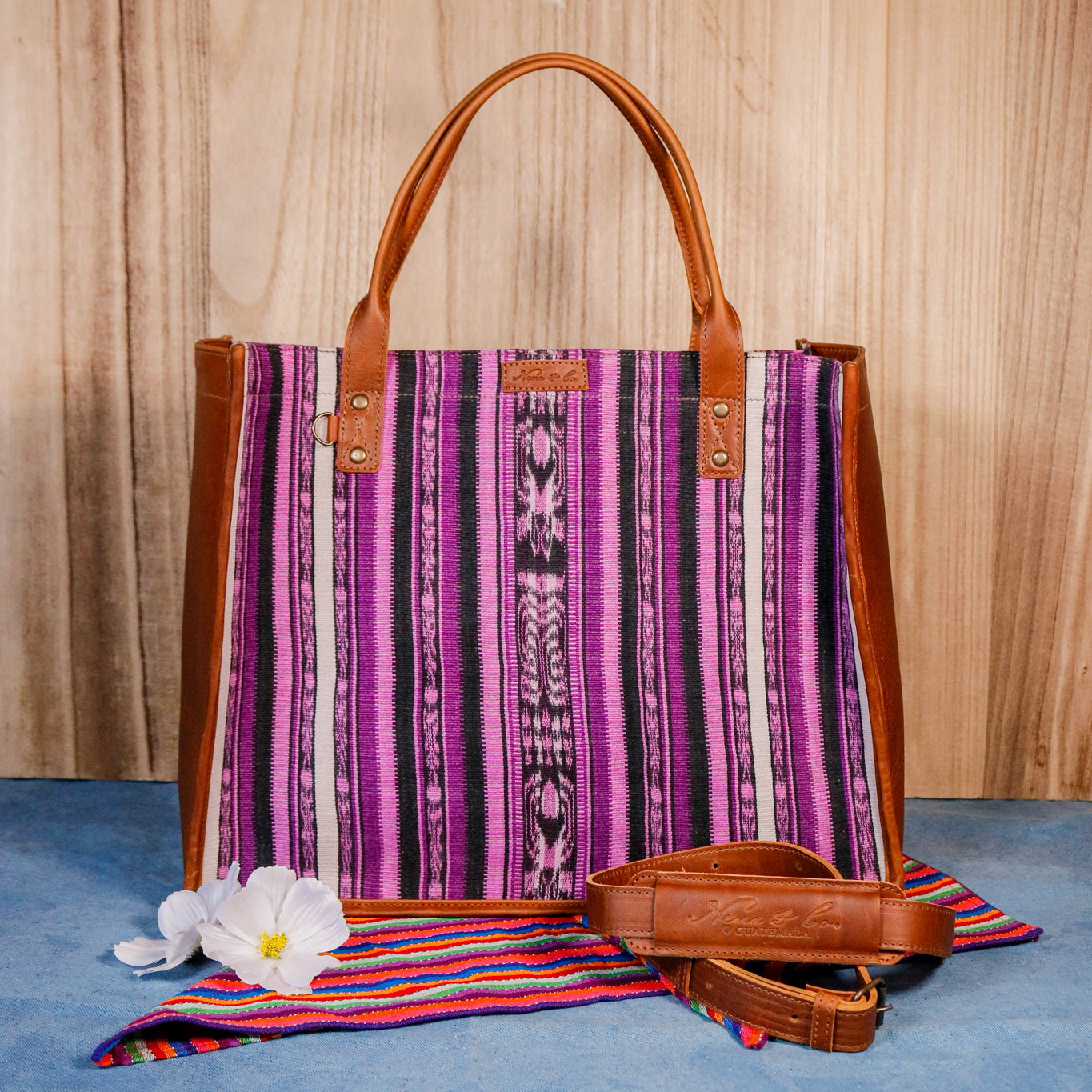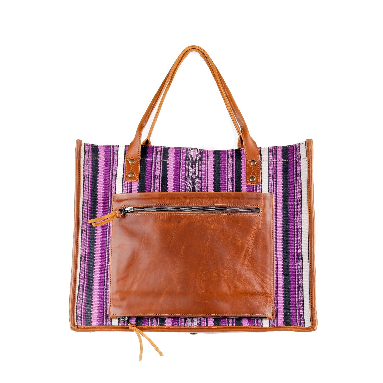 Many unique Maya symbols can be found in our One of a Kind Collection. The fabric we use for this collection is made from upcycled vintage huipiles (traditional attire worn by women in Guatemala) that were handwoven by Artisans up to 10 years ago, and they have lived a full life before being incorporated into your leather bag!