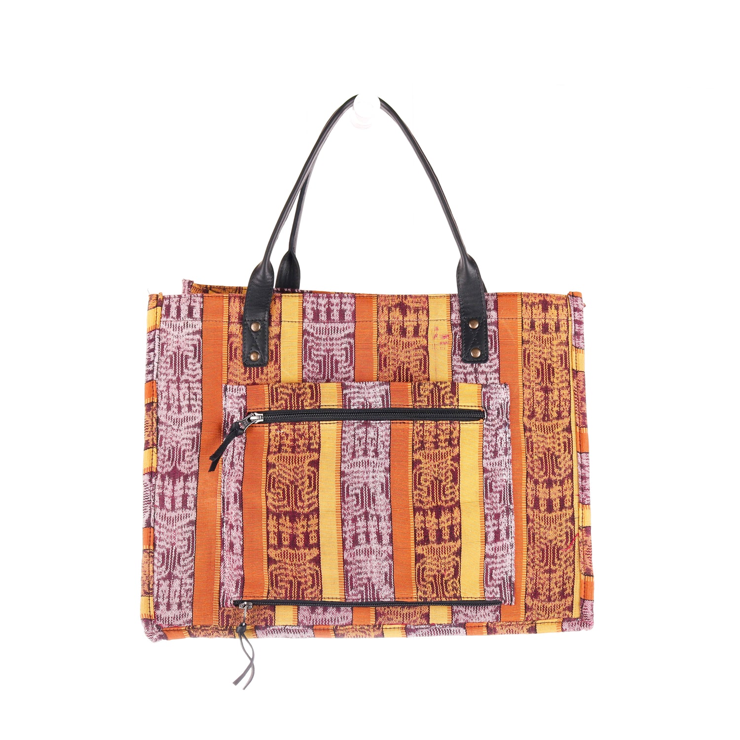 Many unique Maya symbols can be found in our One of a Kind Collection. The fabric we use for this collection is made from upcycled vintage huipiles (traditional attire worn by women in Guatemala) that were handwoven by Artisans up to 10 years ago, and they have lived a full life before being incorporated into your leather bag!