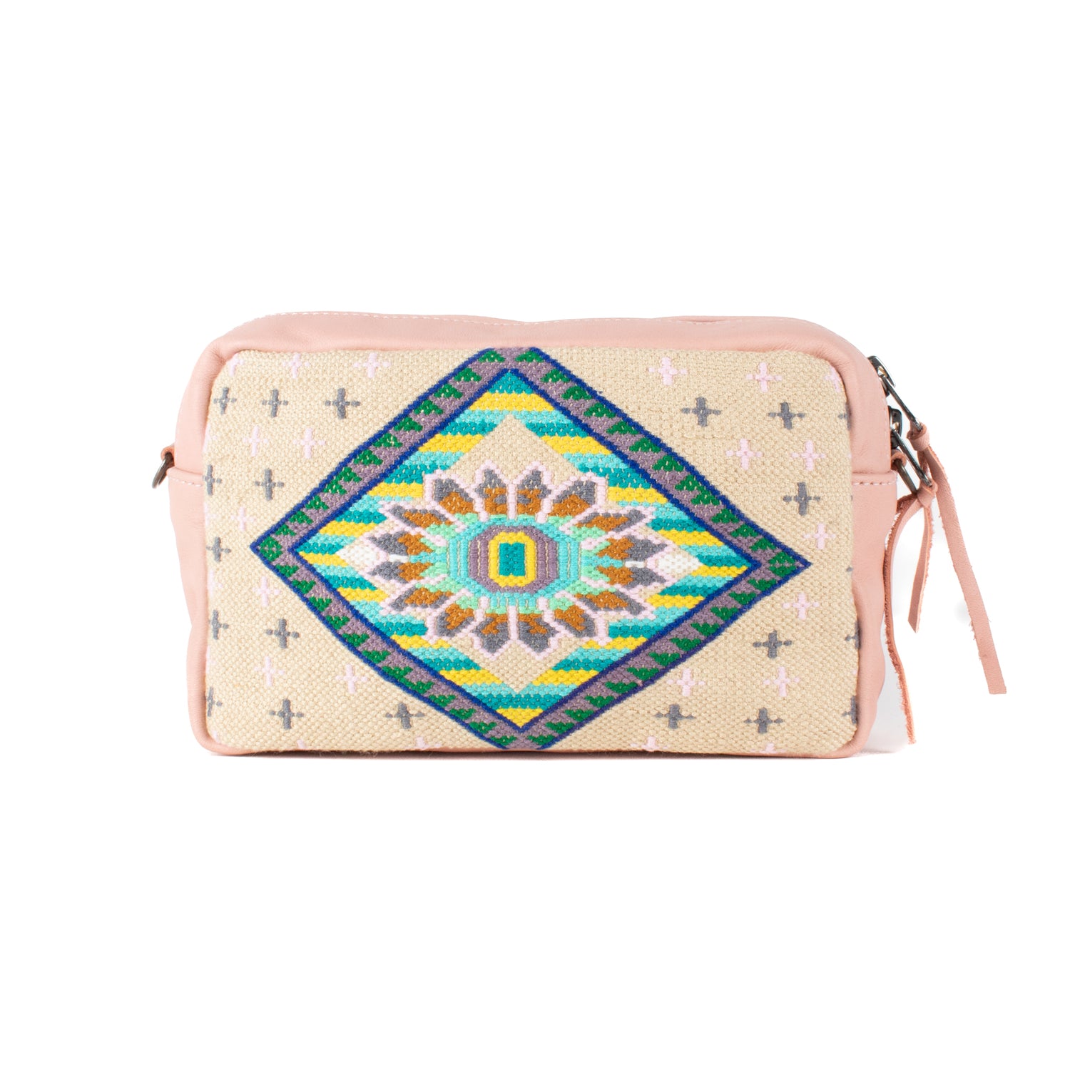 Many unique Maya symbols can be found in our One of a Kind Collection. The fabric we use for this collection is made from upcycled vintage huipiles (traditional attire worn by women in Guatemala) that were handwoven by Artisans up to 10 years ago, and they have lived a full life before being incorporated into your leather bag!