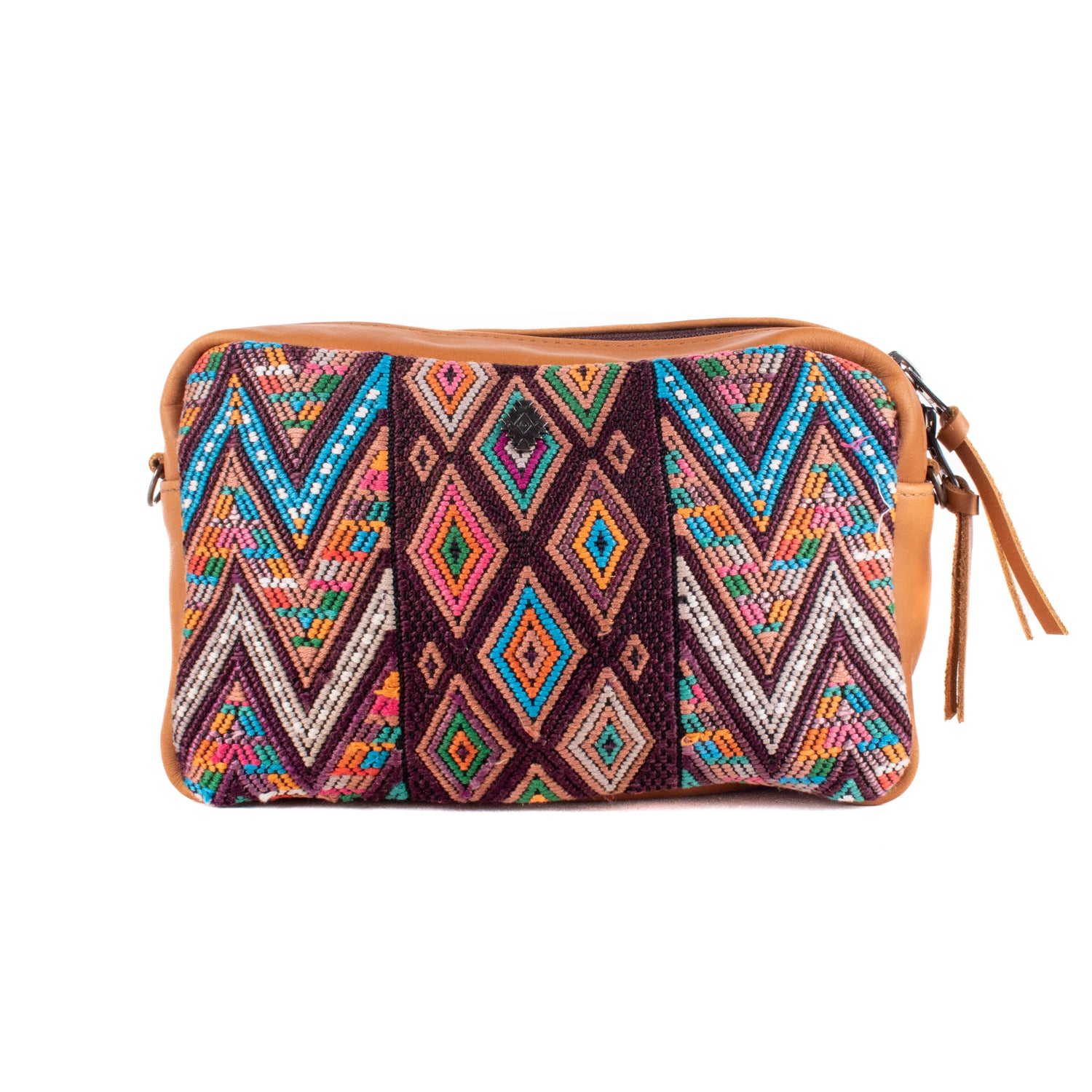 Many unique Maya symbols can be found in our One of a Kind Collection. The fabric we use for this collection is made from upcycled vintage huipiles (traditional attire worn by women in Guatemala) that were handwoven by Artisans up to 10 years ago, and they have lived a full life before being incorporated into your leather bag!