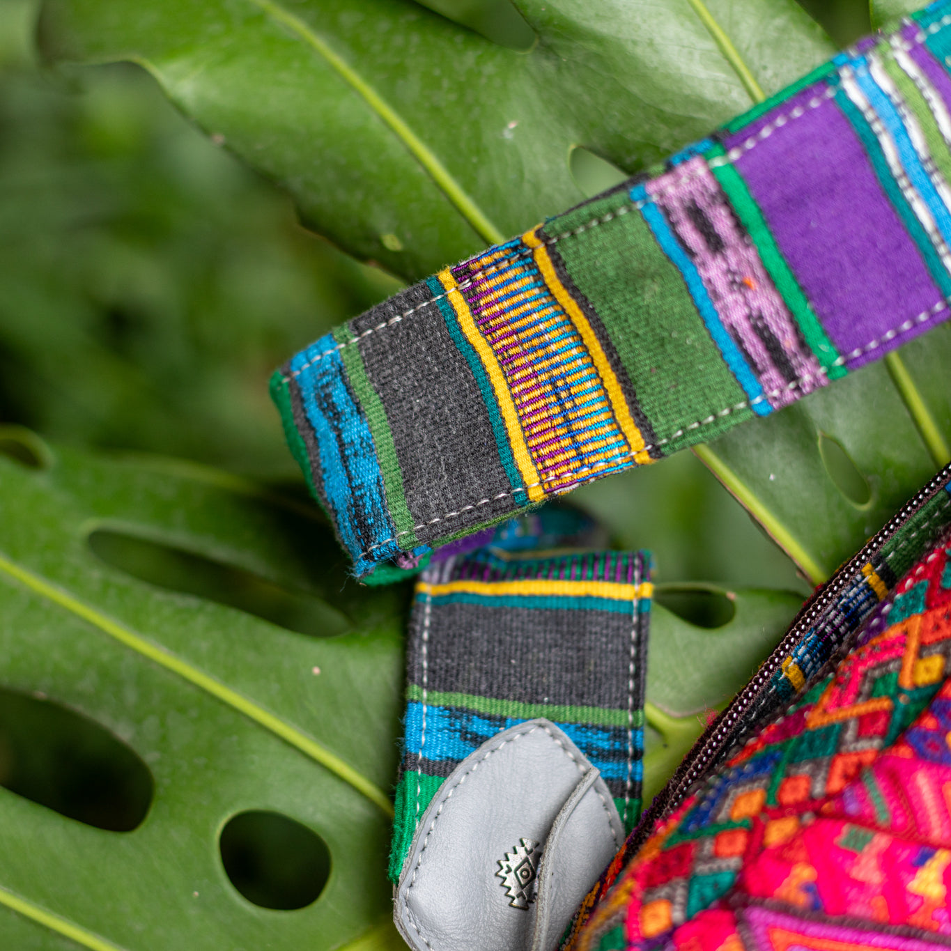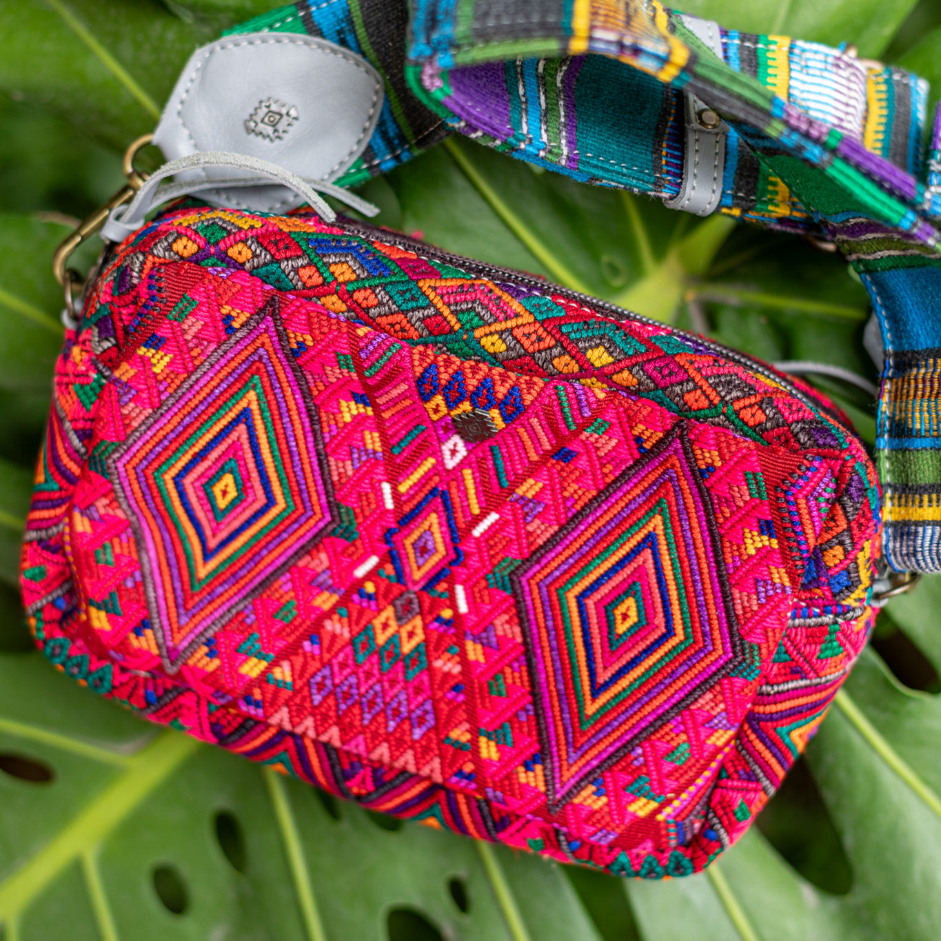 Many unique Maya symbols can be found in our One of a Kind Collection. The fabric we use for this collection is made from upcycled vintage huipiles (traditional attire worn by women in Guatemala) that were handwoven by Artisans up to 10 years ago, and they have lived a full life before being incorporated into your leather bag!