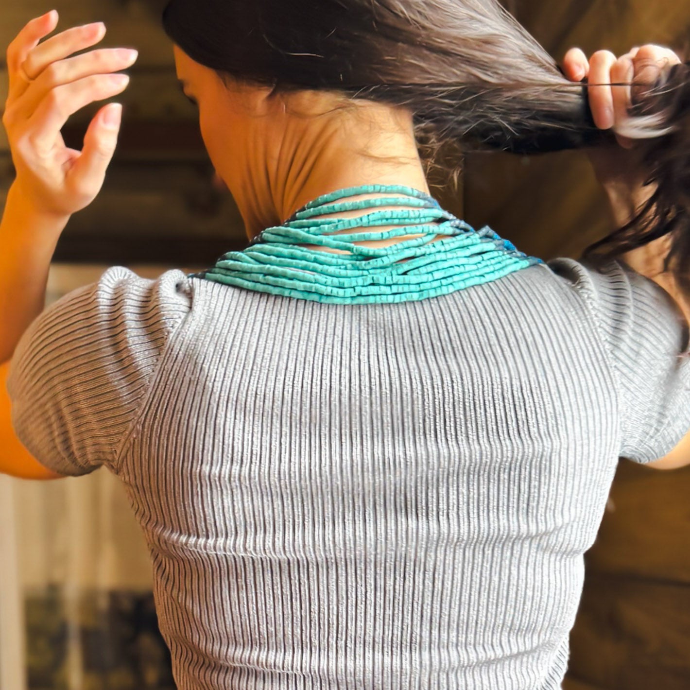 Artisan crafted breastplate with traditionally made ceramic beads, vintage textile and jade details.